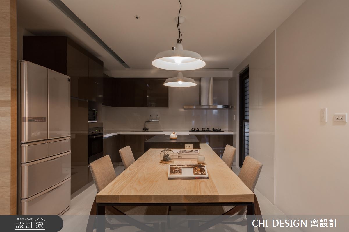 餐廚區的冰箱、電器設備與流理臺切齊,而餐桌、中島、L型廚房接續鋪排成一直線,形成便利的回字動線,1人使用寬敞舒適,來客數較多也不怕窄小擁擠。