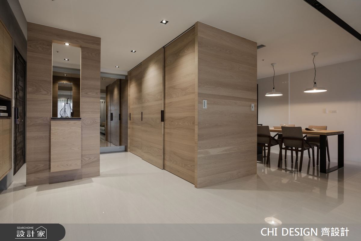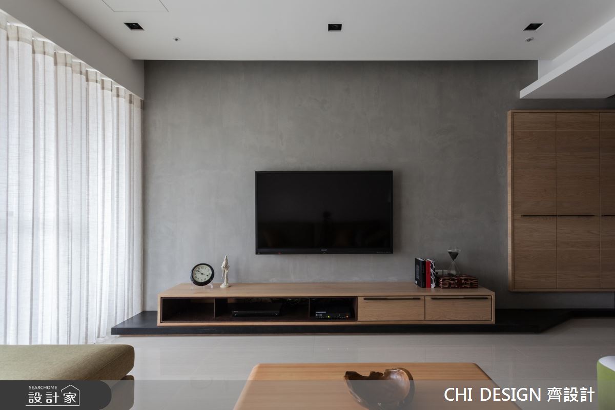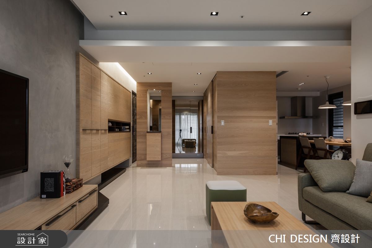 玄關造型屏風象徵性化解風水疑慮,也為迎賓入口帶進好採光,整面明鏡的設定便於檢視儀容,具延展與放大效果,而視覺頂端的木質收納櫃,作為格局分界隔間的同時,形塑了更完整的落塵範圍;室內不落地的木質櫃體,滿足屋主大量收納需求,從玄關一路延伸至電視牆的設計,成為串連開放空間的重要角色;地坪選擇能反射光影的拋光磚,為生活帶來層次趣味;清水模電視牆與落地窗相互搭配,則注入一股愜意、減壓氣息,大面積灰調成功創造低彩度空間的視覺焦點,高雅沉穩的灰色系,也隱約透露著單身貴族的好品味。