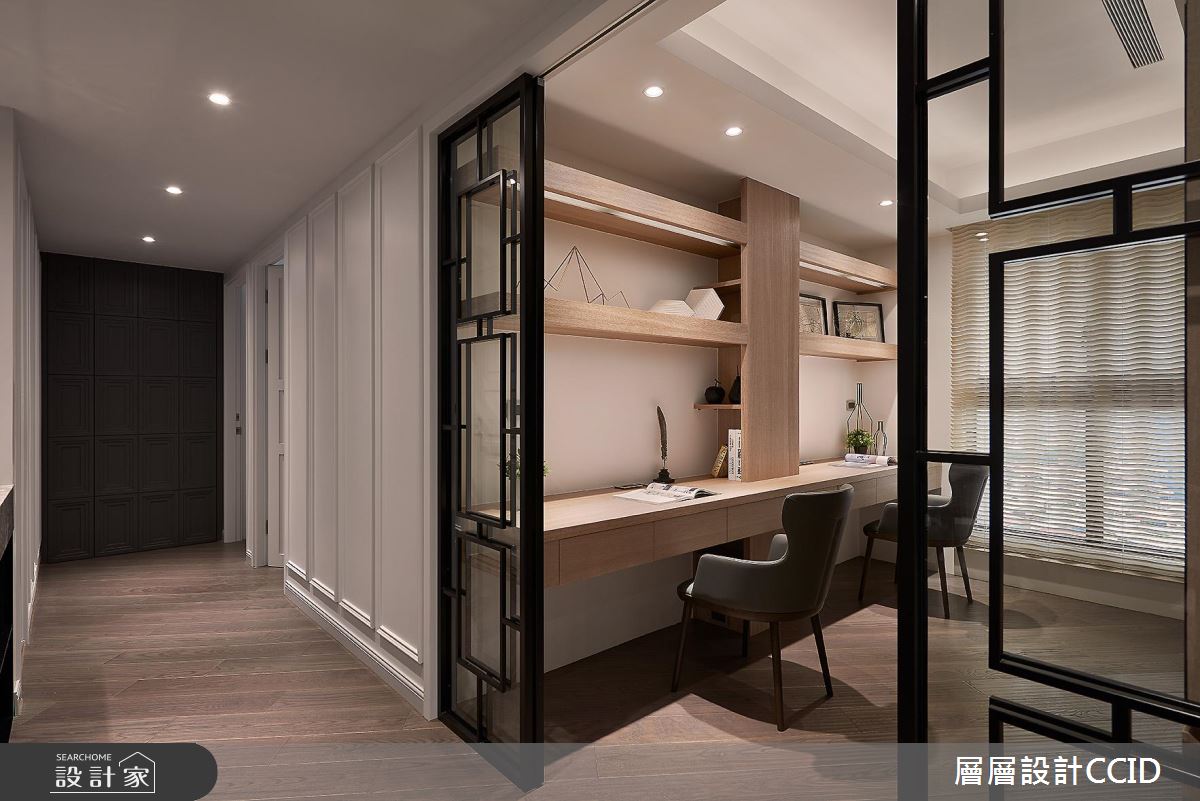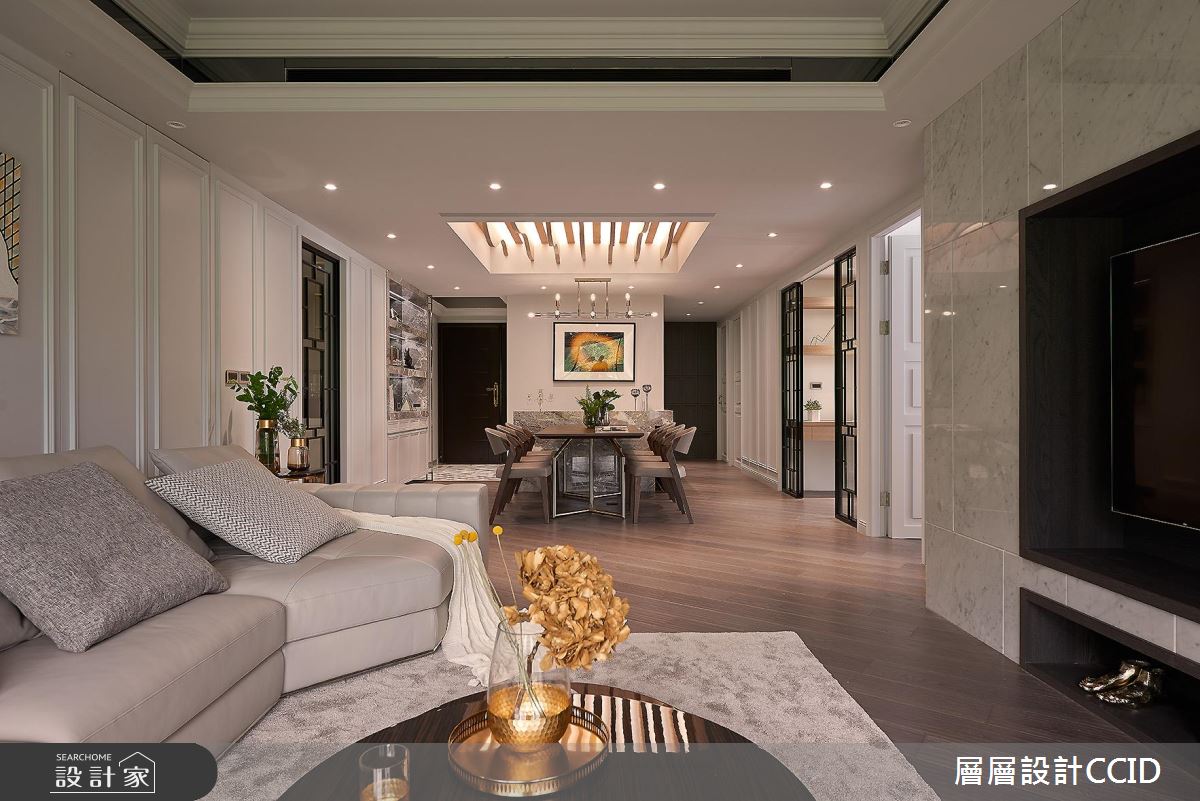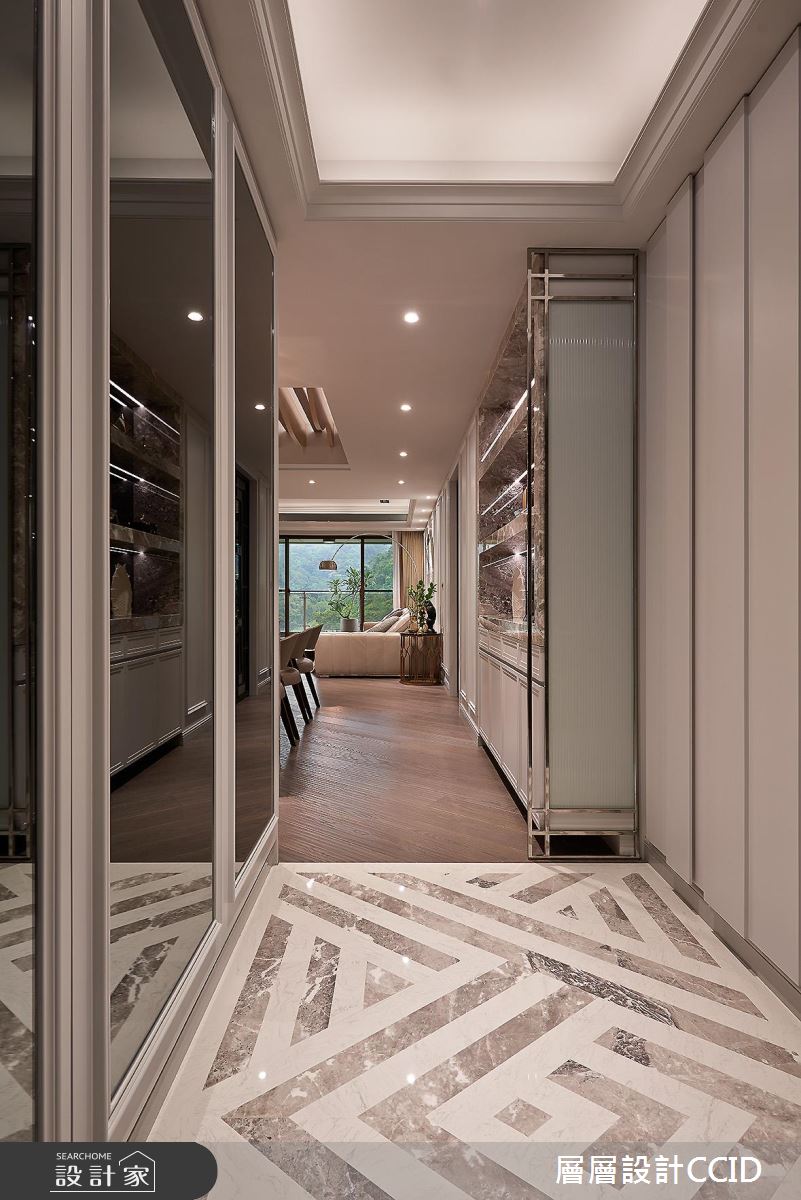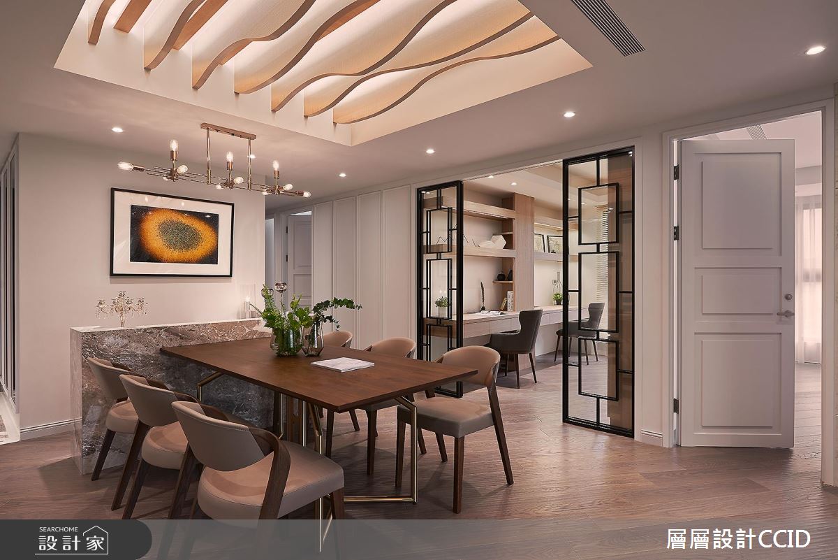 小玄關區,地坪優雅不失大器的花色清楚劃分落塵範圍,收納櫃的灰鏡拉門,開啟精緻奢華開端。室內木地坪以對角斜向鋪排的方式,牽引視覺導向明亮的窗外景致,一進門就愜意舒心。客、餐廳之間屏除隔屏,巧思讓天花處搶眼設計,框出區域範圍;餐廳天花板以流線型木板層次鋪排,與下方大理石吧檯、奢華燈飾輝映成趣;客廳則透過線板的手法呼應立面,傳遞古典優雅氣氛。電視牆的部分,採用深色系木框內崁白色大理石的對比色調,帶出鮮明設計感,牆內的收納品巧妙成為展示佈置一隅,而電視牆與房門的過渡地帶,則利用斜切設計梳理順暢動線。公領域的另外兩個區塊,廚房與書房皆使用玻璃鐵件拉門,保留視覺通透感同時賦予獨立性。三間臥室以柔白為主軸,再分別透過牆面的壁紙、選材,定調臥房主人的氣質與個性。