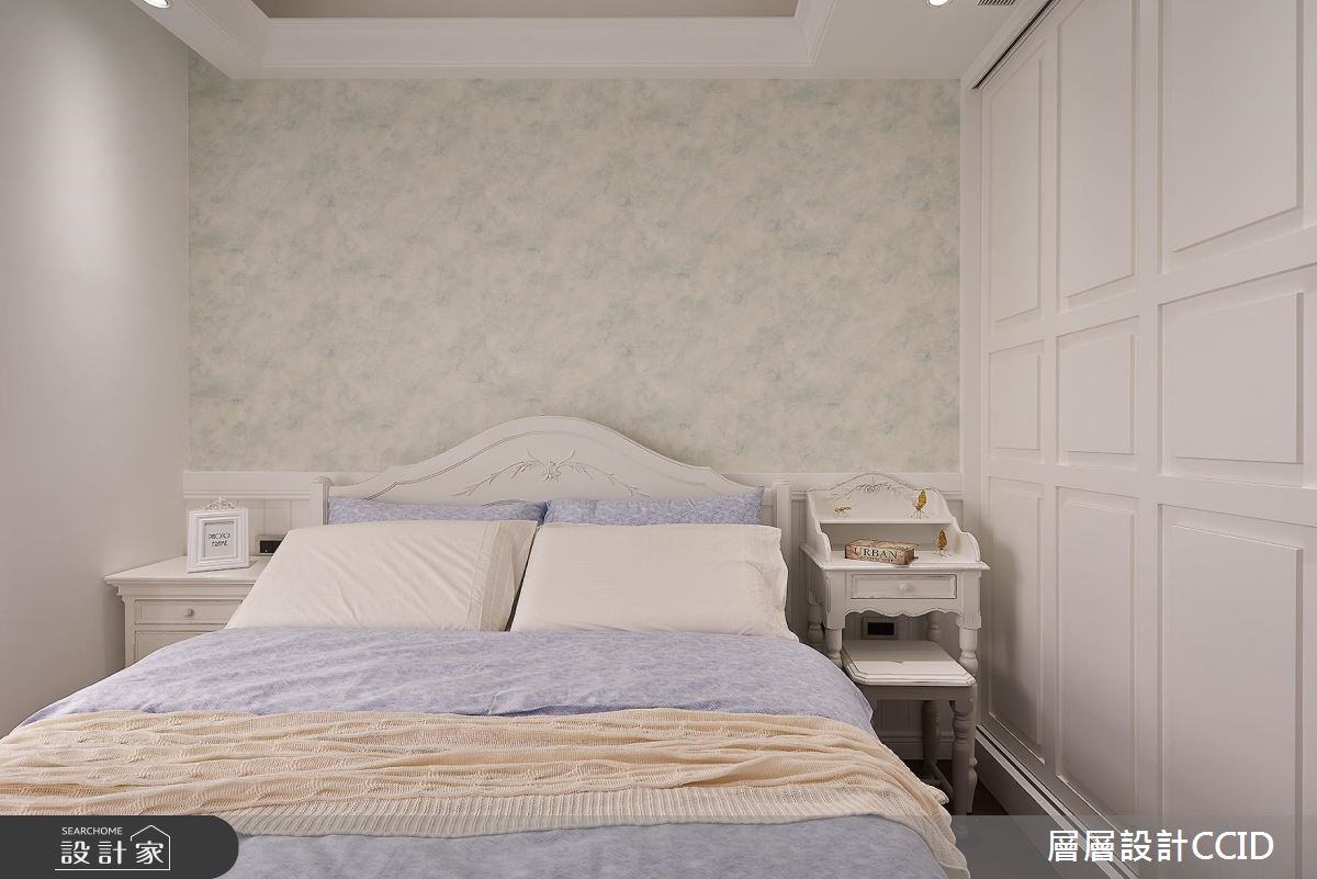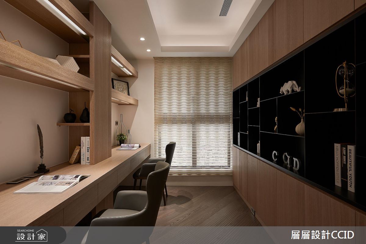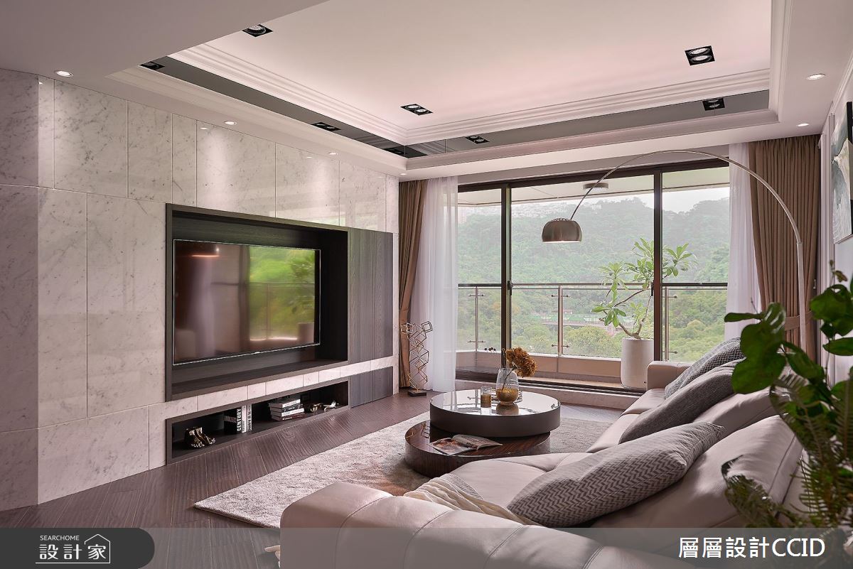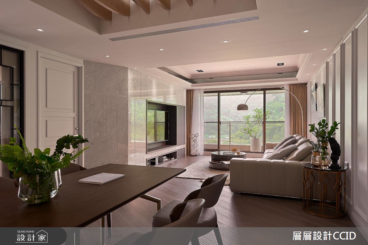 小玄關區,地坪優雅不失大器的花色清楚劃分落塵範圍,收納櫃的灰鏡拉門,開啟精緻奢華開端。室內木地坪以對角斜向鋪排的方式,牽引視覺導向明亮的窗外景致,一進門就愜意舒心。客、餐廳之間屏除隔屏,巧思讓天花處搶眼設計,框出區域範圍;餐廳天花板以流線型木板層次鋪排,與下方大理石吧檯、奢華燈飾輝映成趣;客廳則透過線板的手法呼應立面,傳遞古典優雅氣氛。電視牆的部分,採用深色系木框內崁白色大理石的對比色調,帶出鮮明設計感,牆內的收納品巧妙成為展示佈置一隅,而電視牆與房門的過渡地帶,則利用斜切設計梳理順暢動線。公領域的另外兩個區塊,廚房與書房皆使用玻璃鐵件拉門,保留視覺通透感同時賦予獨立性。三間臥室以柔白為主軸,再分別透過牆面的壁紙、選材,定調臥房主人的氣質與個性。
