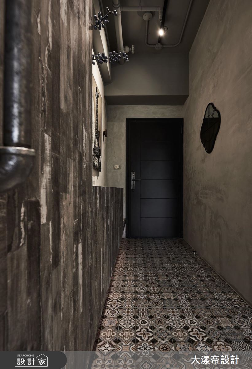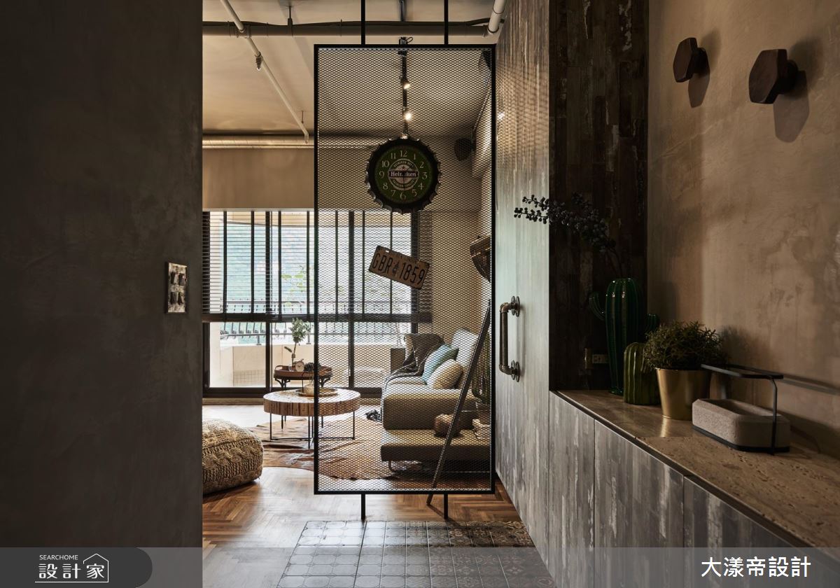 玄關藉由一整條復古花磚鋪排地坪,一進門就令人期待裡頭的模樣,且使用斑駁感的木紋收納櫃和鐵網屏風,界定出格局的範圍。公領域的地板採用實木拼接的方式,提升室內的自然氣質。客廳半高電視牆採取洞石材質,與書房的世界地圖牆面相互呼應,打造粗獷的室內形象。
