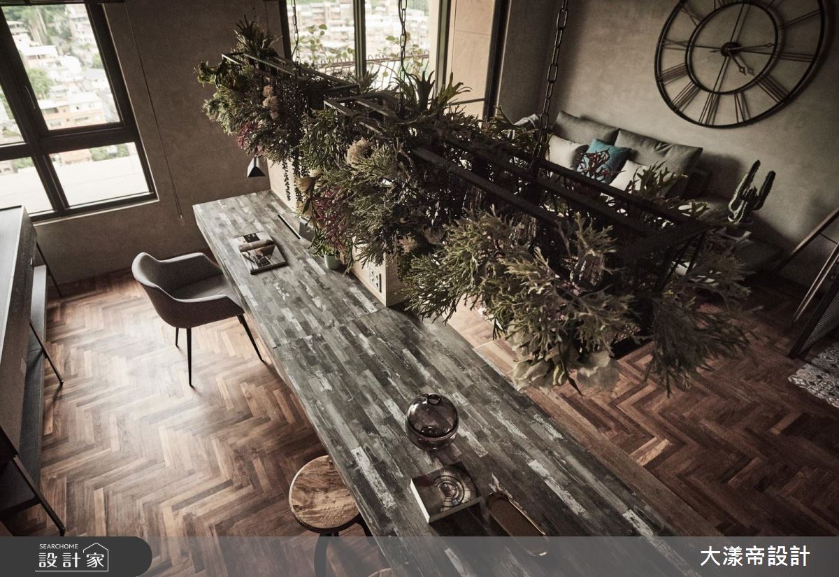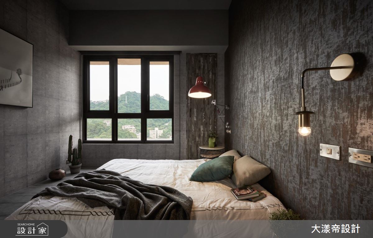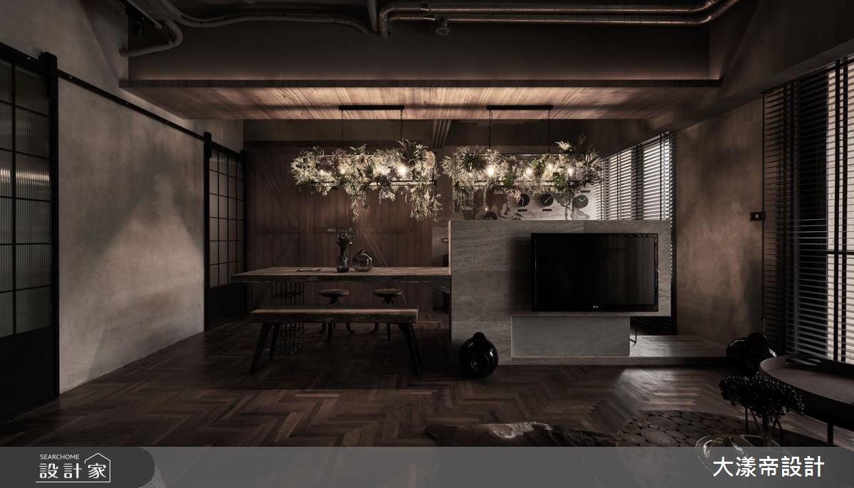 餐桌、書桌和電視牆三者合一,讓空間使用能更有彈性。同時設計師於木紋飾樑之下,懸吊鐵製燈具,並在上面妝點色彩不同的花卉,表現出光影搖動間的特殊風采。主臥透過牆面的仿清水模質感,加上架高地坪的木紋,讓共同的灰色調有不一樣的肌理變化。