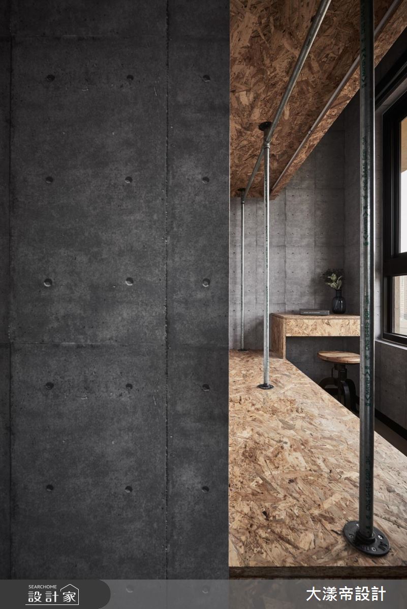 臥室的一隅利用 OSB 板結合 SRC 鋼筋結構,塑造開放式衣櫃,增加了整個空間的工業風情。