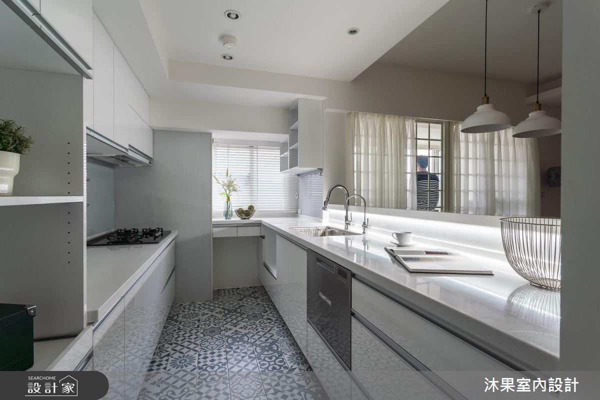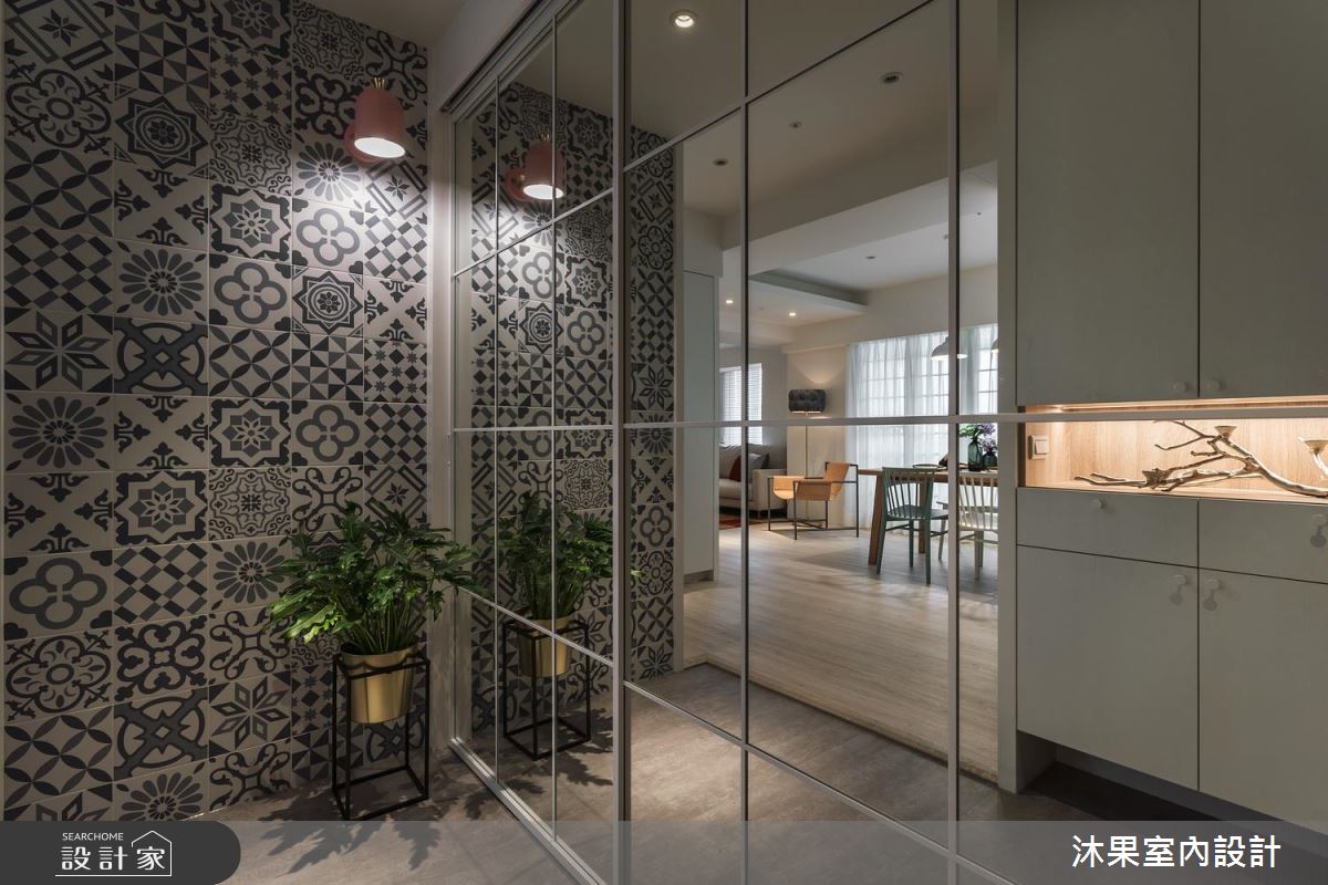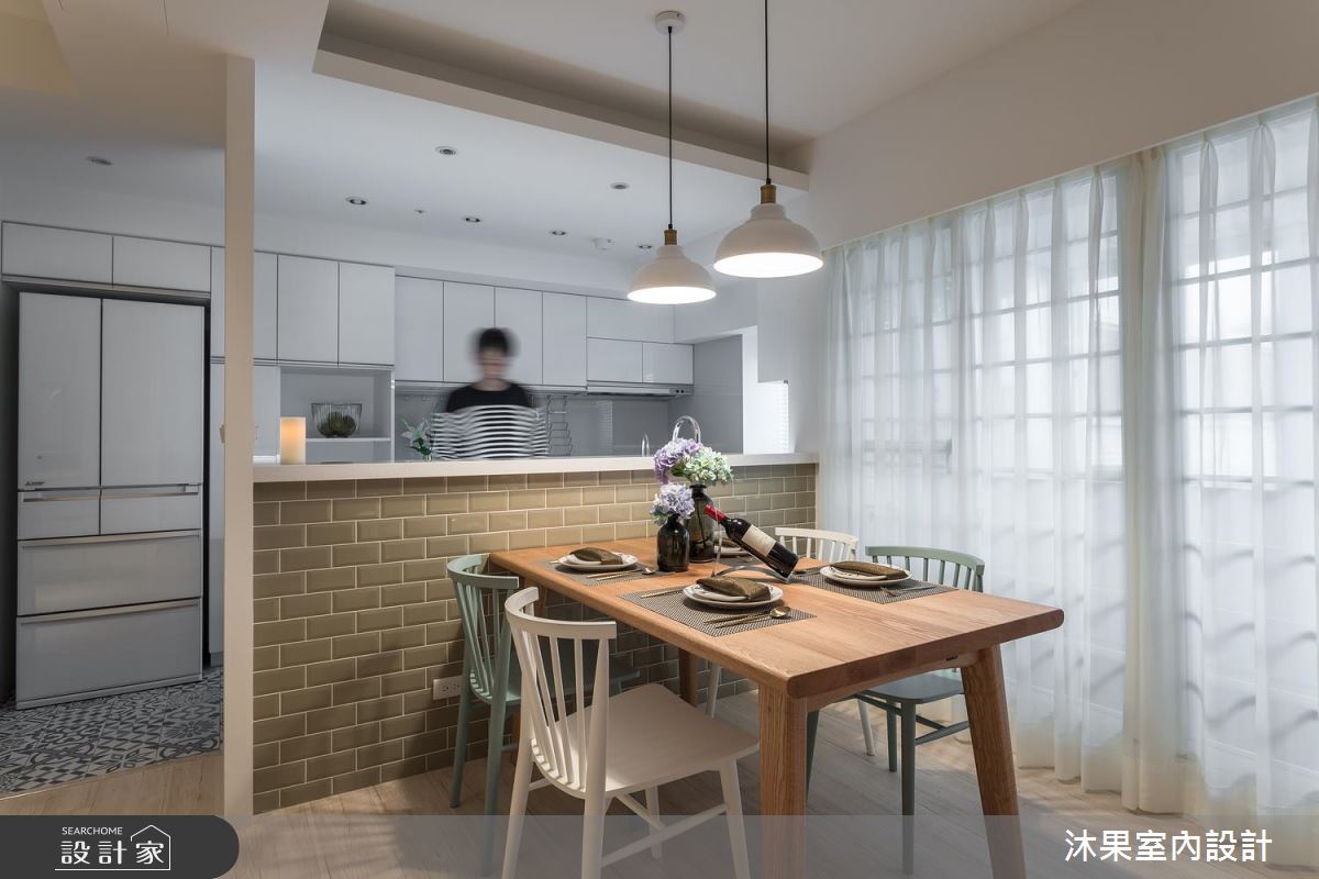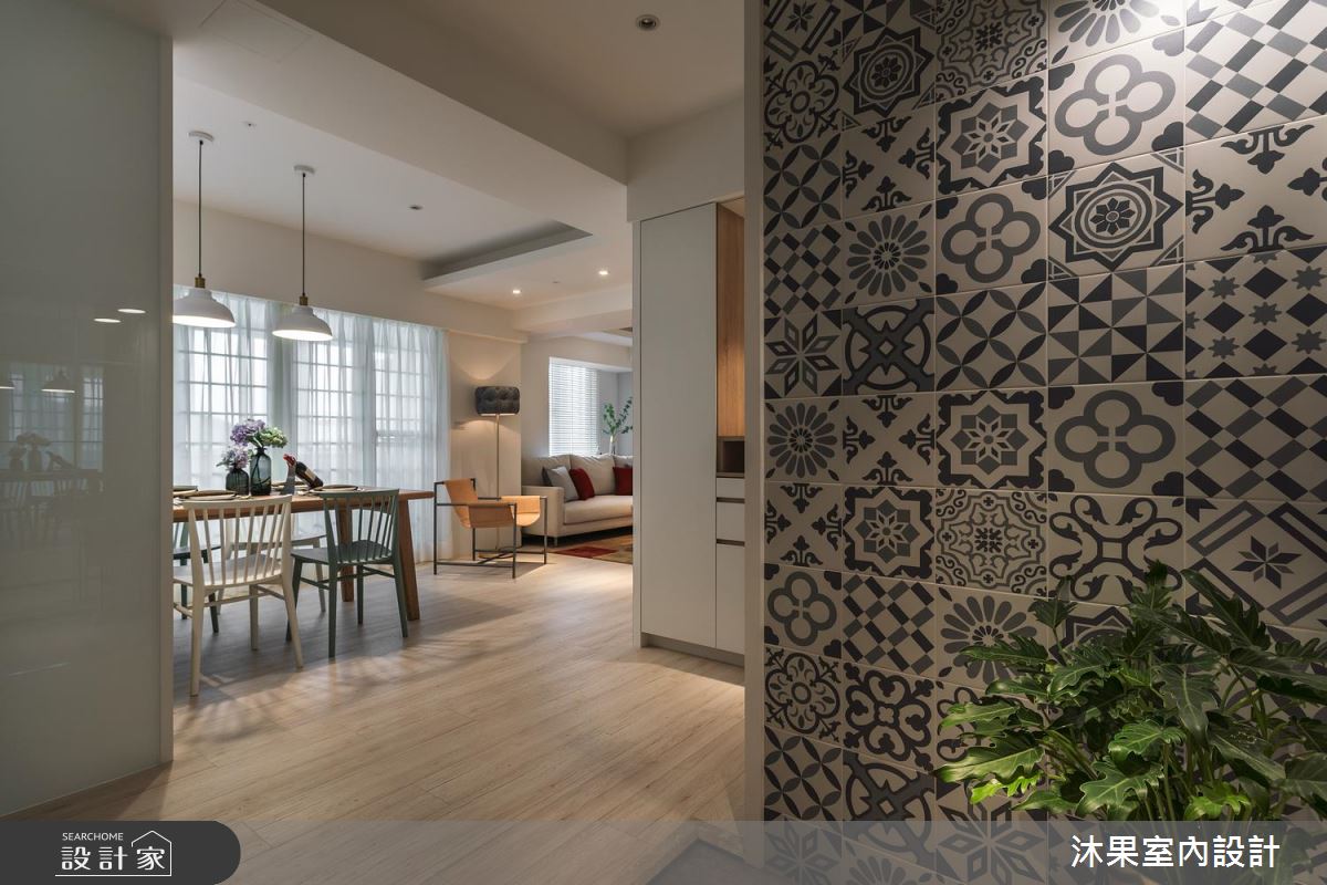 玄關區,採以活潑亮眼的藍色花磚牆,一改過往老舊氣息,白框玻璃拉門的增設,圍塑出完整的落塵範圍,視野及明亮度不受影響。室內原客、餐廚老格局對調,並推開獨立廚房的牆面,讓開闊視野拉寬客、餐、廚共享空間的尺度。客廳區,為原獨立廚房位置,牆面打開後帶來充沛採光,擺上 L 型沙發強化空間的寬敞,綠色植栽及造型茶几的選擇,則營造自然無負擔的清新氣息!身兼電視牆、隔間機能的牆面,利用上方開窗的巧思設計,解決後方無光地帶的書房,光線、對話、空間三者皆暢流無阻。