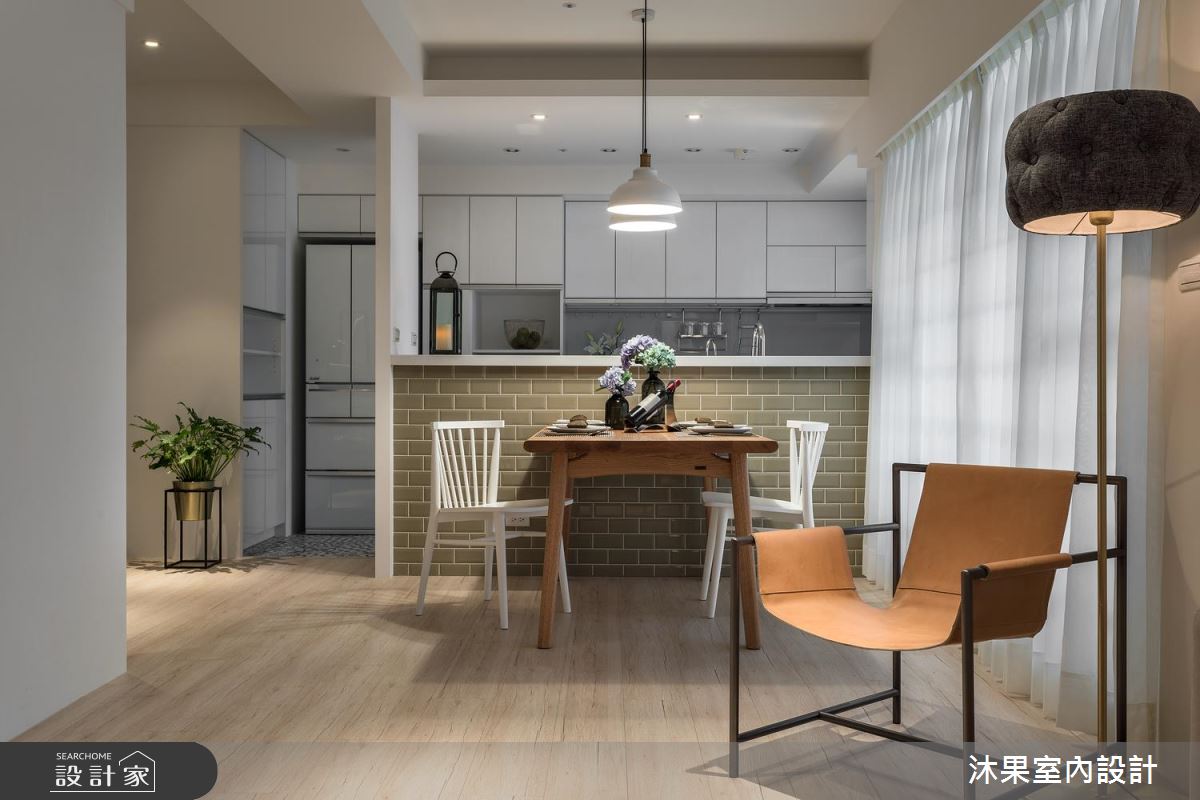 二字形廚房刻意作高的流理檯區,具有輕隔間意象,選擇文化石鋪排,打造有如置身文青咖啡館的吧檯。