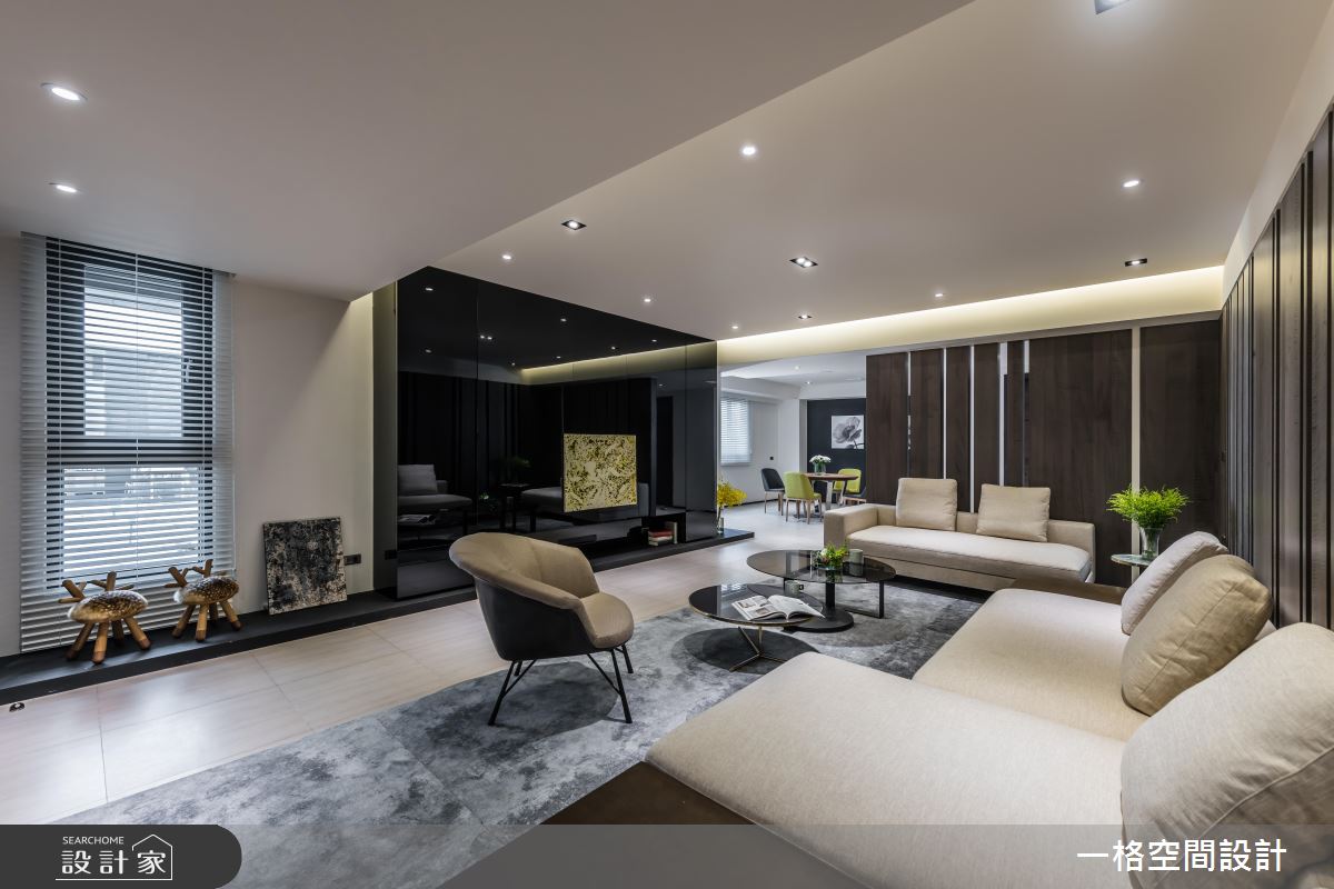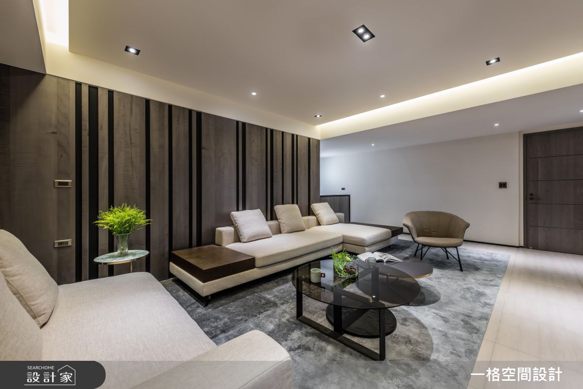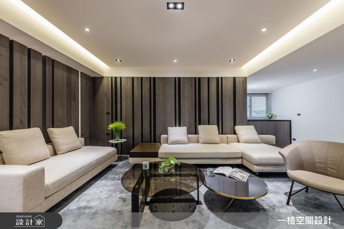 而客廳在入口處利用格柵元素,讓視線若隱若現,同時使得光線能夠自由穿梭。電視牆藉由黑玻材質,反射天花板的兩條光帶,賦予空間更為開闊的感受。沙發背牆選擇水波紋的木皮,鋪排出沉穩低調的室內氣息。而牆面後方則規劃半開放式廚房,透過適當的動線安排,讓各個格局不會相互影響。