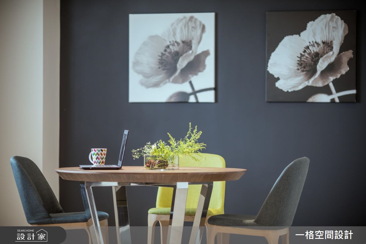 25 坪的現代簡約空間,被定調為招待一群人聚會的娛樂場所,屋主希望客人可以在此輕鬆地唱卡拉 OK、用餐談心,因此空間盡可能保持精簡的設計,讓彼此互動順暢無礙。
