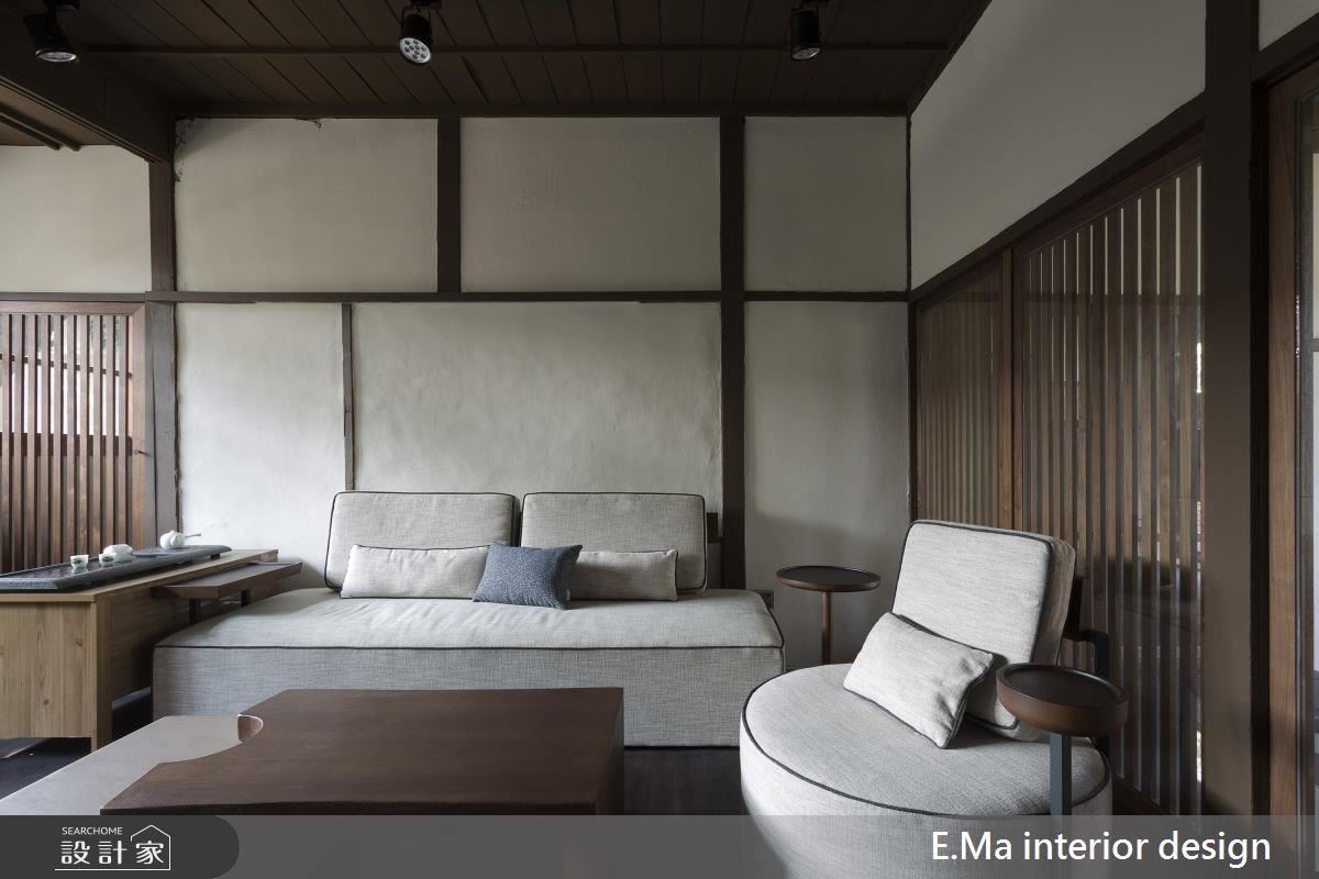 外觀拉門上下以玻璃設計,中間則使用木質材料規劃,不僅能隱約看到屋內的生活作息,也能為主人保留適當隱私。家具挑選輕鬆的淺色調性,不會突兀也不會仿舊,讓軟件與空間達到和諧的氛圍。為讓空間更符合修舊如舊語彙,設計師轉以橫向工法設計,將冷氣機採吊隱式設計規劃於廚櫃,讓整體空間的視覺更為乾淨俐落,並在整體空間中加入格柵元素點綴,營造出濃郁的日式禪韻風格。
