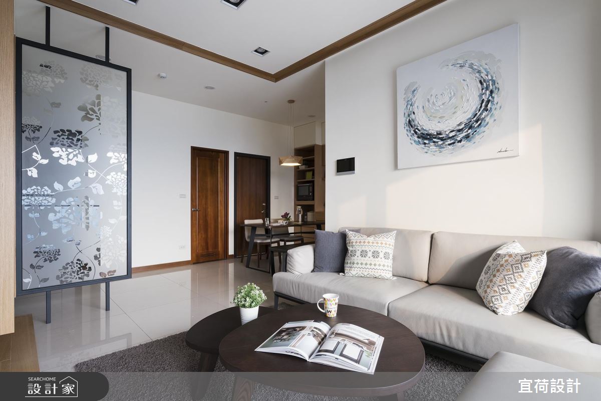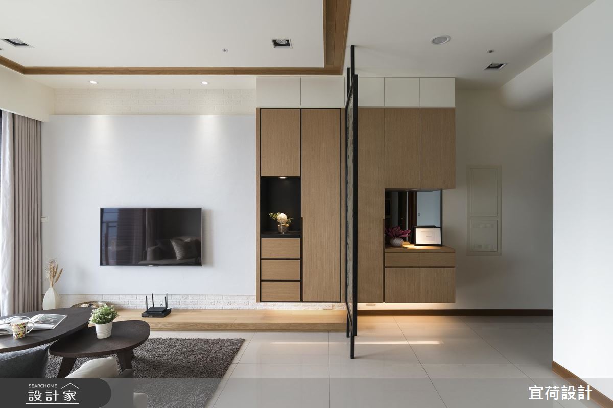 玄關利用一道噴砂玻璃屏風,避免視線直接穿透到客廳,同時切割了鞋櫃和電視櫃,巧妙形成獨立又連貫的立面風貌。客廳電視牆在上下兩端,藉由白磚語彙創造牆面的紋理變化。沙發、茶几選擇單純的色彩、簡潔的線條,留出空白來接納窗外的遠方山景。