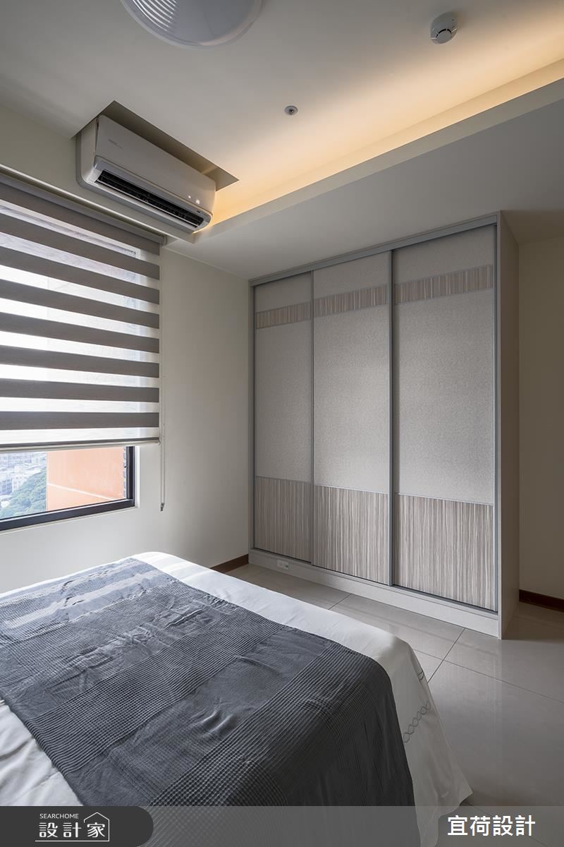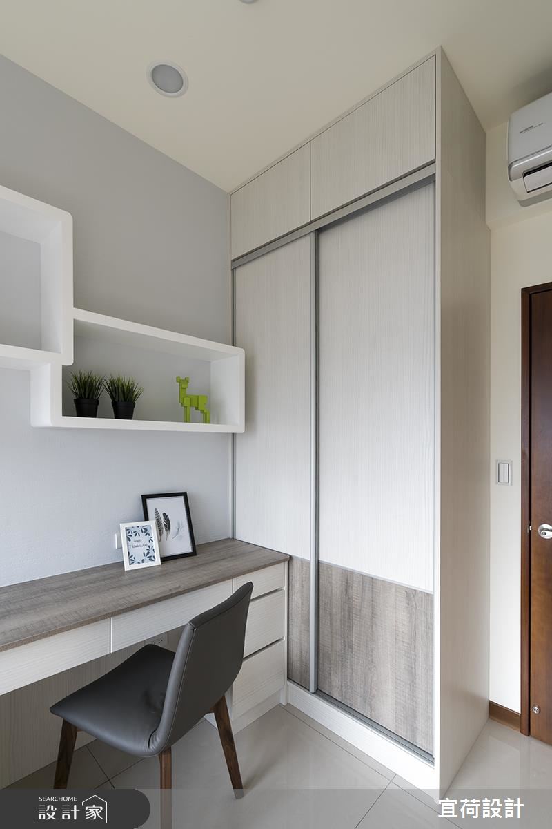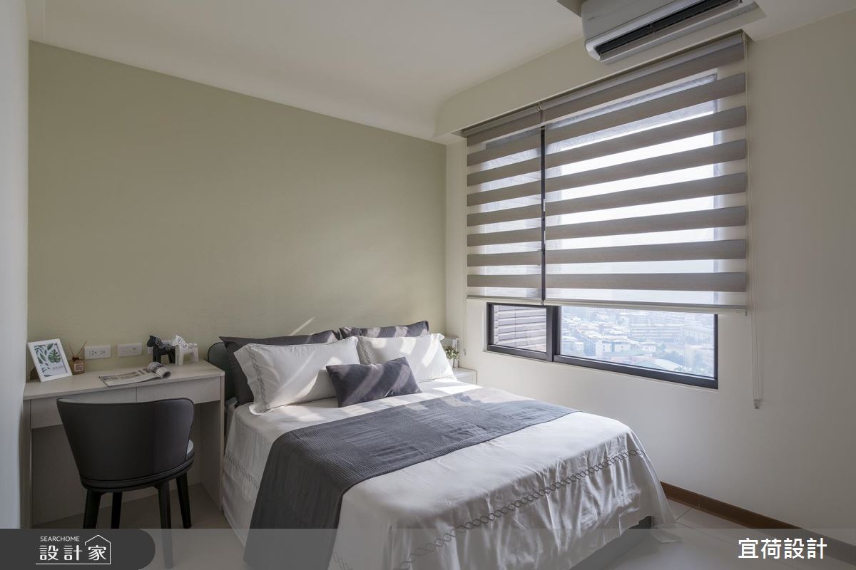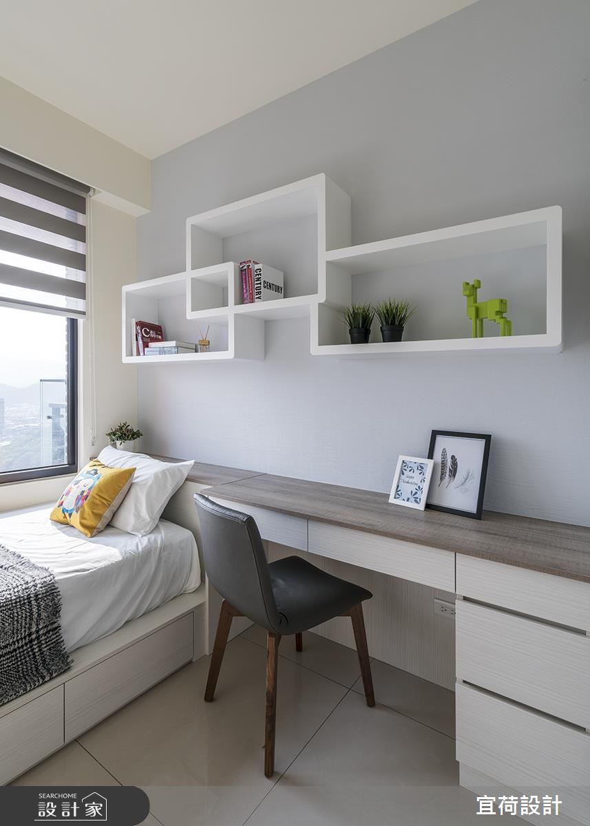 餐廳則配置一大面電器櫃,搭配方便移動的簡約桌椅,讓居家不會因為要滿足機能,而導致空間過於狹窄。主臥以淡綠色裝飾床頭牆,且運用弧狀設計修飾壓樑,營造舒服的休憩環境。次臥將書桌與床頭櫃結合,並於床鋪下方增設收納空間,使居家保持整潔。