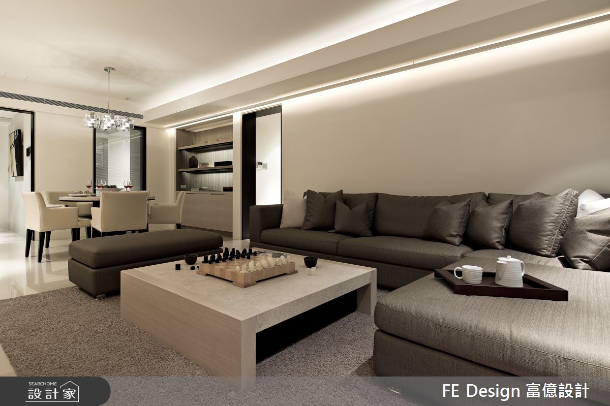 66 坪的現代風大宅,以沉穩的灰白色系為空間主軸,加上重點牆面的石材肌理,在照明輔助之下,呈現兩大三小居家的大氣質感,簡潔卻有細節。