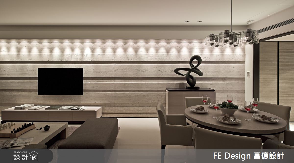 客餐廳選擇開放式設計,並利用石材紋理切割主牆,延伸了公領域的視覺效果。客廳透過沙發和電視櫃塑造格局的方正,而餐廳則藉由時尚吊燈與人造石圓桌,呈現不同的空間感。餐廳靠門處,在櫃子上擺放大型抽象藝術品,讓人在來回踱步間,感受高雅的人文氣息。