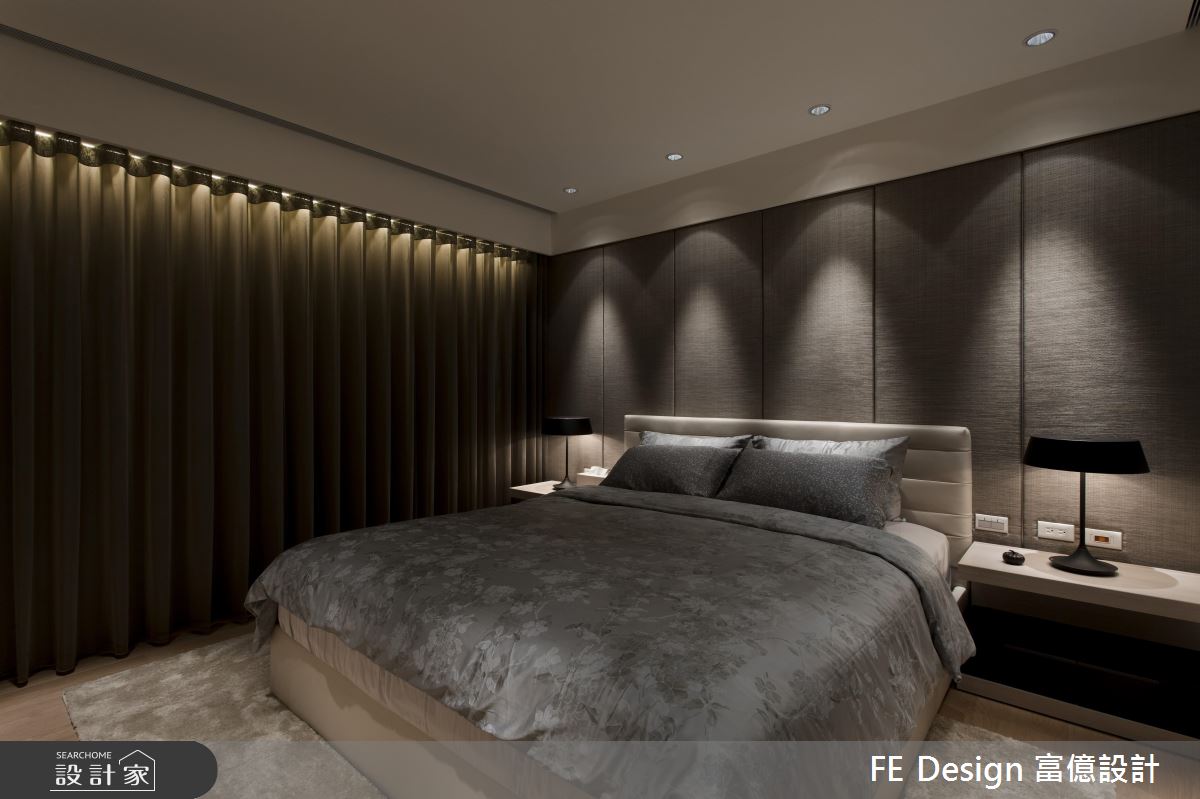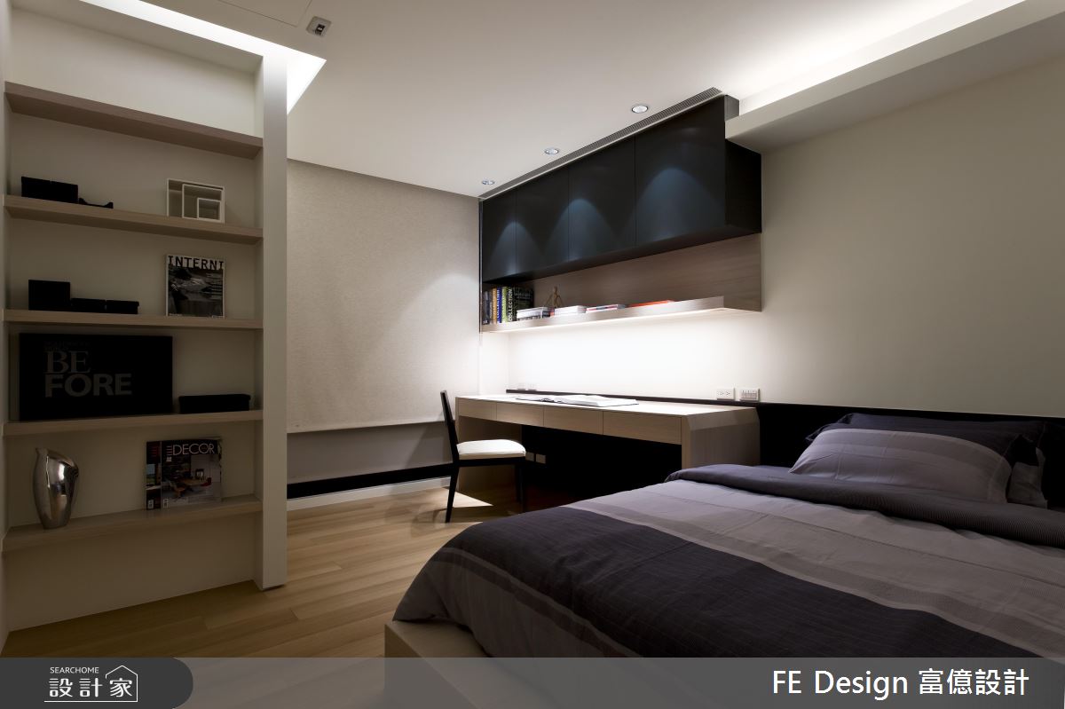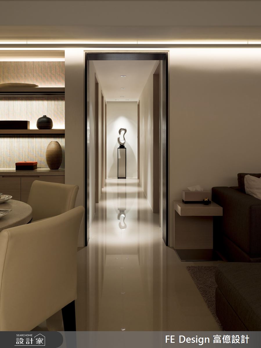 通往私領域的長廊,將各個房間一字排開,並於廊道底端運用藝術品和鐵架的簡單線條感,形成輕盈明快的端景。主臥以燈光打亮床頭牆的布紋,表現低調有層次的立面質感。次臥利用深色腰壁板與懸空書櫃上下呼應,且運用層板設立書報架。另一間臥室選擇類似的空間配置,加上架高地坪的收納空間,增添機能性。