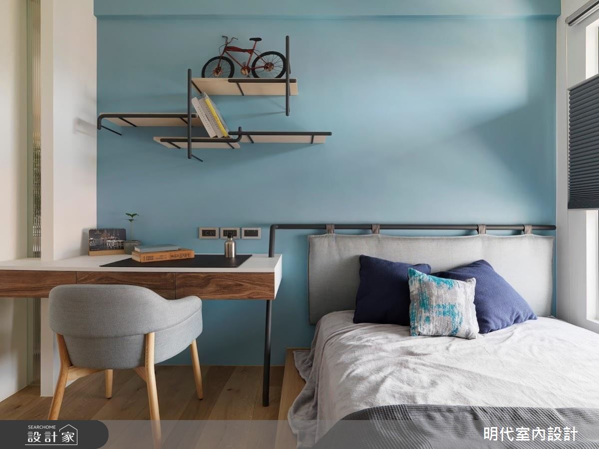 主臥室裡以大地色系妝點,調和出溫暖的空間氣息,床尾特別打造大面書櫃,滿足屋主的藏書需求,角落還可以安排一處閱讀區,讓屋主隨時處理公事或是享受睡前的一段閱讀時光。