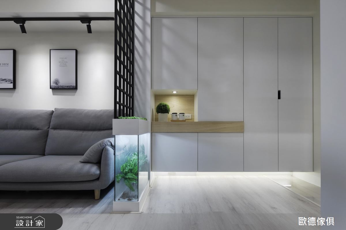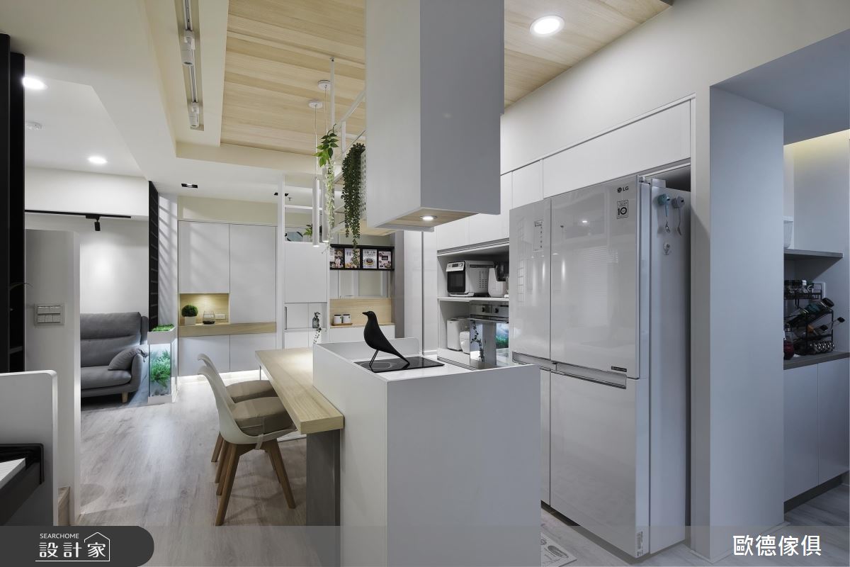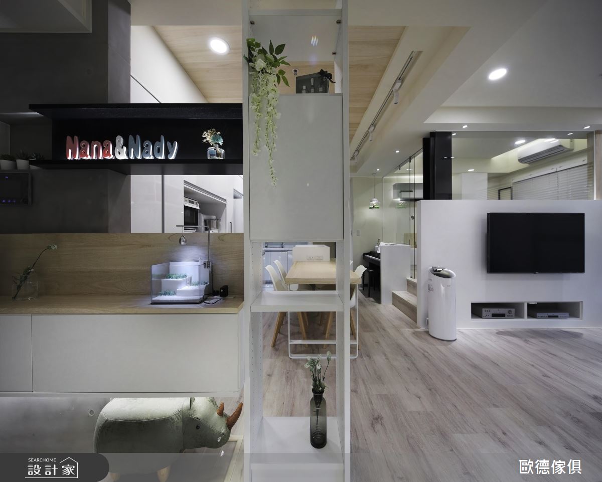 玄關與廚房相連處,用系統板材量身訂做的收納層架大有玄機,不僅具隔間用途,還賦予雙面開櫃的創意設計!靠近廚房側收放女主人常閱覽的食譜,大大提升實用性、使用效率。