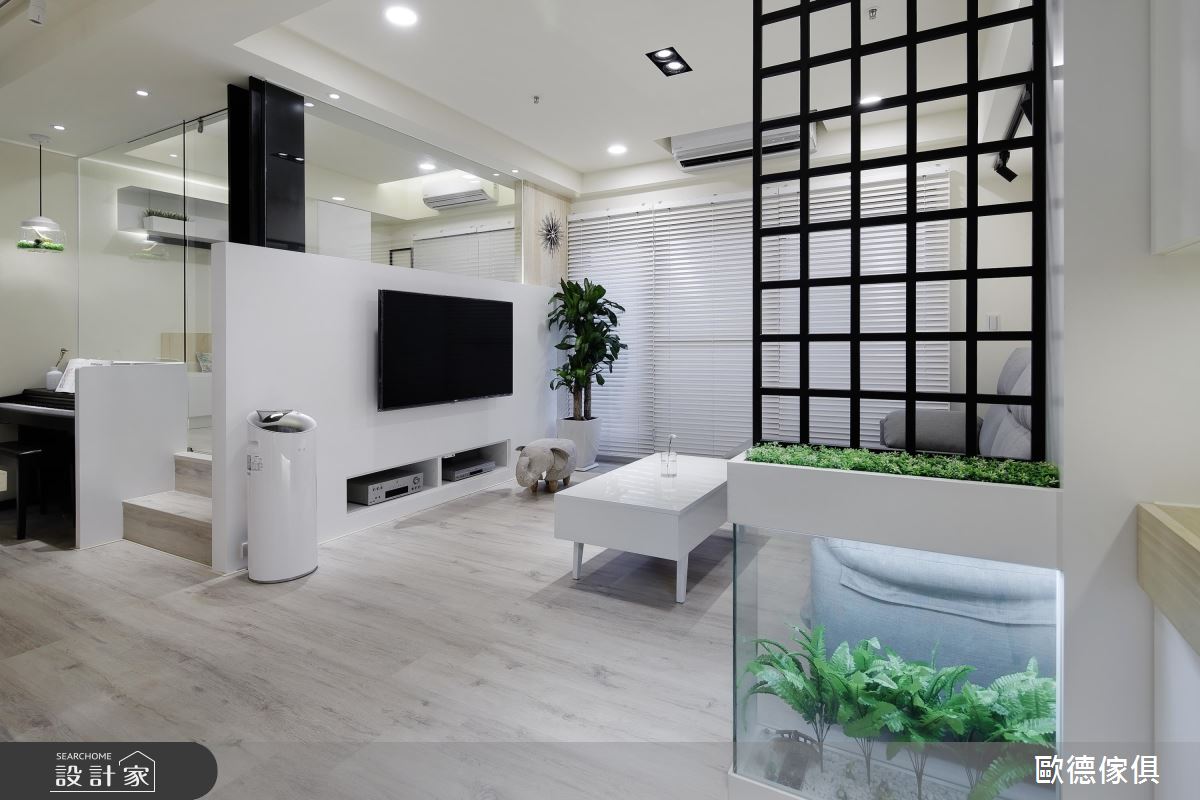 玄關屏風處,以鐵件方格展現簡練設計感,並保留光影穿透及場域串聯性,巧思安排的植栽玻璃箱底坐,迎賓門面清麗舒心,風水禁忌也迎刃而解。客廳電視牆上方留空以玻璃取代,少了及頂視覺的壓迫,也為後方空間保留好採光;角落柱換上鋼刷木皮,傳遞異材質的層次美學,搭襯落地大植栽為室內帶來自然好氣氛。電視牆後方的多功能室,一處牆面安排烤漆畫板,任小孩揮灑創意;架高的木地板規劃隱藏式系統收納,為大量玩具、書籍及日用品的棲身之處;地板中央則為大人設計升降茶桌,具備沏茶談天、休閒娛樂等用途,無疑是增進親子情感的核心地帶。