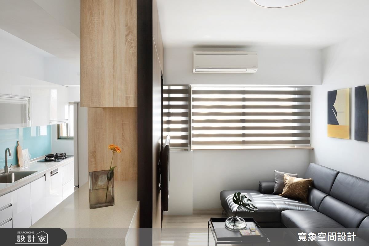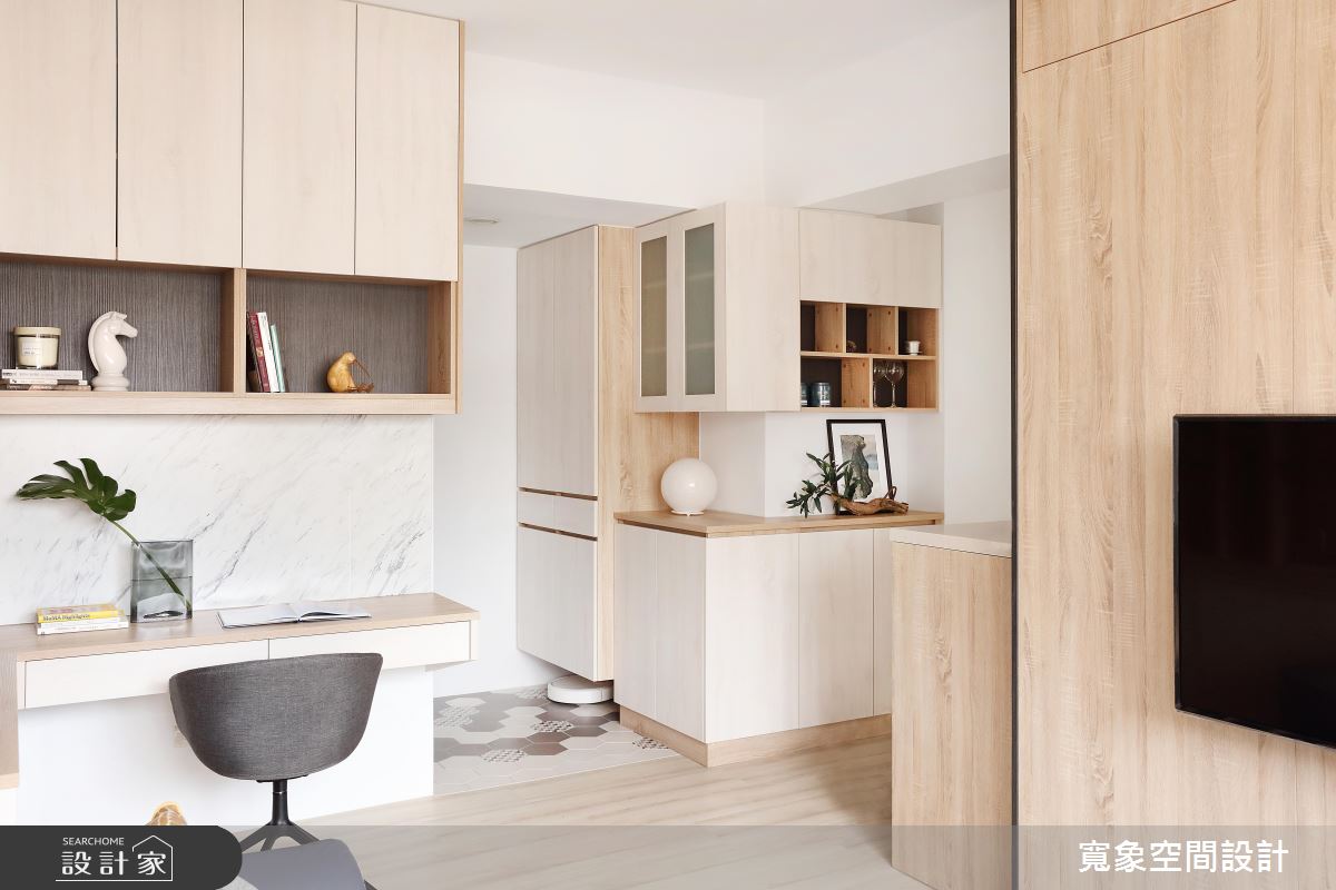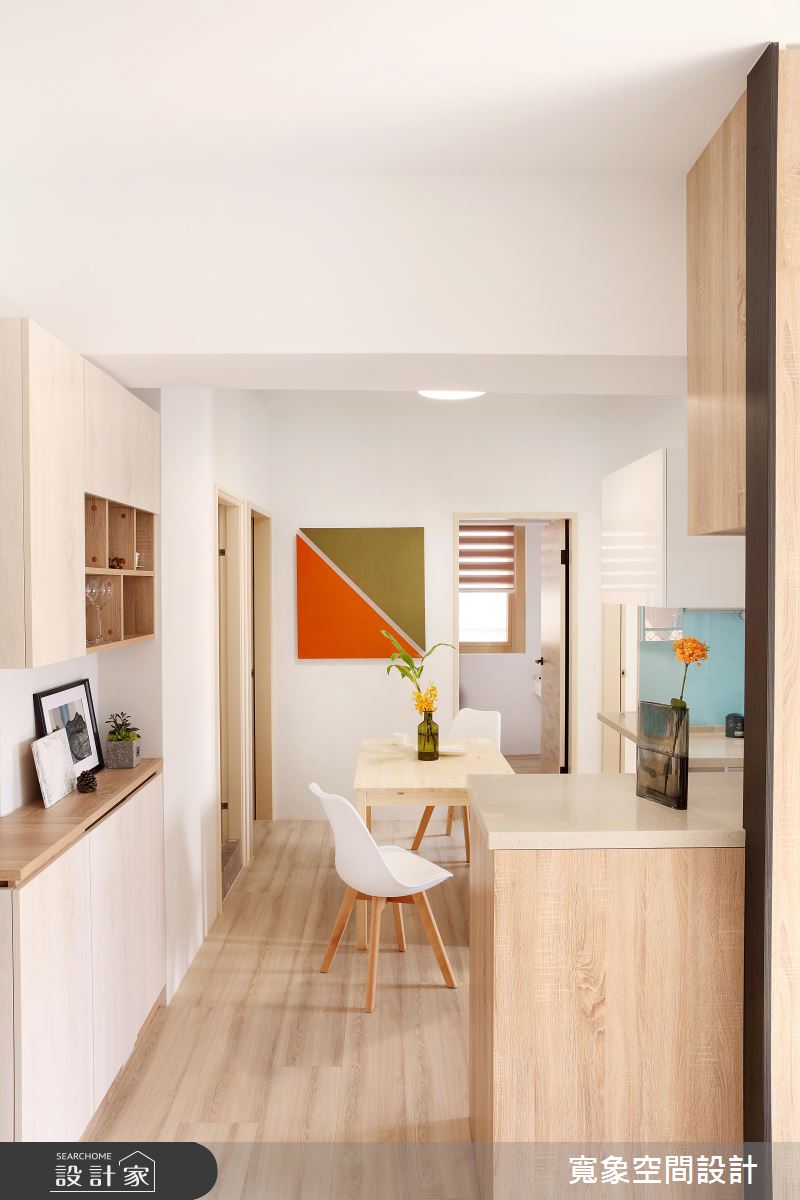 一進門玄關地坪的花磚,搭配輕盈的木質鞋櫃,迎來陣陣清新感,而視線轉移到室內,從客廳窗邊透進的日光沐浴著整室,柔軟又有溫度,且深淺色系木紋大面積鋪排,與陽光完美配合為小空間增加明亮度及溫暖,層次分明的木與白色調間,打造更為生動的居家氛圍。廚房區域,改為開放式設計後,讓女主人展現廚藝時,也能與家人互動,打通公共空間各場域的交流,另外,流理台延伸的 L 型抬面一處,擺上兩張高腳椅,變身小吧檯機能,成為屋主品酒、用餐的好選擇。為新增衛浴空間,自然壓縮公領域尺度,因此設計師透過拉高天花設計,虛化窄小的視覺感。