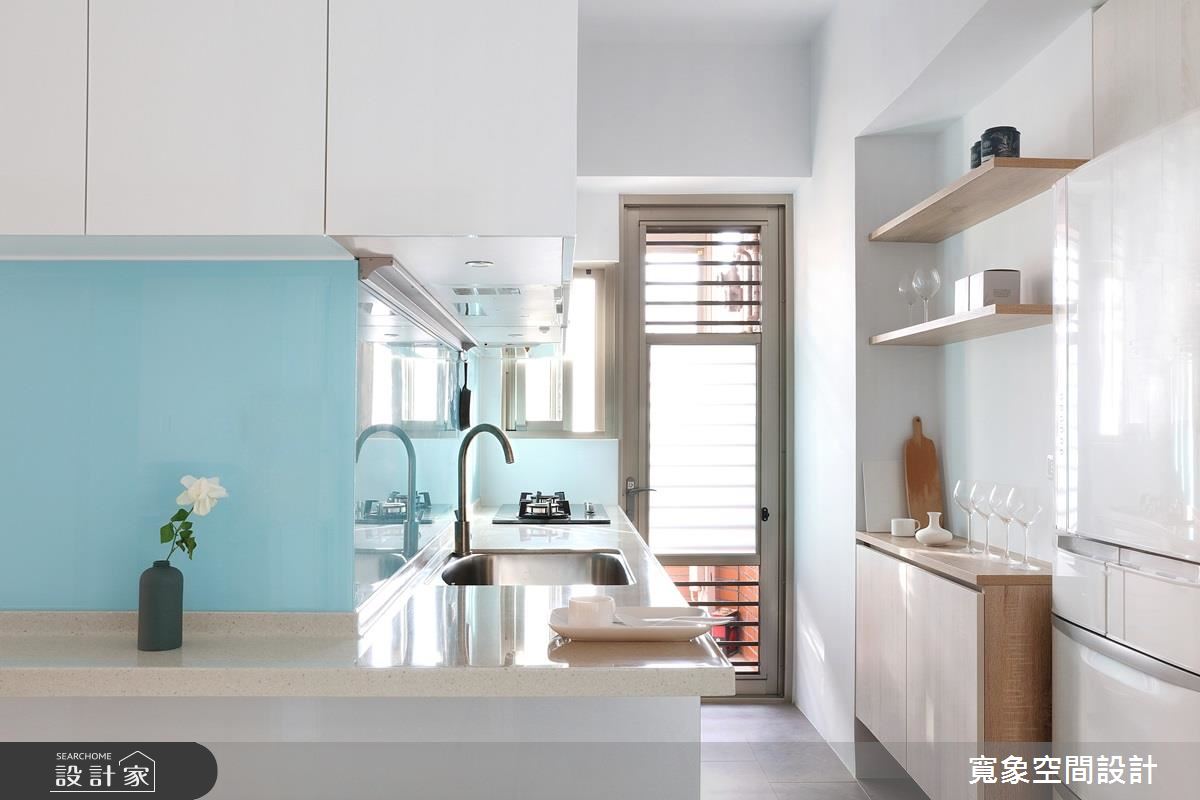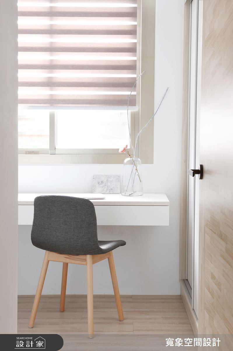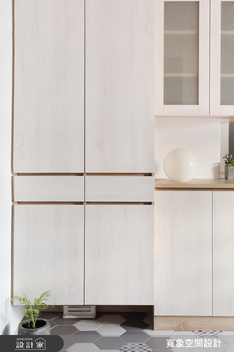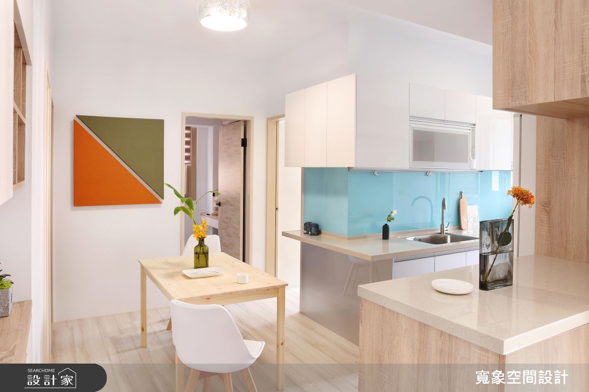 一進門玄關地坪的花磚,搭配輕盈的木質鞋櫃,迎來陣陣清新感,而視線轉移到室內,從客廳窗邊透進的日光沐浴著整室,柔軟又有溫度,且深淺色系木紋大面積鋪排,與陽光完美配合為小空間增加明亮度及溫暖,層次分明的木與白色調間,打造更為生動的居家氛圍。廚房區域,改為開放式設計後,讓女主人展現廚藝時,也能與家人互動,打通公共空間各場域的交流,另外,流理台延伸的 L 型抬面一處,擺上兩張高腳椅,變身小吧檯機能,成為屋主品酒、用餐的好選擇。為新增衛浴空間,自然壓縮公領域尺度,因此設計師透過拉高天花設計,虛化窄小的視覺感。