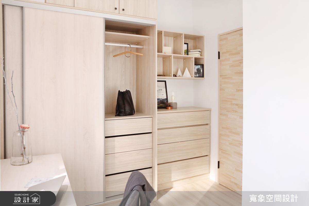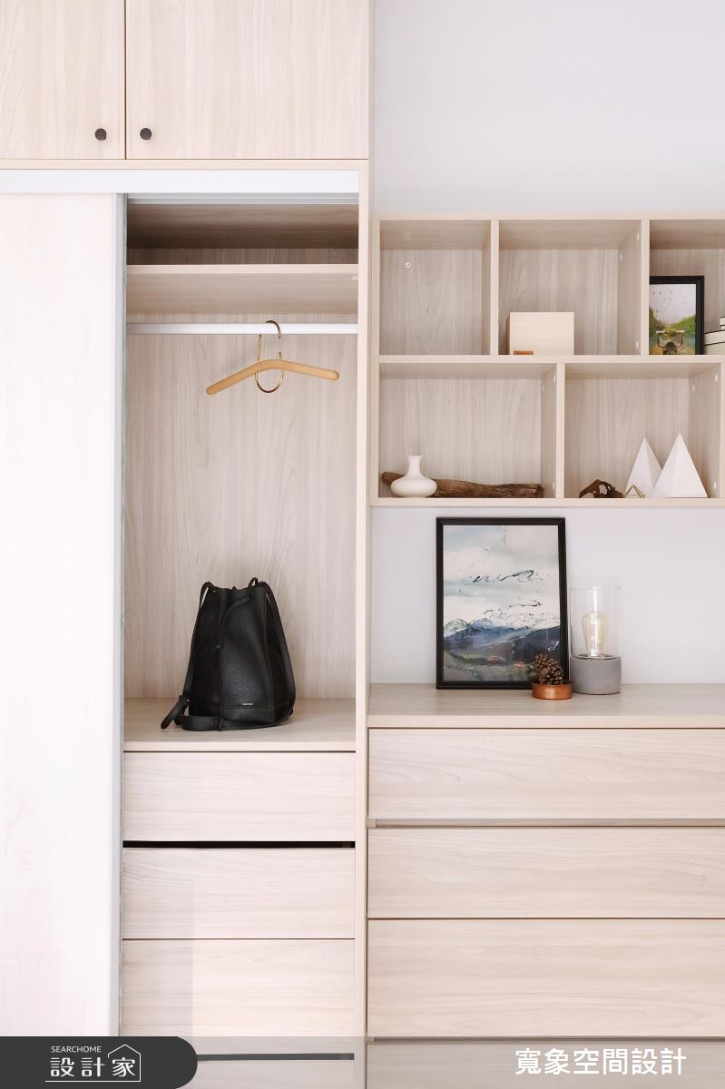 臥室空間小,但又需要充足的收納,因此設計師將部分收納櫃打開,以懸空、展示的方式,解決龐大櫃體帶來的狹隘視野;而材質選擇上,延續公共空間的木質設計,並選用色系較淺的木質材,讓氛圍更加輕盈放鬆。