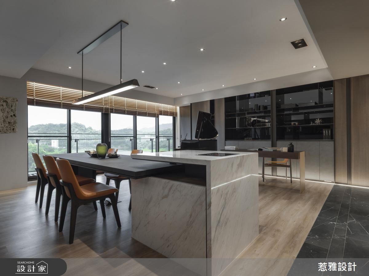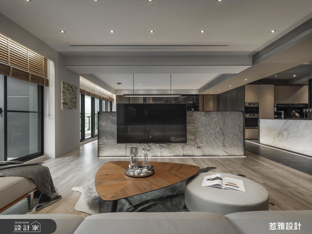 開放式的格局,不僅在於客餐廚有著穿透視野,亦於左右打開通道,形成自在穿梭的舒適感。而場域之間的半腰牆,與其說是分界,毋寧更多裝飾的意味,電視牆以粗獷石材鋪陳,廚房順勢以大理石中島為界;色彩深淺對比、線條橫豎錯落。