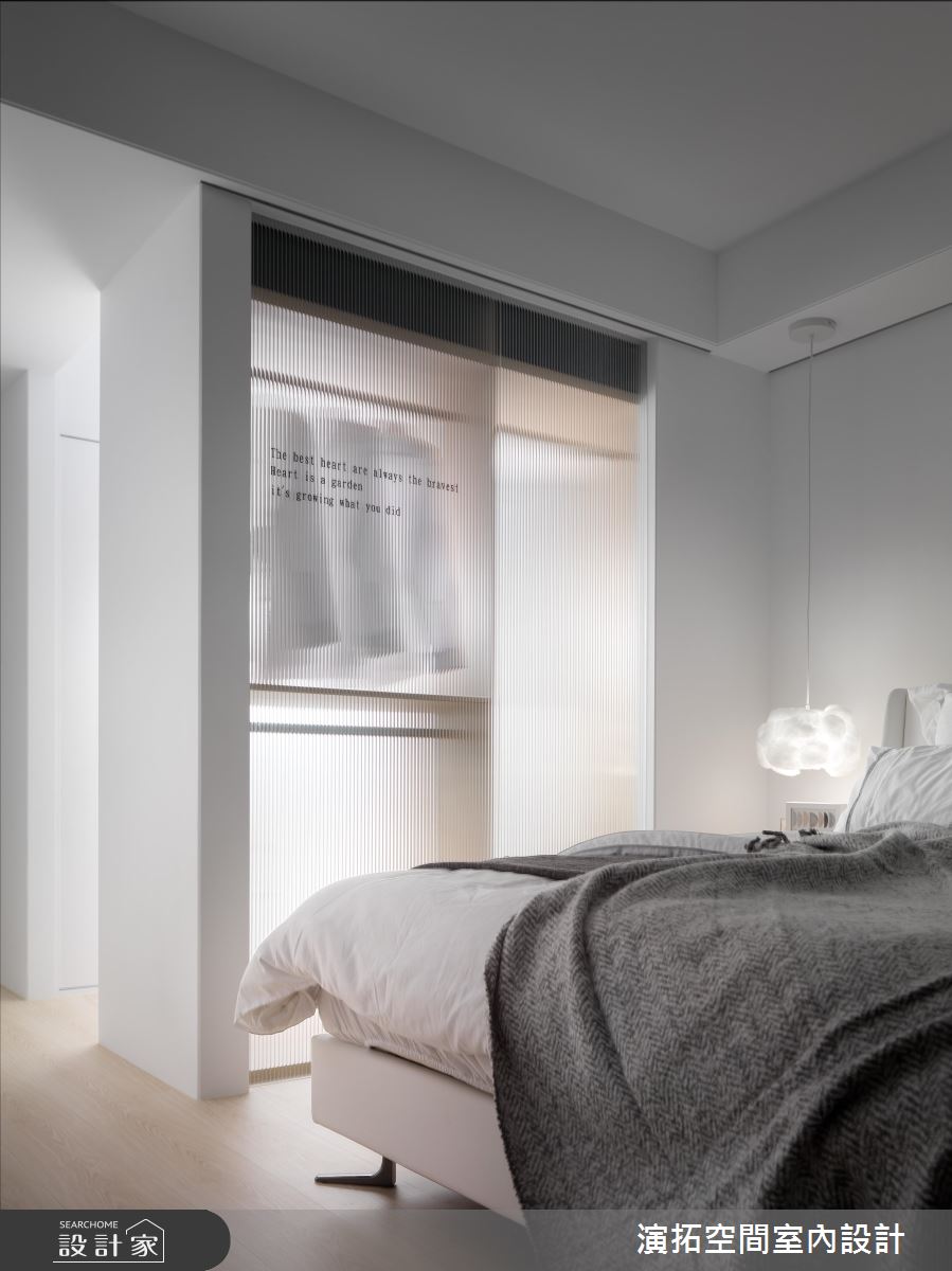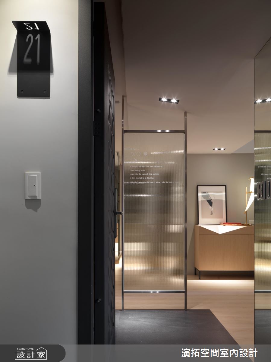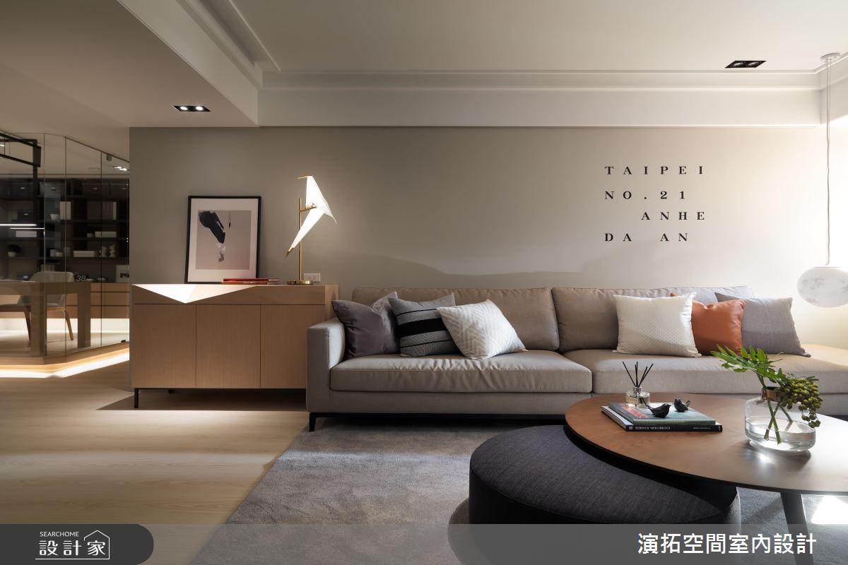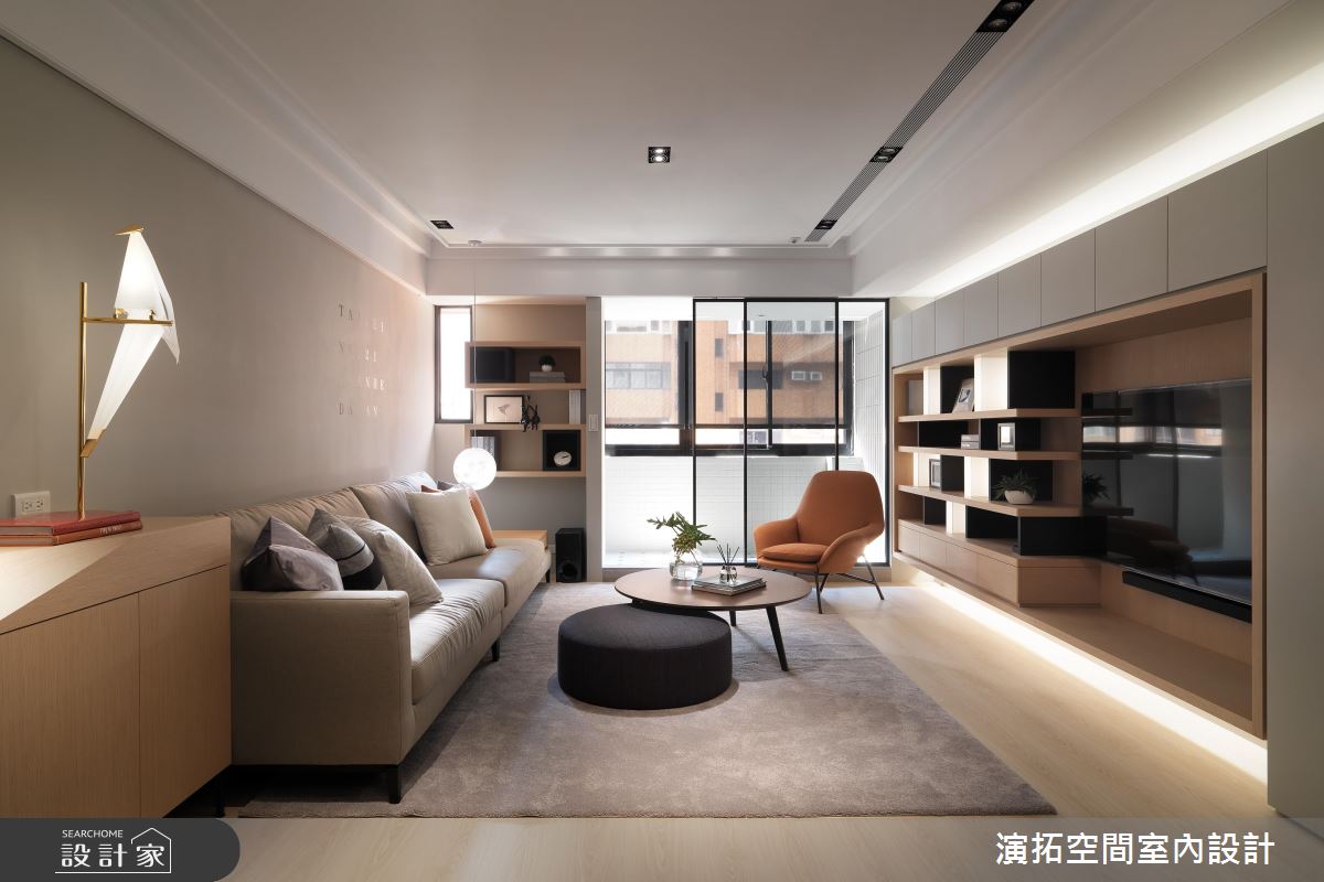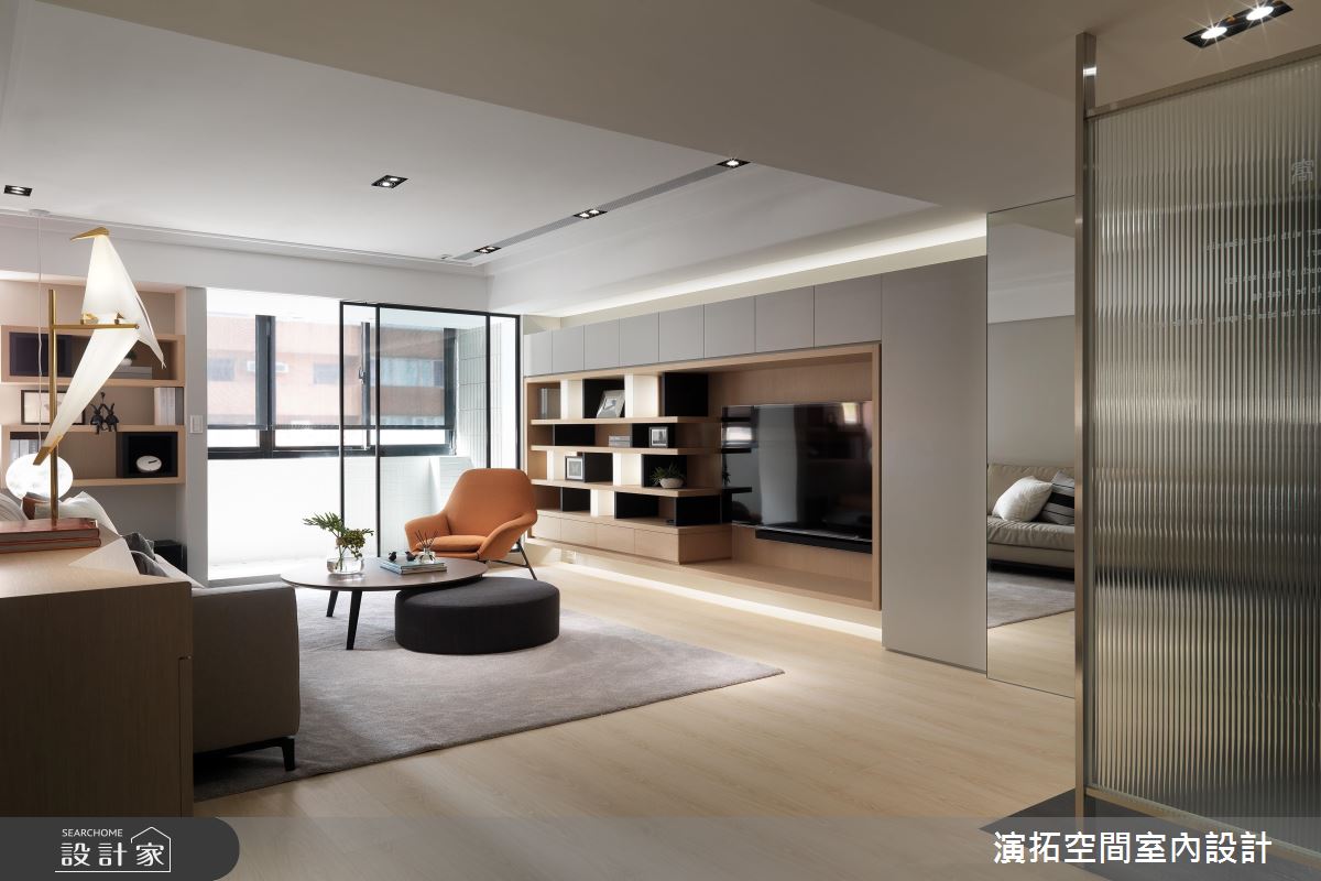 玄關以深色石英磚地坪鋪設,與公領域安排的超耐磨地木地板有所界定,並以鐵件搭架霧玻的屏風,讓視線不會一眼見底,同時保留流動、開放的場域。客廳擁有陽台設計,透過玻璃拉門界定領域,隨著戶外暖陽走進室內,照亮空間的美學細節;電視牆以木紋為基底,結合邊框手法納入一旁原木質感的收納與展示機能,最外圍以L形灰色牆面安排,上方設計收納櫃,打破制式化的牆面設計;沙發背牆以簡約的灰鋪陳,並烙上英文字母,側邊垂掛一盞吊燈,形塑人文美學氣息;將餐廚空間完全敞開,且與客廳連成一直線,讓戶外光線也能照亮幽暗的角落,營造出乾淨、舒服的用餐與烹調場域。