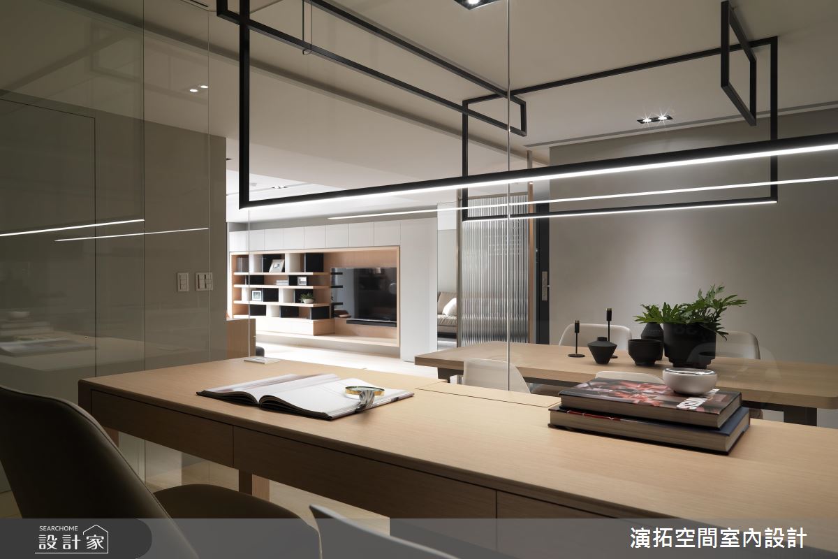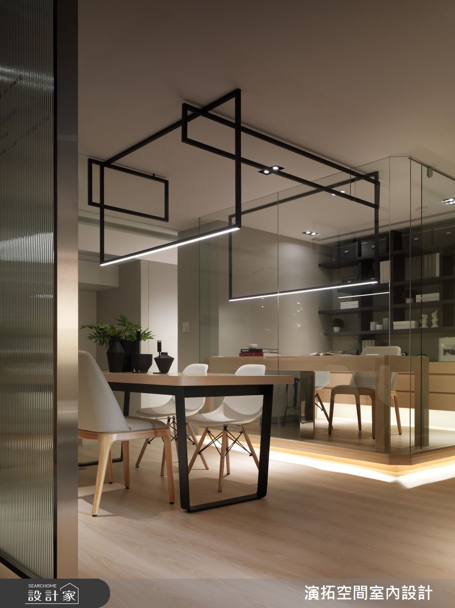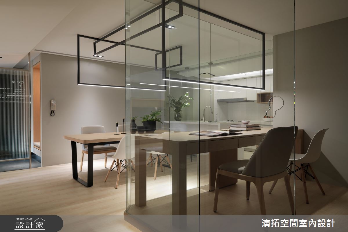 餐廳後方以玻璃圍塑、架高的木地板創造書房區,彷彿玻璃屋一般,穿透的材質安排讓自然光能夠走進來,照亮視覺明亮度。