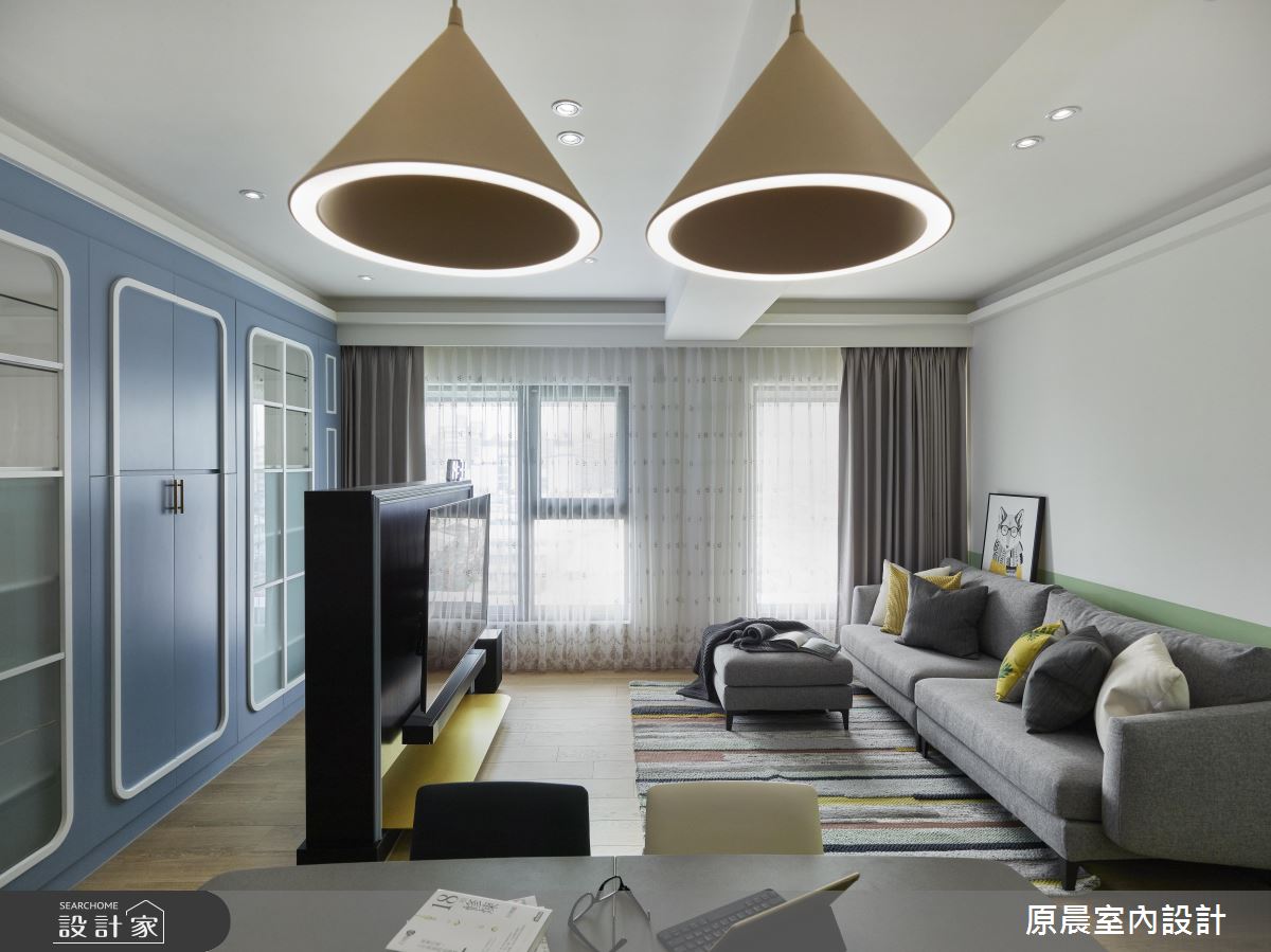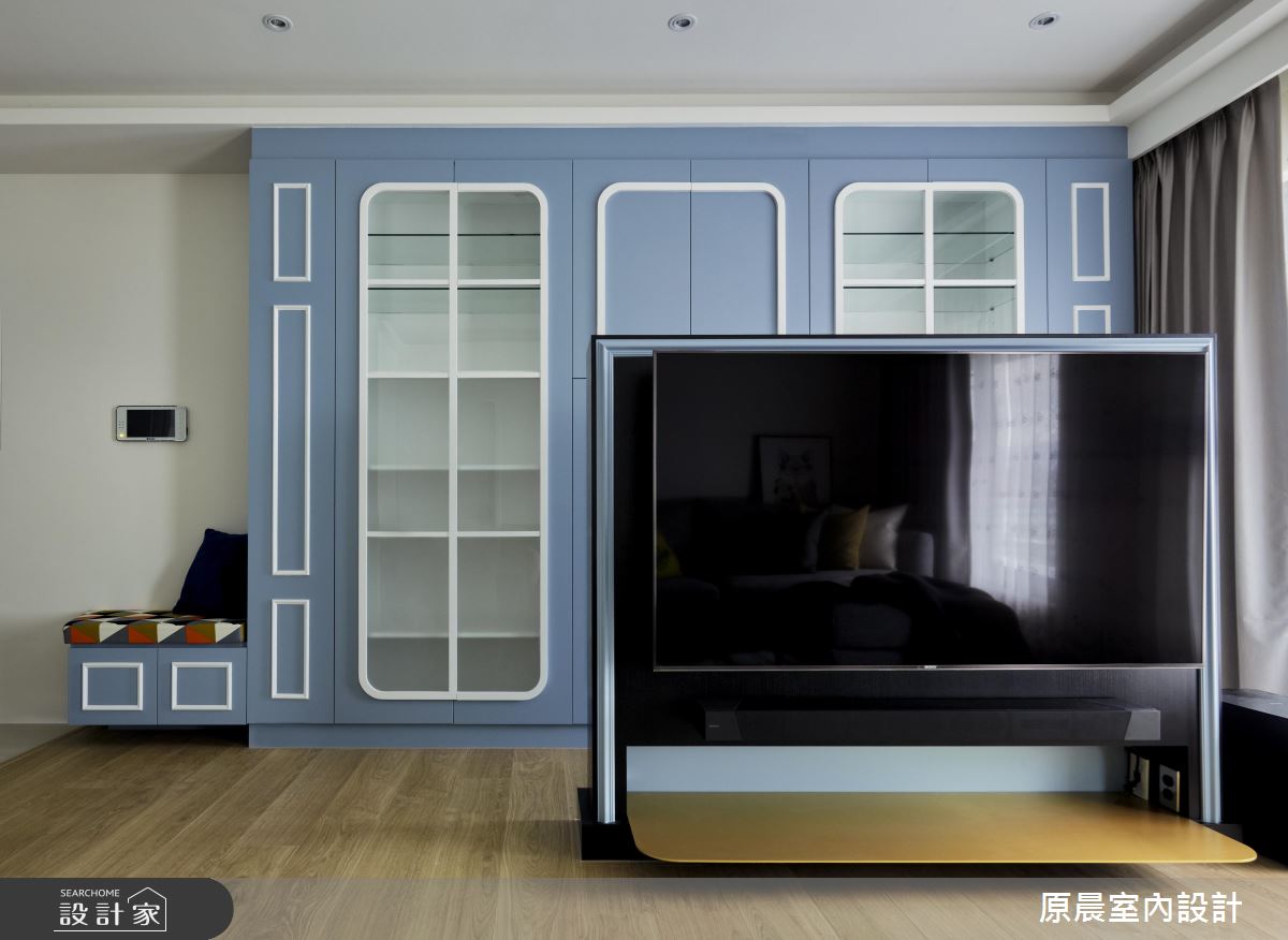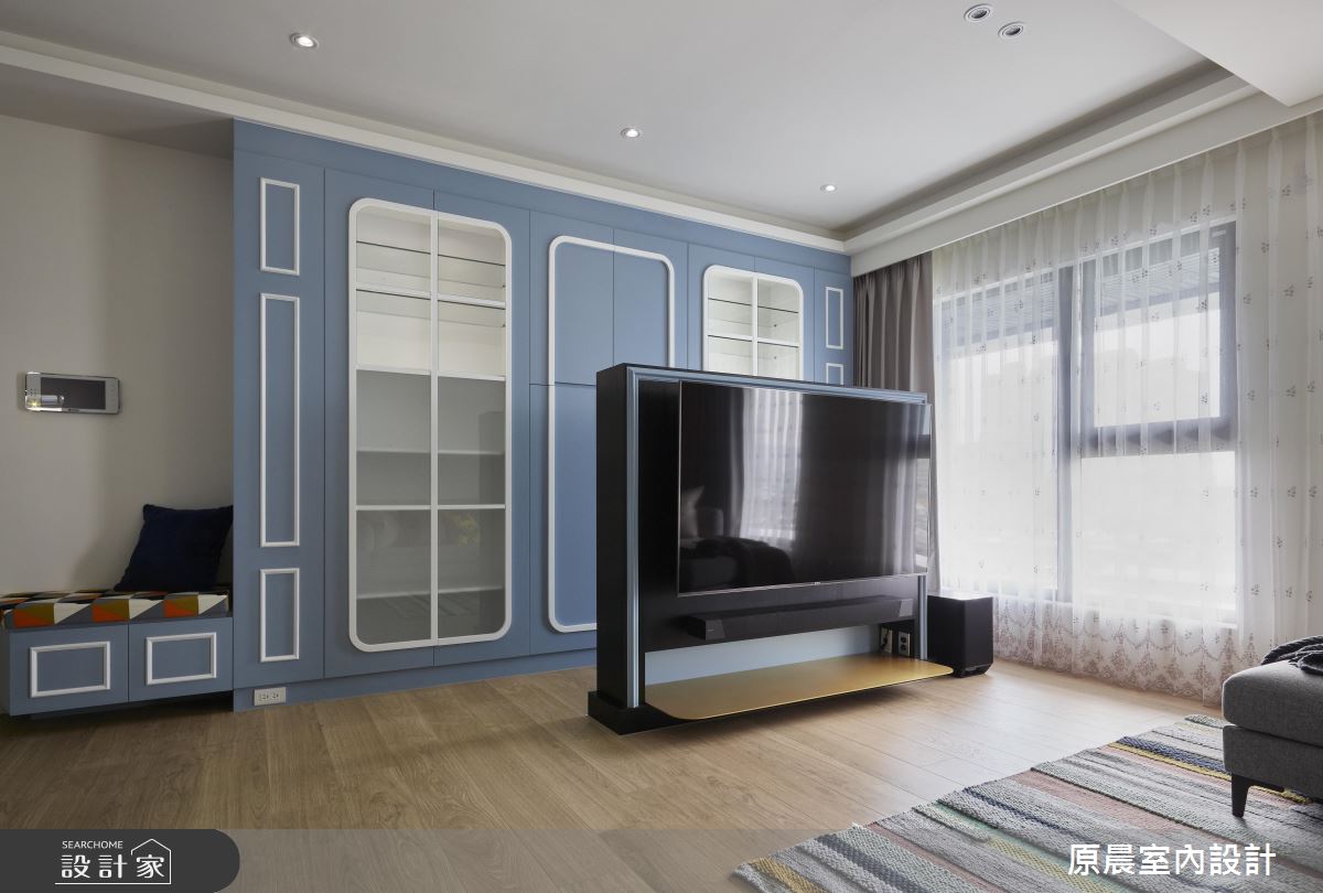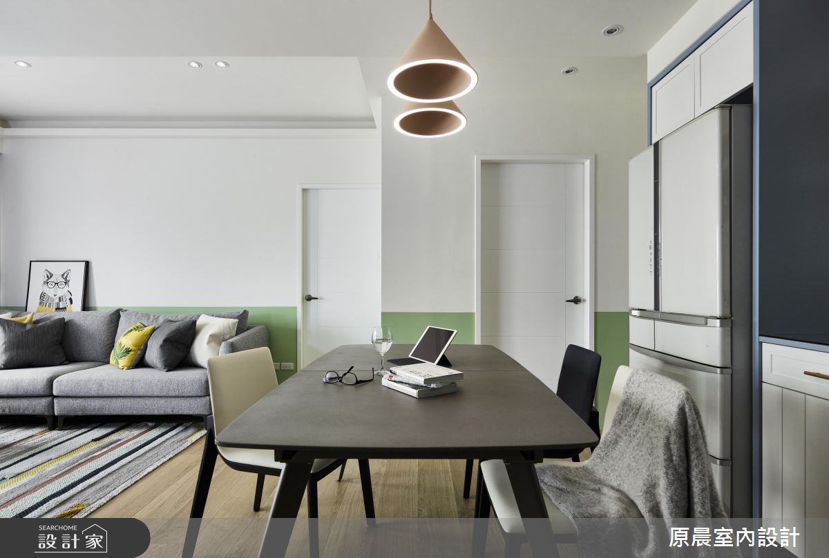 公領域以開放隔局規劃,天地壁讓簡約的線條描繪,地坪鋪設木紋肌理,空間裡透過大量的白色調襯底,搭佐局部以淡雅藍、綠色調,交織出清爽、活潑的生活氛圍,伴隨窗戶引入戶外光源,更讓坪數有限的室內顯得舒心、寬敞。客、餐廳相容一室,電視牆以一半的高度展現,讓空間更顯穿透力,透露出後方的大型收納櫃,櫃體結合穿鞋椅的機能,淺藍色調的門片在玻璃質感、白色古典門拱造型的搭配下,牽引出鄉村風的迷人特質;在乾淨、淡雅的公領域裡,透過低採度的家具搭配,蘊含一股沉穩氣息,像是灰色調的布料沙發、條紋地毯、深咖啡色調的餐桌、淺色單椅以及木紋吊燈,共同創造出溫潤的居家氛圍。