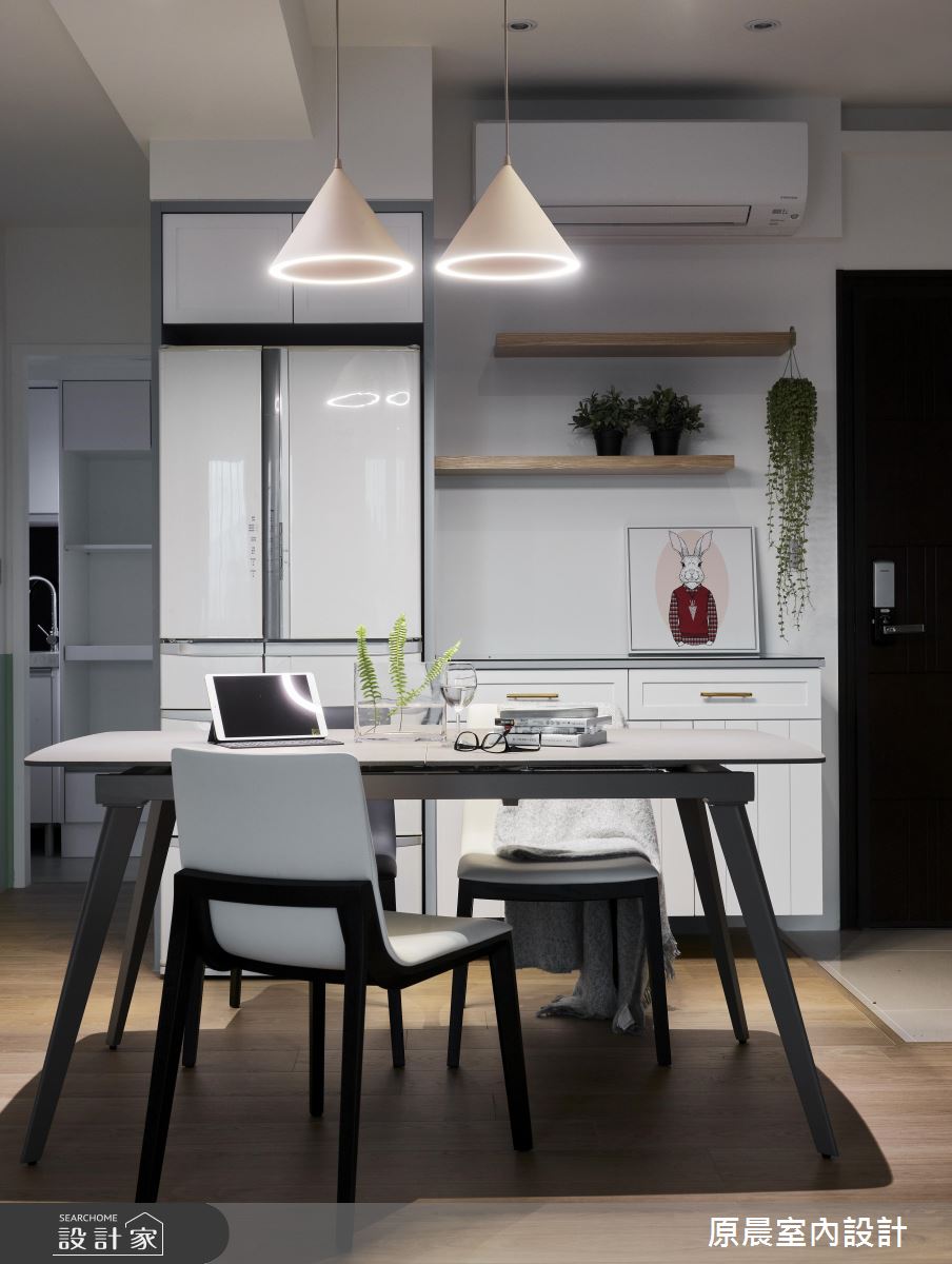 面臨原有的廚房空間太小,擺放冰箱後導致動線狹窄,於是設計師將原本的冰箱位置改為電器櫃,餐廳的背櫃串連冰箱與玄關的收納機能,而牆面搭佐層板設計後,讓綠意植栽點綴其中,醞釀一抹清新自然的生命力。