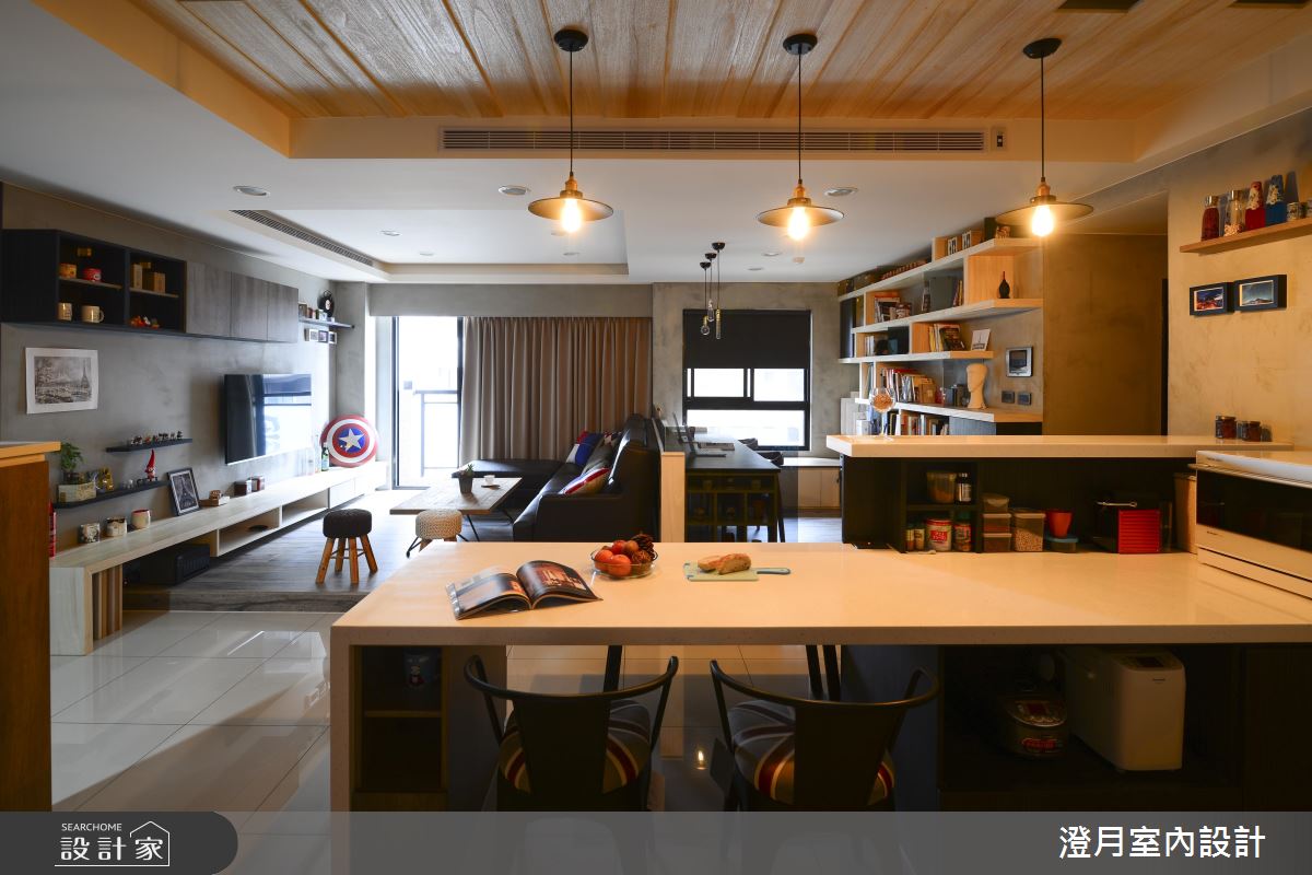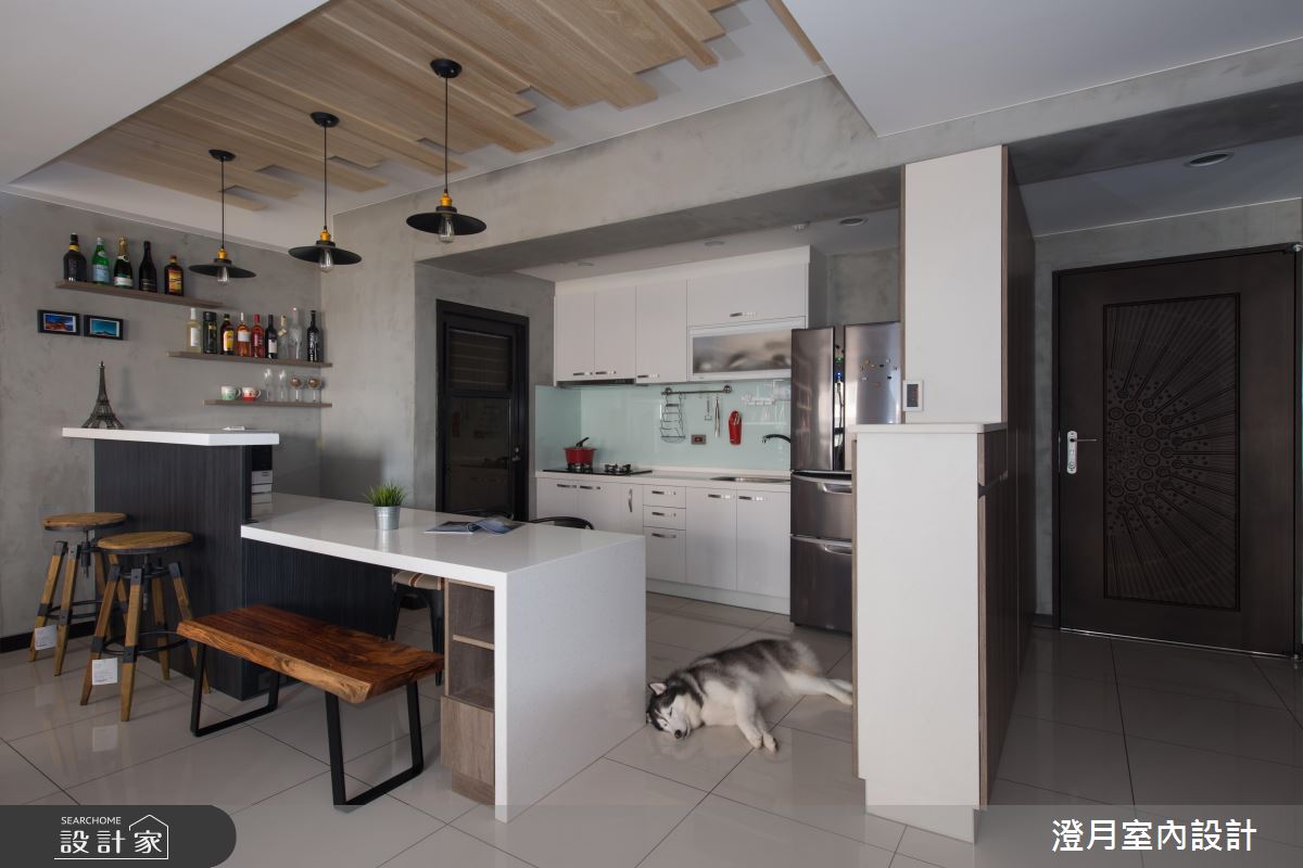 入口右側以鞋櫃界定出玄關與餐廚領域,室內則利用架高木地板串連客廳與書房區,拆除沙發背牆後,形塑開放式書房,讓居家環境變得更寬闊,哈士奇也更能活動自如。電視牆以仿清水模的水泥砂漿做特殊塗料處理,傳遞樸實、個性化的味道,結合木紋收納櫃與展示層板,增添視覺的變化與活潑度,一旁則利用訂製世界地圖輸出壁貼的黑板漆,佈滿屋主旅行時的照片或明信片,讓旅遊的回憶成為一面風格端景牆;考量樑柱結構問題,餐廳的天花板特別以木作拼接方式呈現,且將餐桌與中島串連,滿足屋主平日喜愛烹調的習慣,牆面上搭建高低錯落的層板,陳列著平時收藏或被贈與的佳釀,偶爾小酌一番,或與三五好友相聚談心的催化劑。