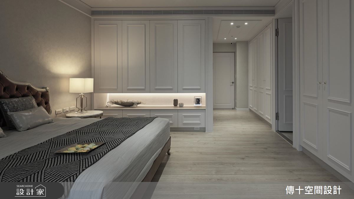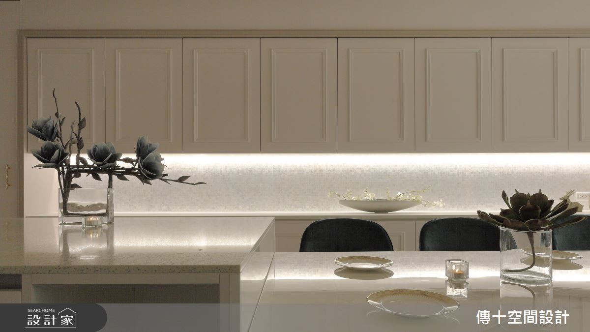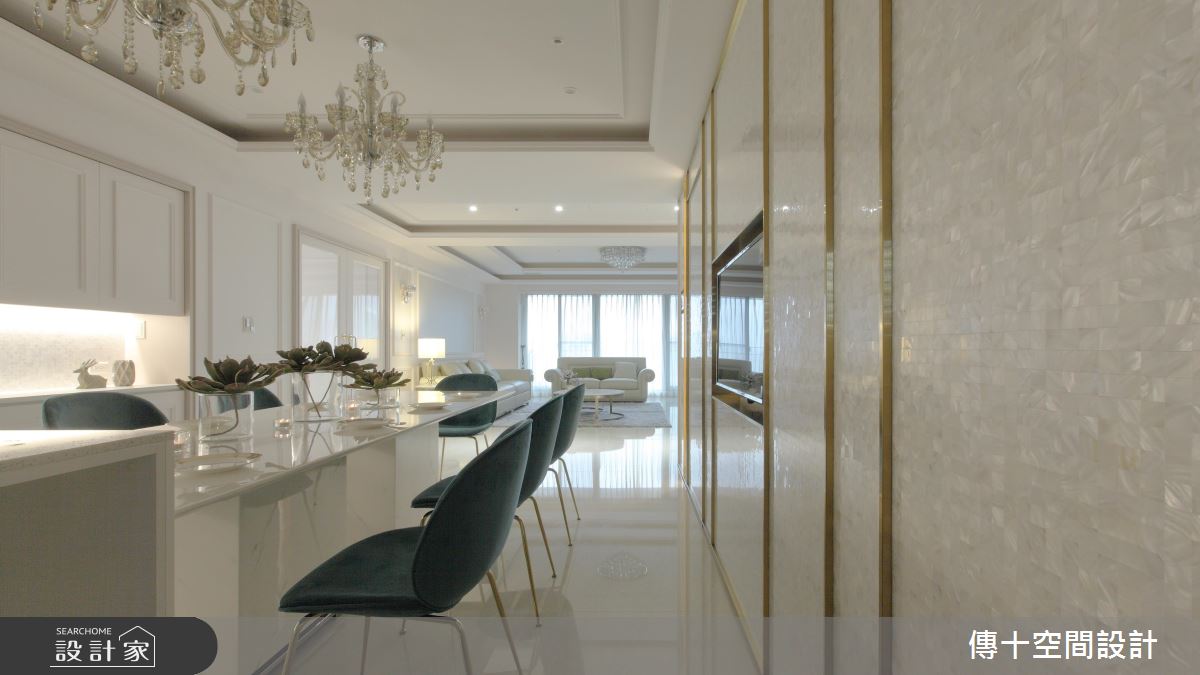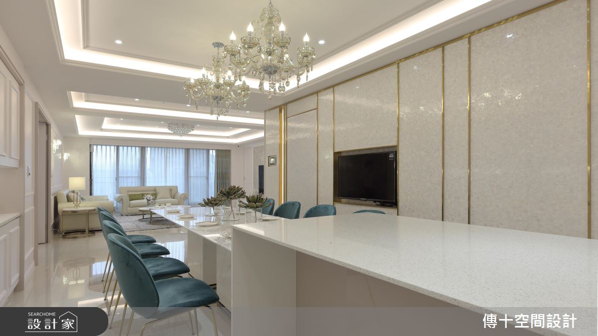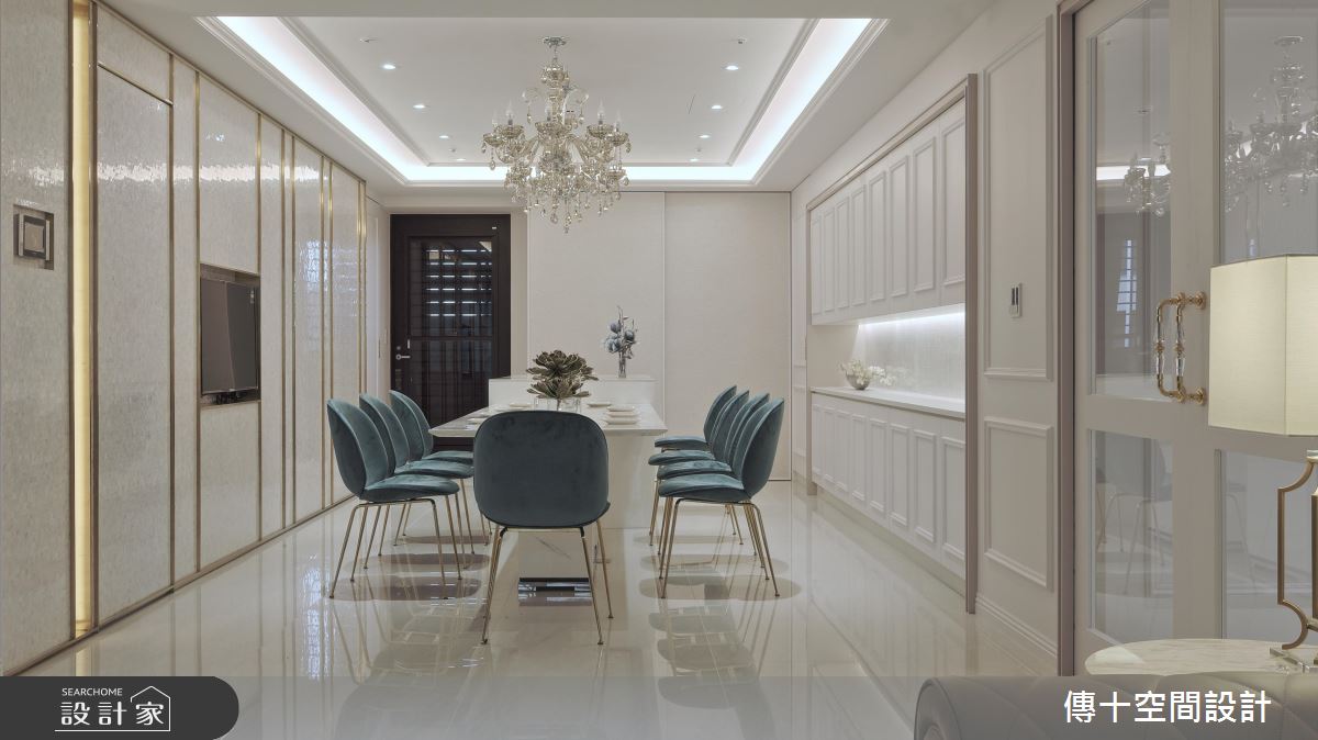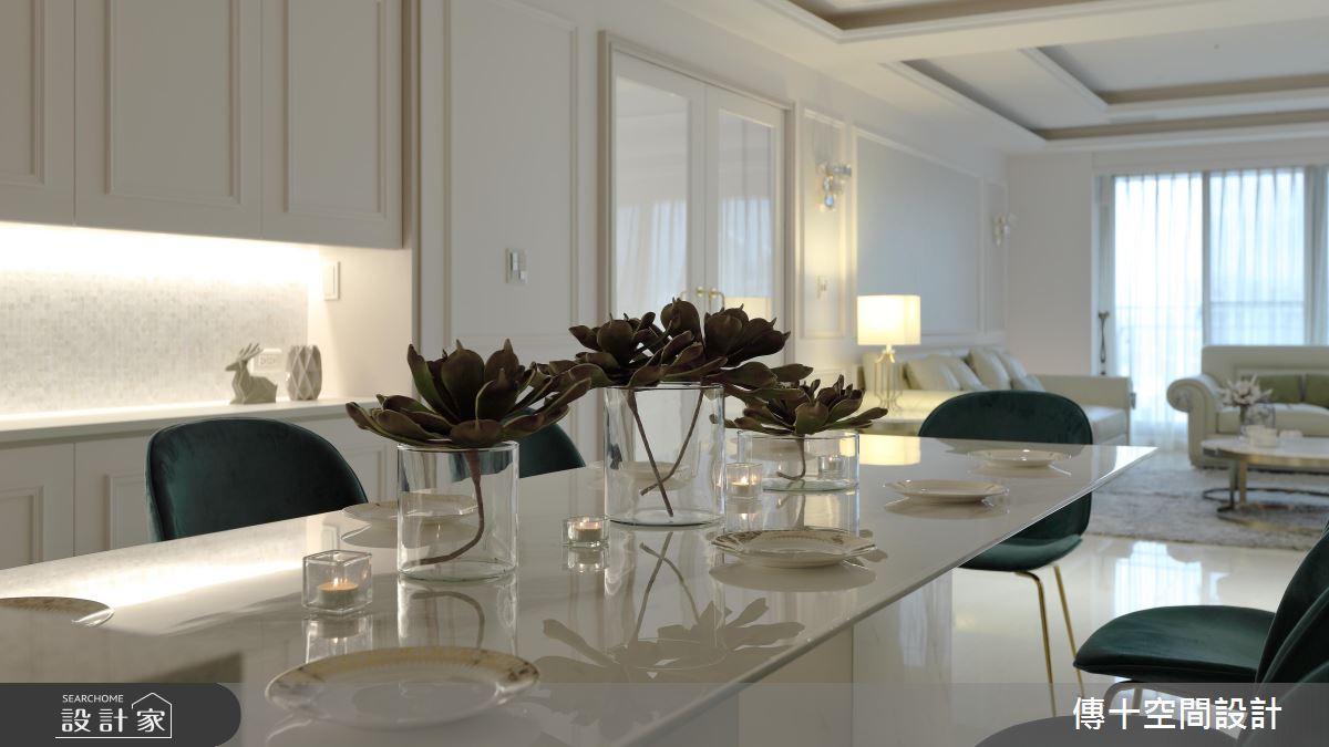 整體援引採光佳、空氣流通佳的特質,將公領域整合為開放式空間,塑造直接而流暢的生活動線,搭配簡潔的白色基調,讓古典式樣顯得低調而輕盈,同時裝飾些許金色元素,妝點時尚藍色餐椅等物件,適度提升空間彩度;並於客廳沙發旁側安排玻璃門片,讓視線延伸及光線得以滲透,加強空間寬闊感,串起視線的流通;另設計三大儲物櫃供使用,使各場域都享有充裕的收納機能,滿足一家人生活所需!