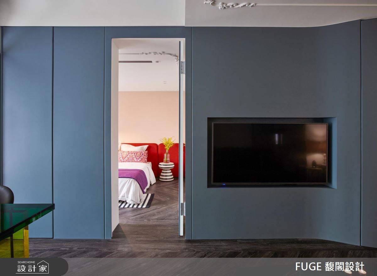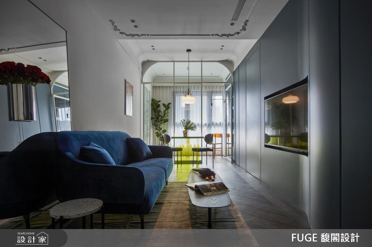 迎賓入口,以雕塑品概念打造的弧形牆分野領域,創造獨一無二的行走動線,同時施展拉寬客廳的視覺魔法,柔和的線條更將視線引領至各角落。從入口一路延伸至室內的弧形牆面,收整電視與收納機能,延展長型格局的視野深度,打造恰如其分的寬敞感。沙發選擇絨布材質彰顯尊榮感,搶眼的皇家藍則成為空間主導色,搭配落地鏡的運用,昇華生活質感!天花處簡約的法式線板,豐富頂端視角層次細節,點綴精緻與優雅氣氛。主臥寢具及床頭牆的配色大膽有趣,與收納櫃及家具的配合,展現活潑的摩登藝術,次臥空間較小,利用梯坪設計將衣櫃機能隱藏至架高的床板下,打造截然不同的空間感!