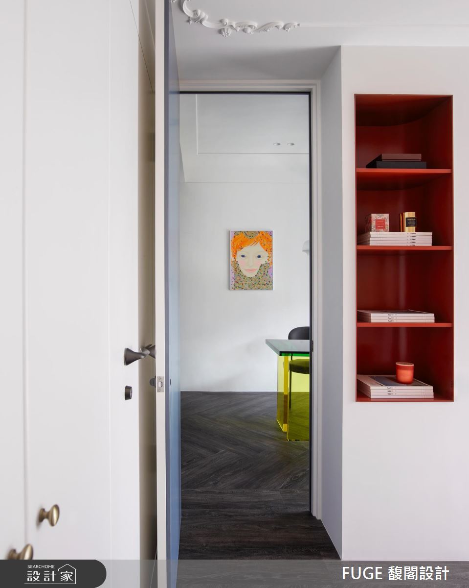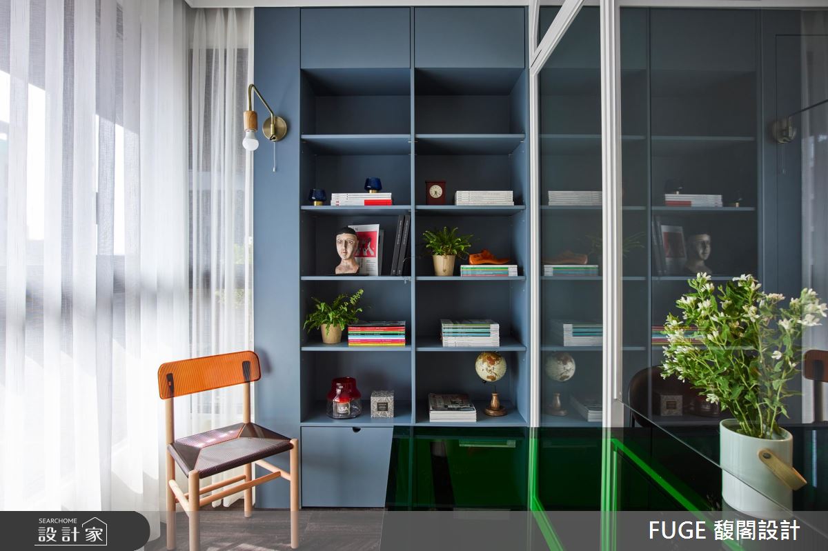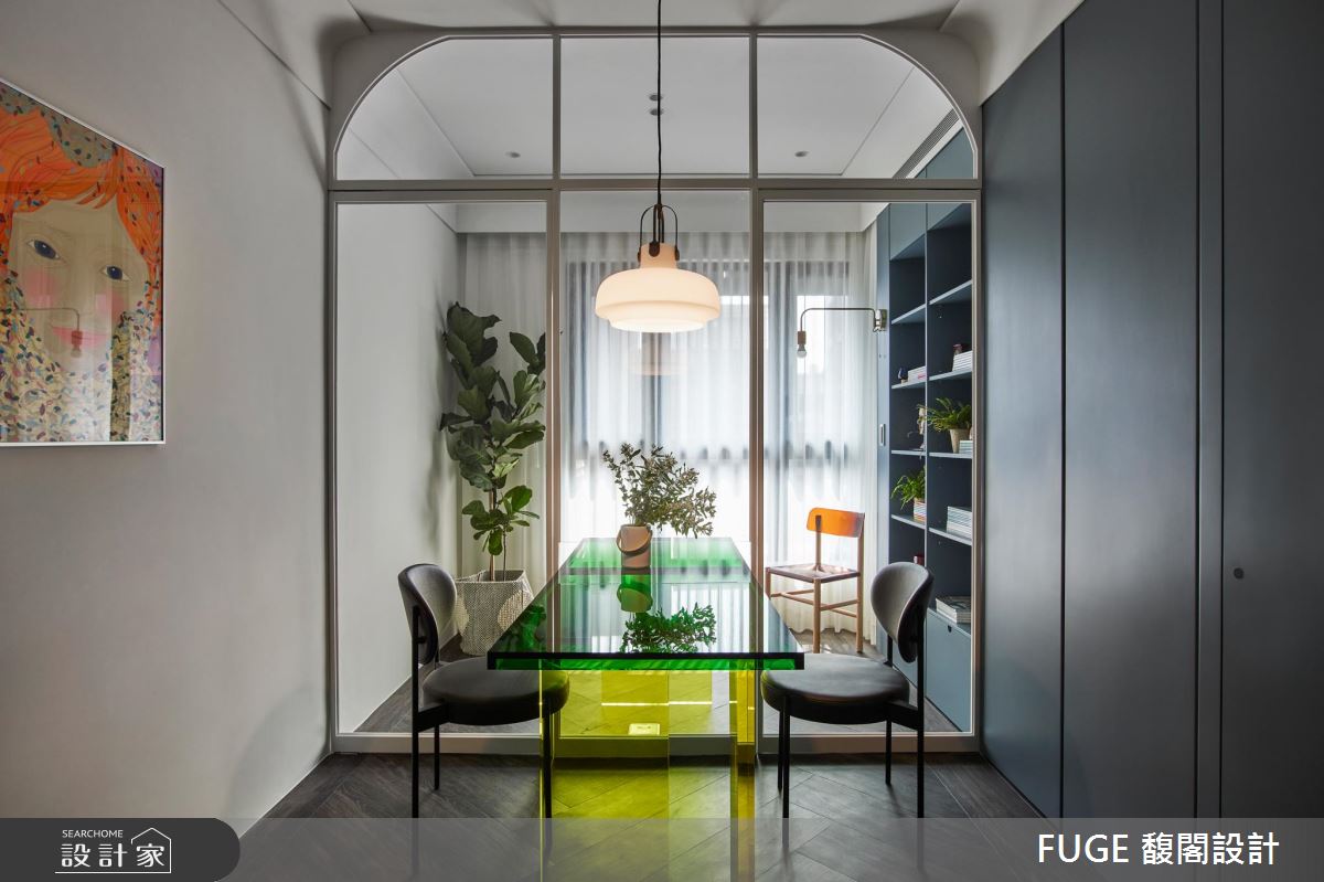 餐廳與書房,透過桌面的壓克力媒材延伸應用,打造緊密又獨立的空間感,特殊選色與藝術家高雅婷的版畫相映成趣,完美演繹藝術即生活的空間理念。