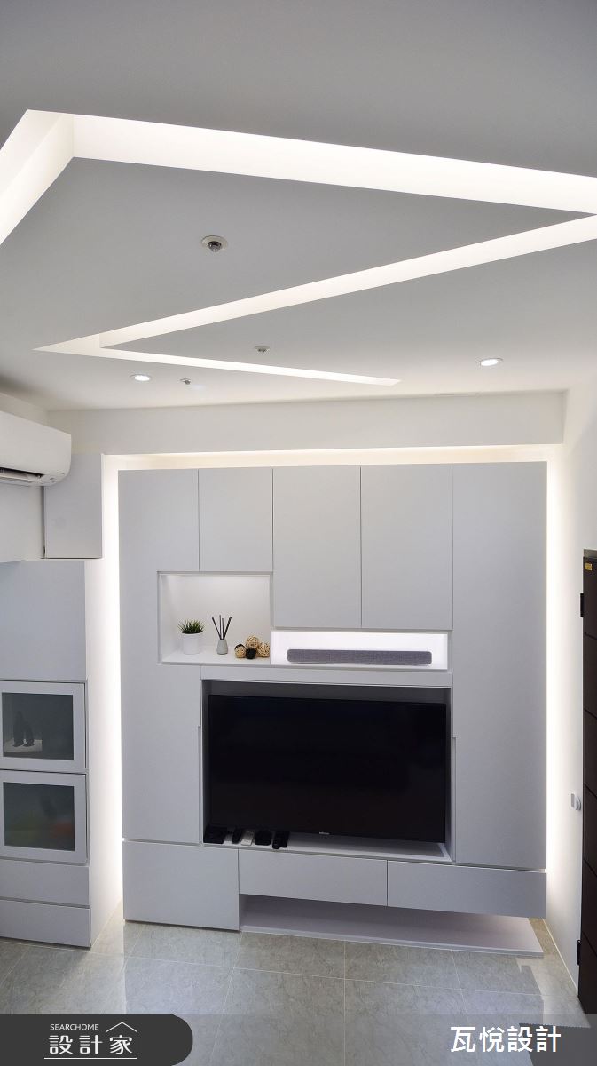 客廳天花板運用不規則造型,讓空間有放大的效果。而一整面白色電視牆,規劃了完整的收納功能,且運用間接照明打造ㄇ形光帶,使空間更具立體度。廚房採取相同色系,無違和地結合櫃體、冰箱與廚具,將立面收整乾淨。書房則透過架高的方式,融合樓梯下方的收納空間,創造明亮有機能的閱讀環境。