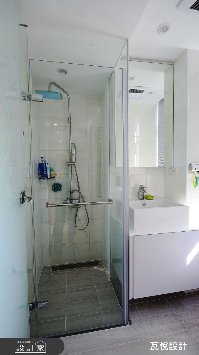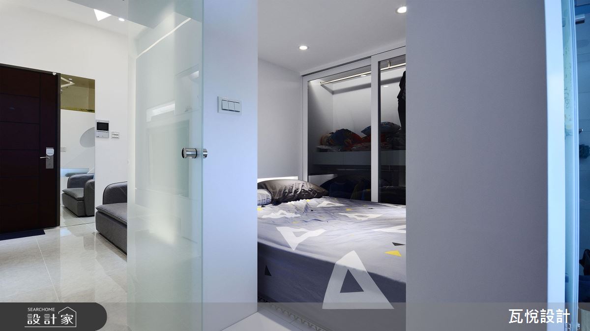 推開廚房旁的拉門,主臥規劃大面積的清玻璃衣櫃,讓空間不會有壓迫感,並採取噴砂玻璃妝點牆面,讓光線可以透進臥房中。兒童房選擇玻璃隔間,讓空間保持開闊感,而鑲有鏡面的拉門後方,則隱藏另一間小孩房,讓彼此擁有獨立空間。衛浴選用乾溼分離的方式,營造整潔的洗滌場域。