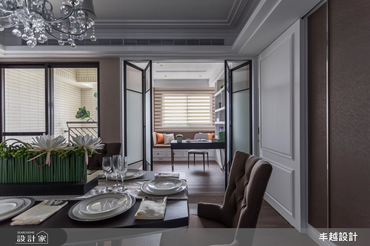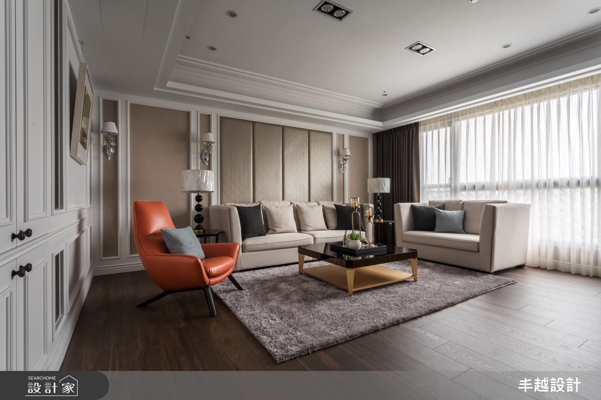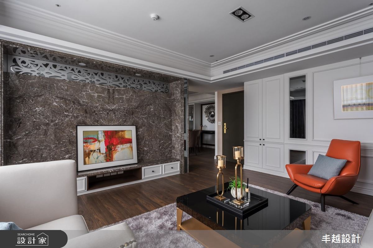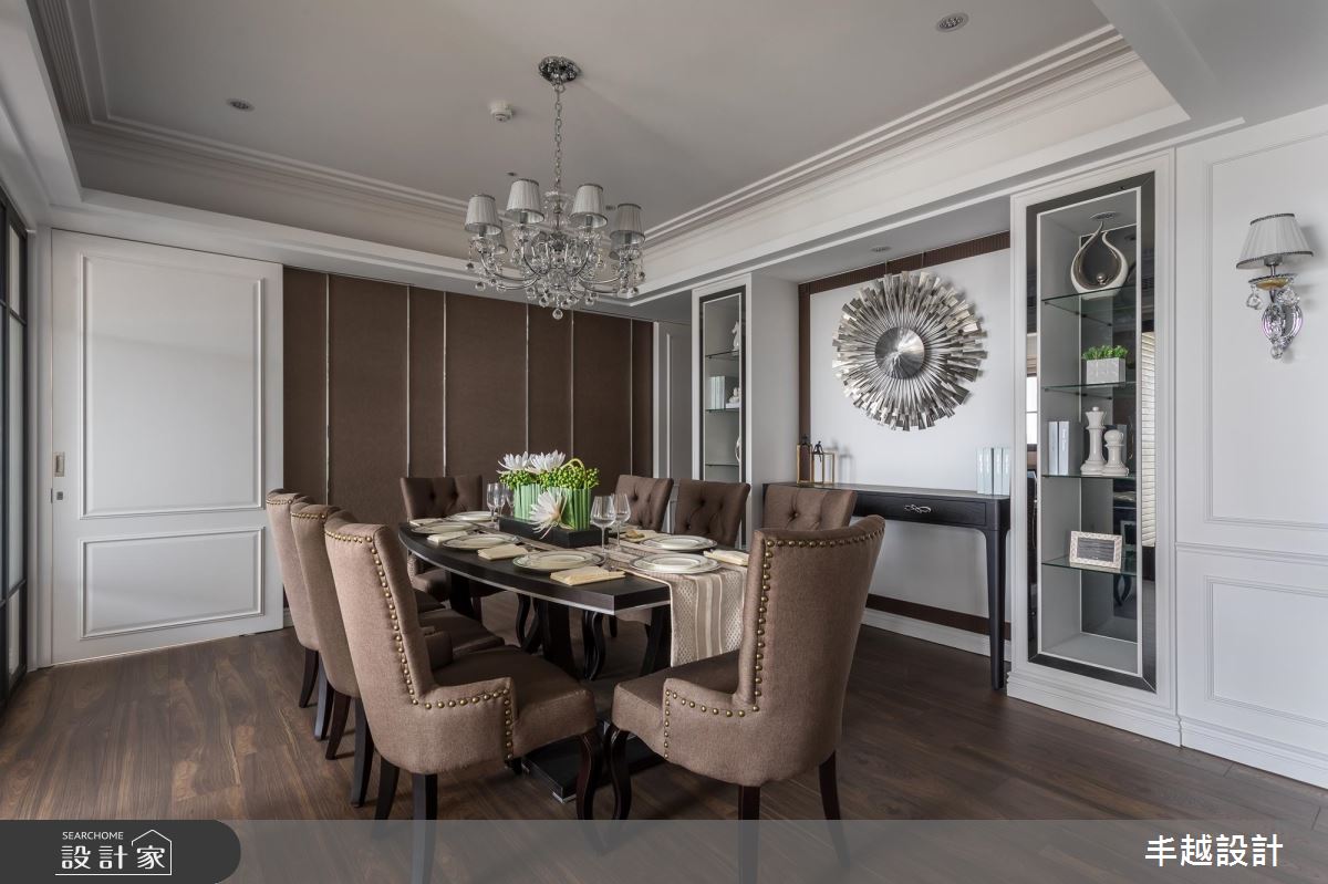 客廳的沙發背牆藉由同色系、異材質的紋路變化,讓立面充滿層次;靠近玄關的牆面運用白色線板及鏡面,妝點收納櫃。而電視牆則選擇天然大理石,搭配雷射雕刻板,營造高雅的視覺感受。餐廳採取銀白的牆飾與水晶吊燈,點亮以駝色為主視覺的空間,且在展示櫃添加明亮鏡面,提升室內的華麗感。