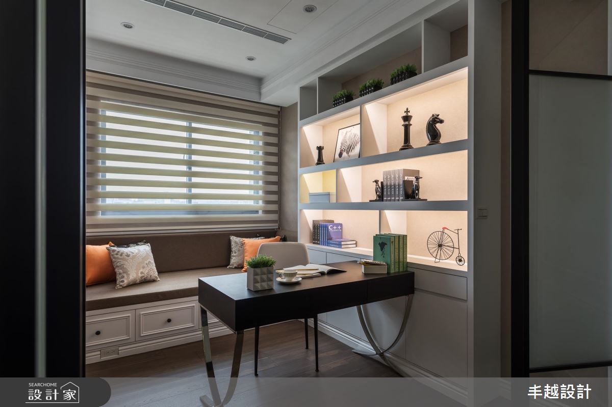 開啟書房的黑框摺疊門,充足的陽光迎面而來;隱藏收納功能的深棕臥榻,與一整面白色書櫃,形成豐富的機能性。
