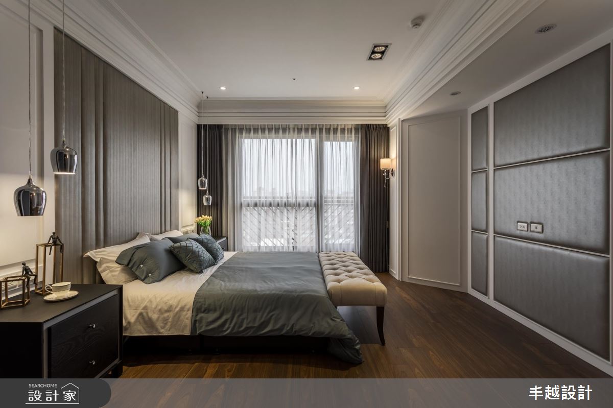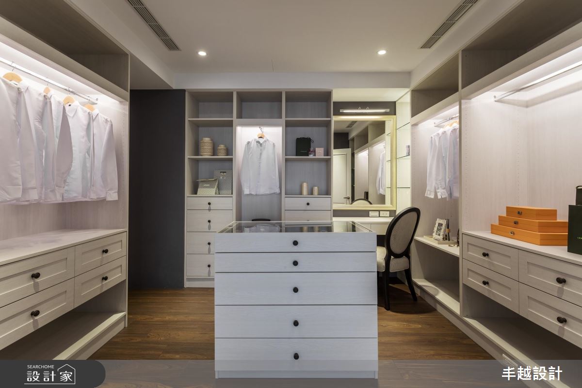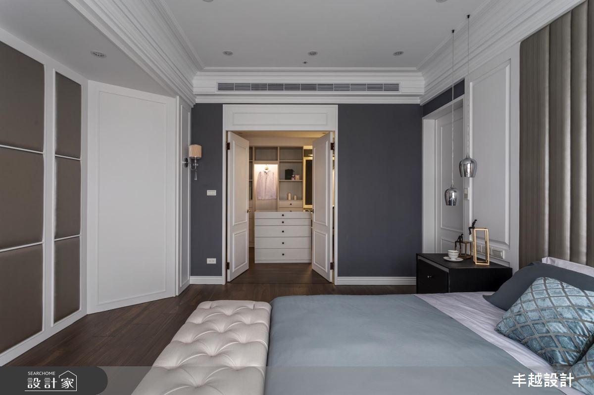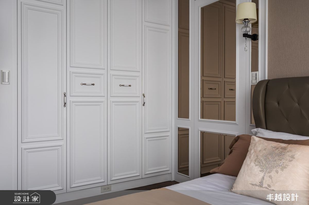 主臥選擇灰色系為主色彩,並運用直線和格狀方式裝飾牆面,展現不一樣的皮革質感。推開主臥的對開式門扉,更衣室規劃淺色木紋的櫃體,分門別類收納衣物,維持空間的整潔度。次臥採取線板語彙,對稱排列了茶鏡及收納櫃門片,結合出優雅的休息氣氛。