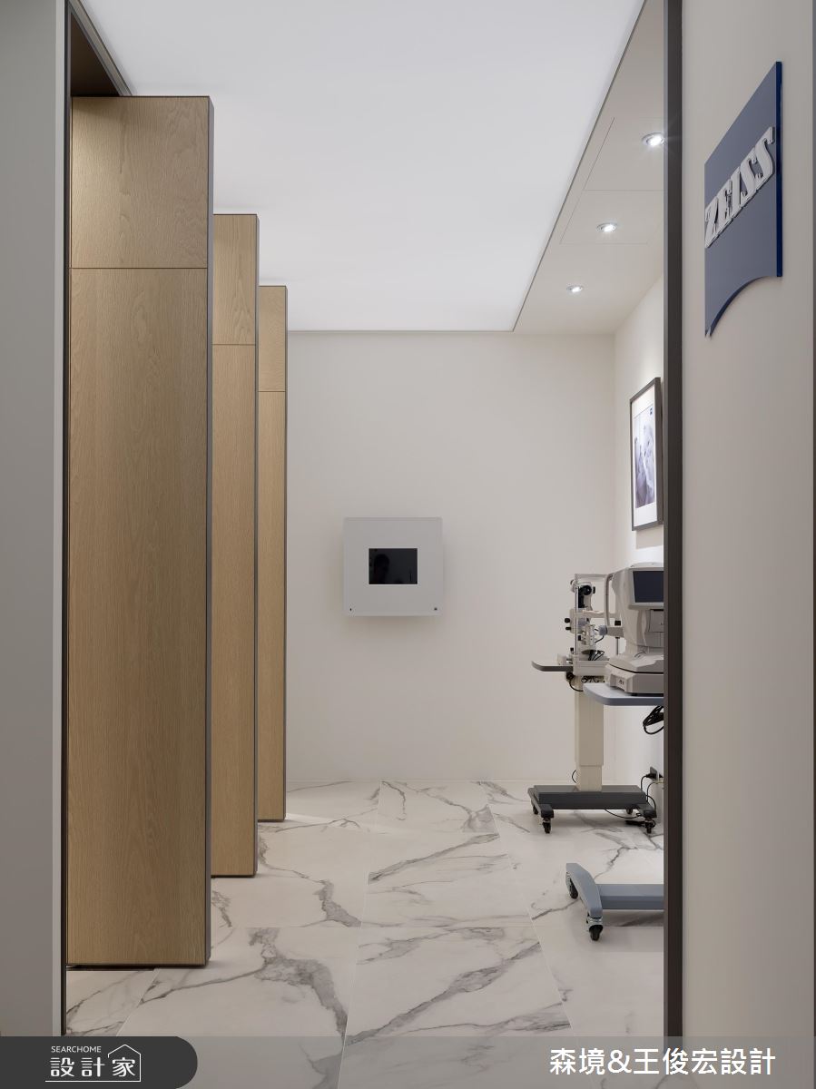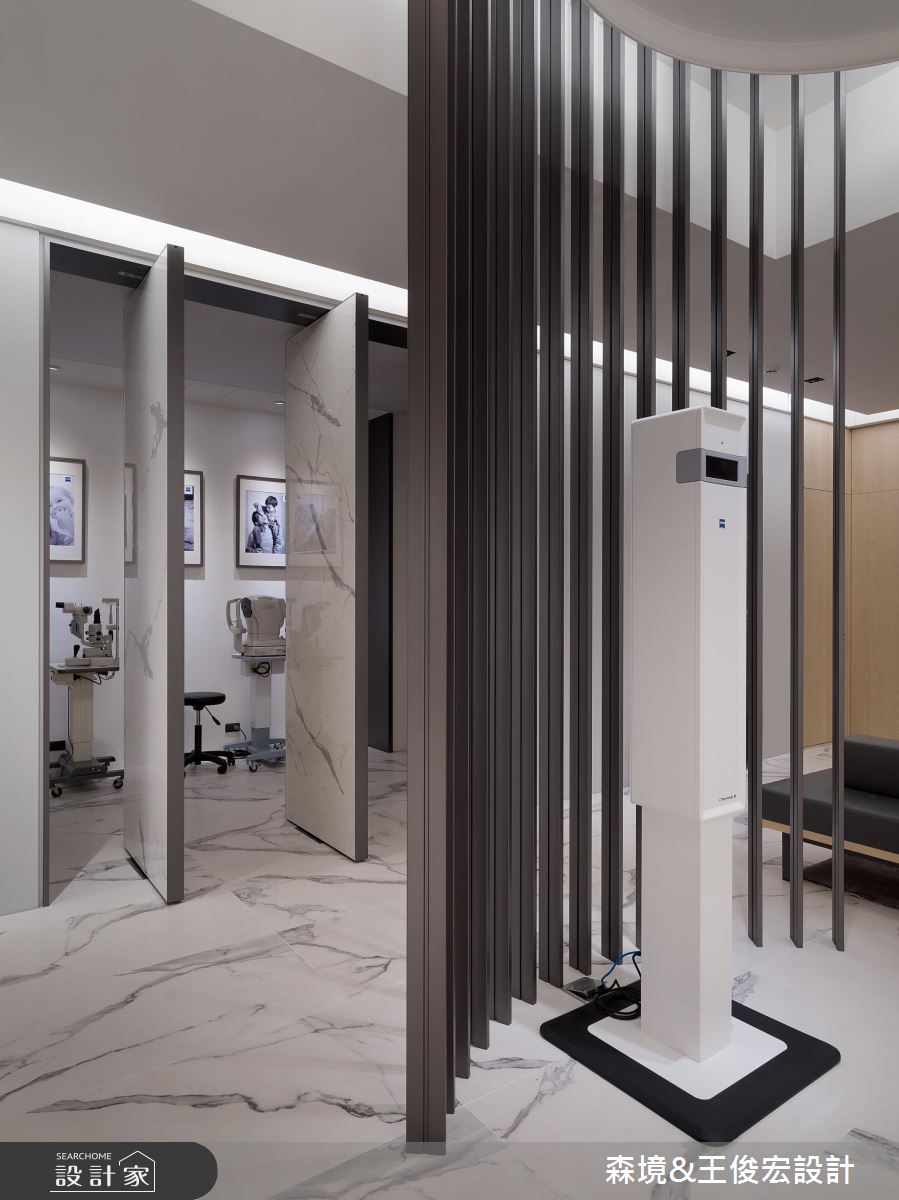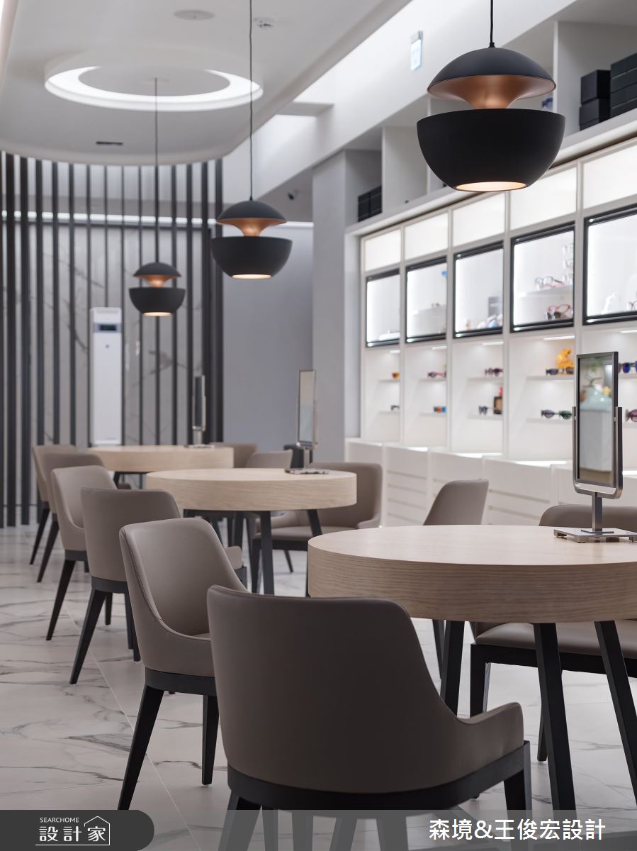 推開大門迎來的開放空間,拋開眼鏡行傳統空間概念,擺上一張張圓桌,彷彿時尚咖啡廳般拉近業主與客戶間的距離;使用區塊的分界,以格柵、活動門巧思拉寬店內空間感;優雅燈飾、如眼鏡盒造型的天花板設計,則隱喻瞳孔意象,處處讓人感受設計師發揮巧思用裝潢設計傳遞品牌核心。