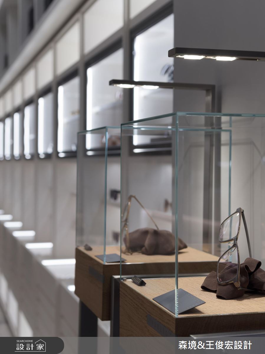 懸於立面的展示櫃及玻璃櫃,打造獨樹一格的精品陳列區,依序擺放的眼鏡,讓顧客一目了然,玻璃櫃的設計,讓客人有如置身博物館般,一覽工藝品的精湛之美。