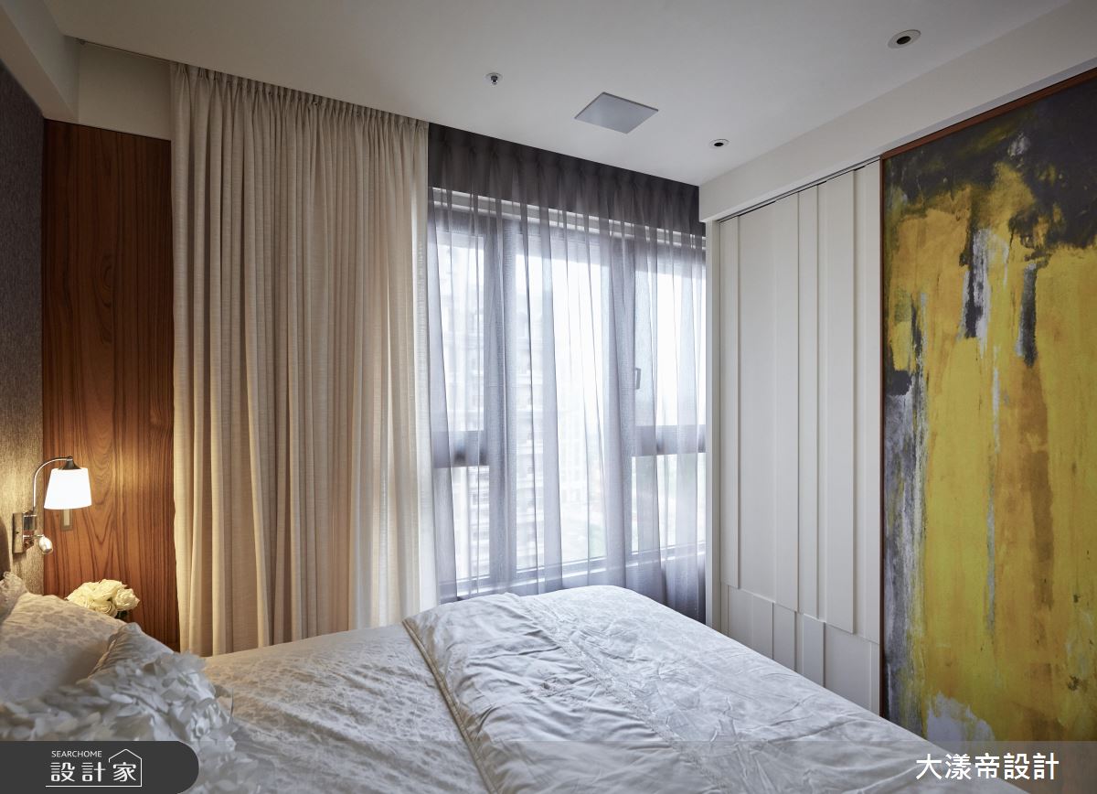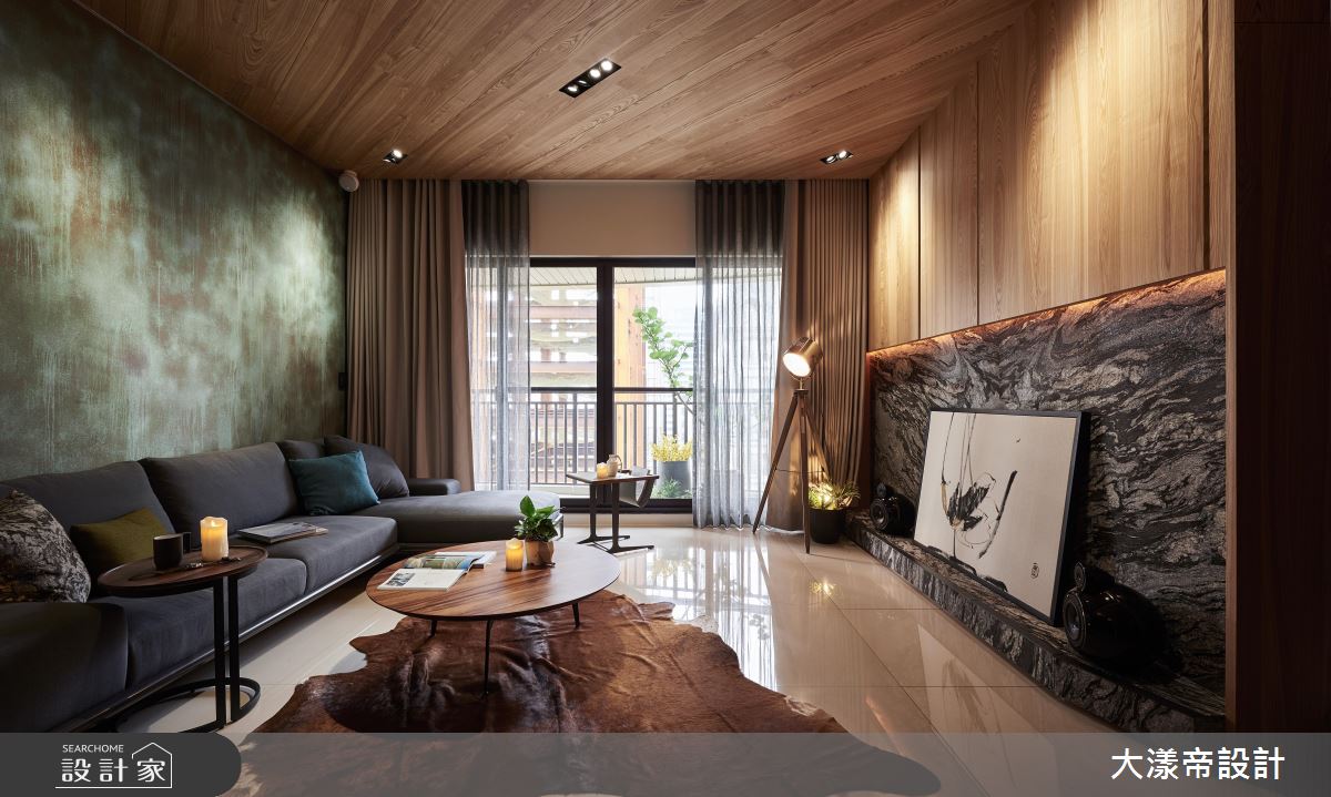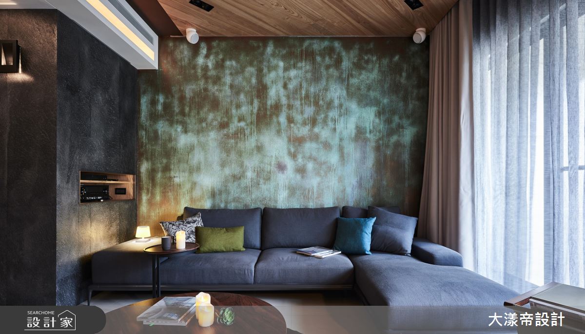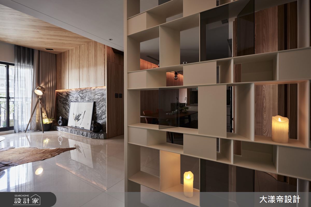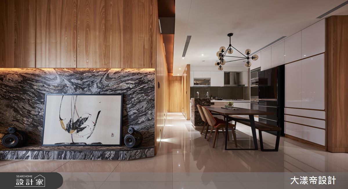 公領域,規劃拉高的天花板,並舖貼斜紋木皮,讓空間衍生拉伸放大的效果,搭配溫潤的木家具,構築充滿暖意的視野,但同時大膽加入創意亮點,像是於主要電視牆做出獨特造型,或在沙發牆渲染鮮明的色彩,帶出引人入勝的焦點畫面;空間內牆體兼具儲物與展示作用,完善界定不同的使用區域,並打造白色簍空格子屏風,展現獨創的視覺表現;循著廊道步入臥室,則可見布藝繃出的床頭沉穩表情,但與之呼應的牆面卻創新地給予潑墨處理、形成鮮明對比,創造風格獨具的寢居韻致!