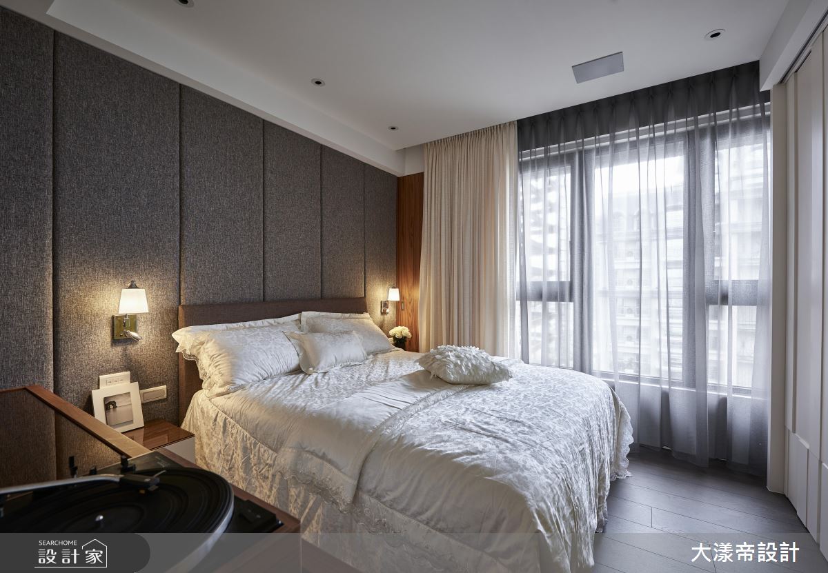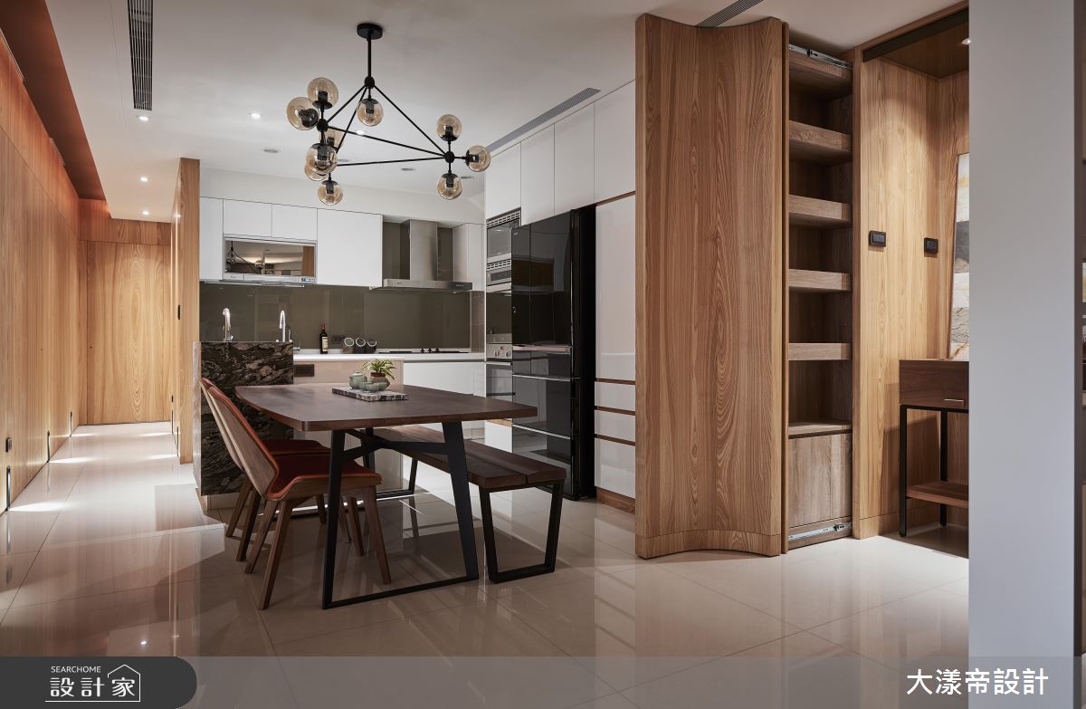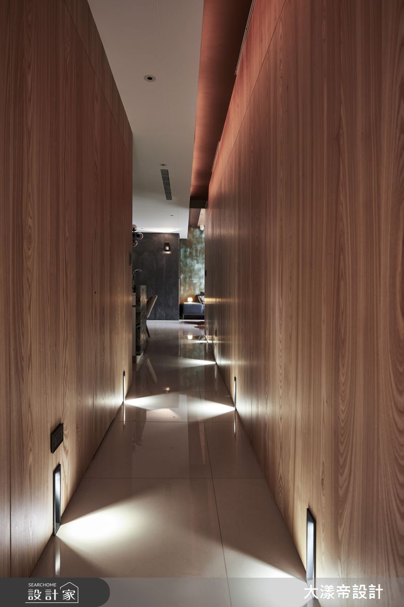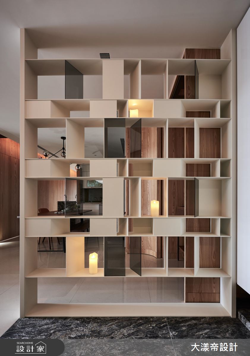 公領域,規劃拉高的天花板,並舖貼斜紋木皮,讓空間衍生拉伸放大的效果,搭配溫潤的木家具,構築充滿暖意的視野,但同時大膽加入創意亮點,像是於主要電視牆做出獨特造型,或在沙發牆渲染鮮明的色彩,帶出引人入勝的焦點畫面;空間內牆體兼具儲物與展示作用,完善界定不同的使用區域,並打造白色簍空格子屏風,展現獨創的視覺表現;循著廊道步入臥室,則可見布藝繃出的床頭沉穩表情,但與之呼應的牆面卻創新地給予潑墨處理、形成鮮明對比,創造風格獨具的寢居韻致!