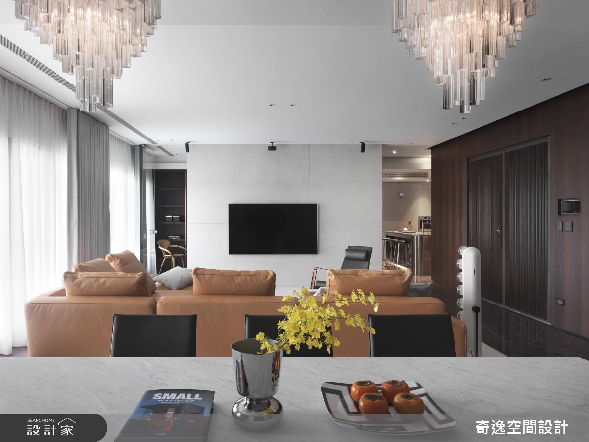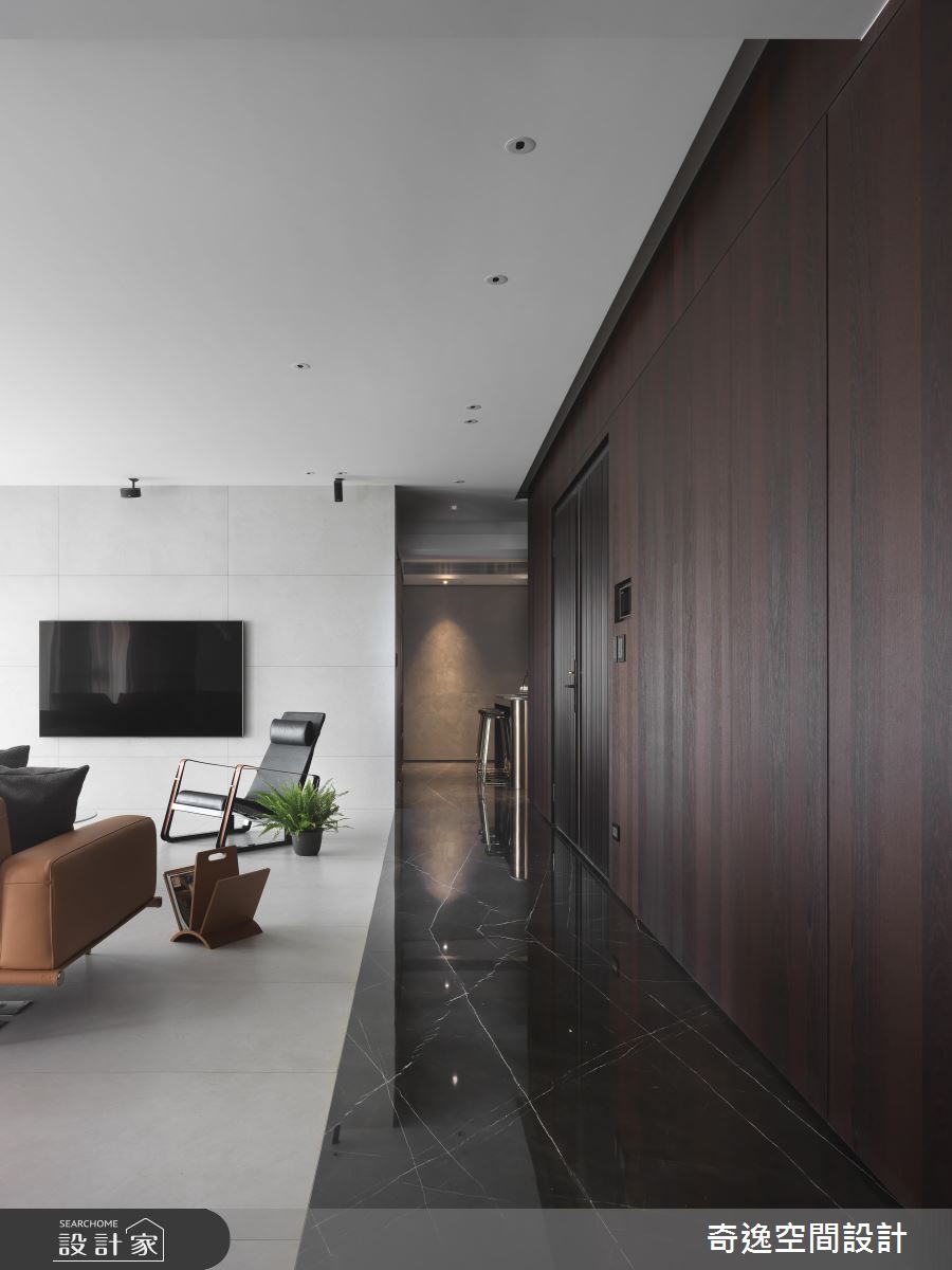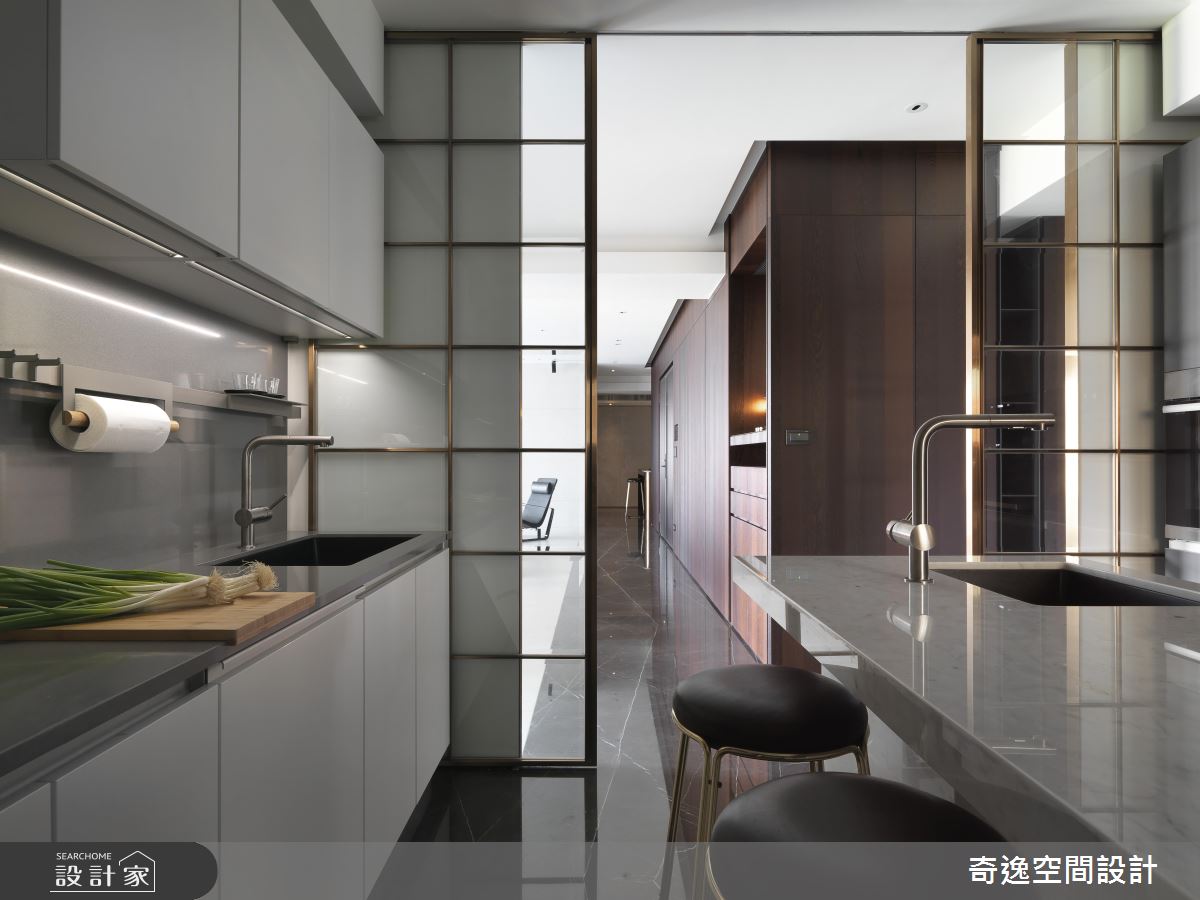 公領域地坪利用深淺及材質分野,劃出清晰的廊道界線;客廳橙色 L 型沙發張力十足,襯托開放空間氣勢,天、地、壁的淺色系應用,模糊界線,讓視覺無限延展;廚房透明拉門格線別出心裁,以玫瑰金材質細節,流露高貴質感;廊道間的中島吧檯,作為各空間的中樞地帶,提供居者早午餐、夜晚小酌等時光多一處選擇;主臥與孝親房皆採以木質材鋪上私領域的溫潤,溝縫的間接燈帶,表現精緻的寢居樣貌,而孝親房運用藕色主導視覺手法,散發出沉穩而閒適的氣韻。