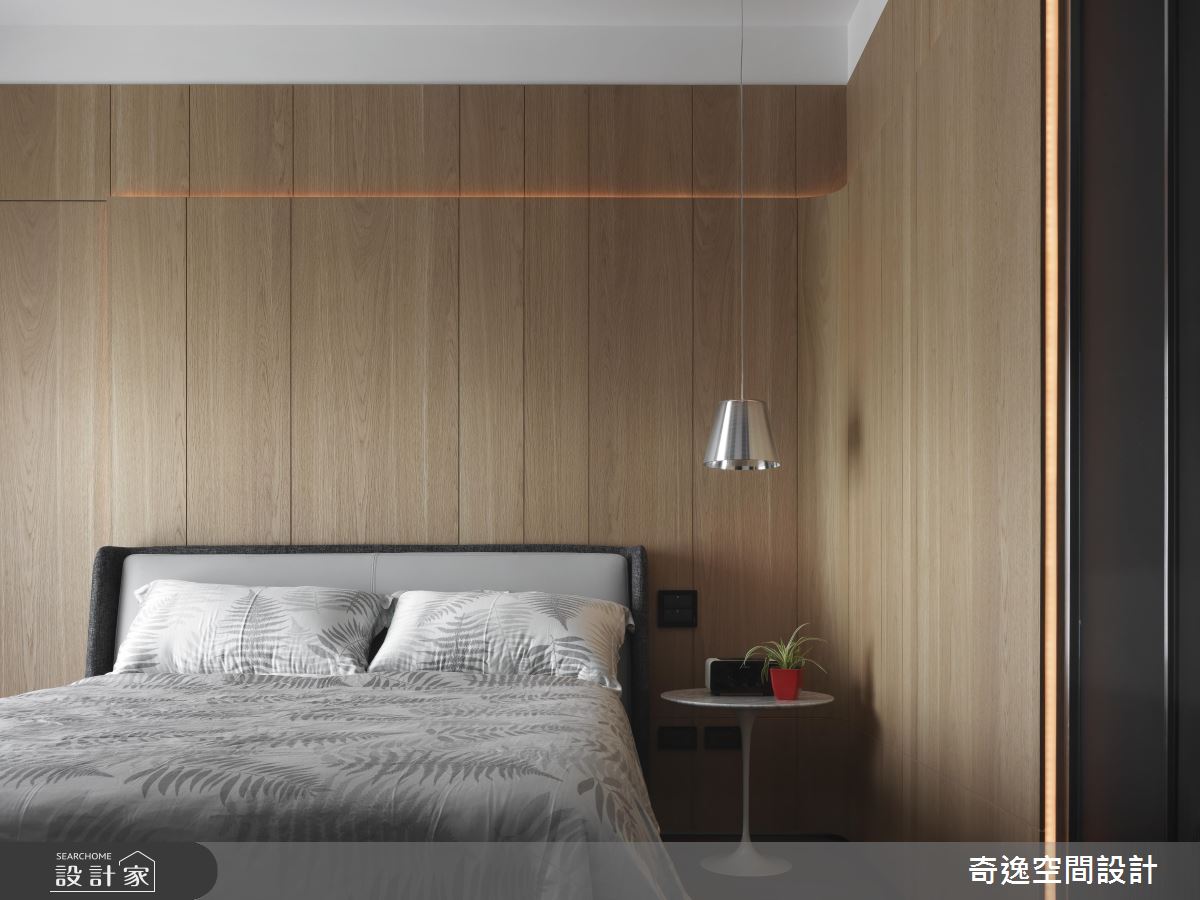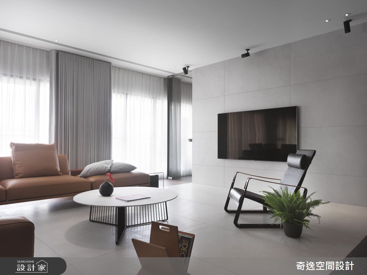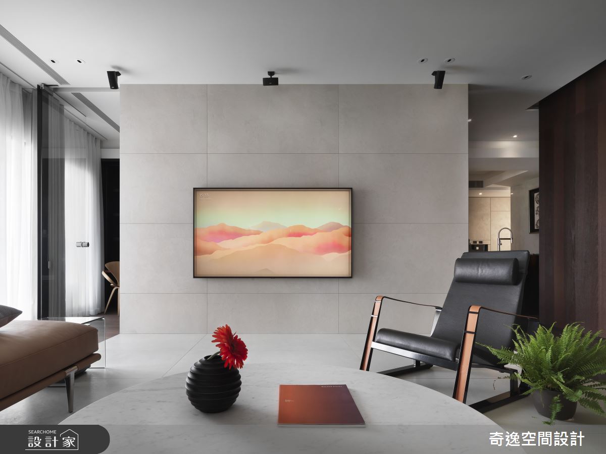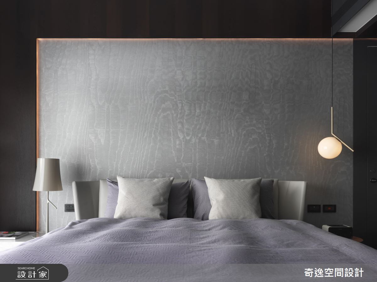 公領域地坪利用深淺及材質分野,劃出清晰的廊道界線;客廳橙色 L 型沙發張力十足,襯托開放空間氣勢,天、地、壁的淺色系應用,模糊界線,讓視覺無限延展;廚房透明拉門格線別出心裁,以玫瑰金材質細節,流露高貴質感;廊道間的中島吧檯,作為各空間的中樞地帶,提供居者早午餐、夜晚小酌等時光多一處選擇;主臥與孝親房皆採以木質材鋪上私領域的溫潤,溝縫的間接燈帶,表現精緻的寢居樣貌,而孝親房運用藕色主導視覺手法,散發出沉穩而閒適的氣韻。