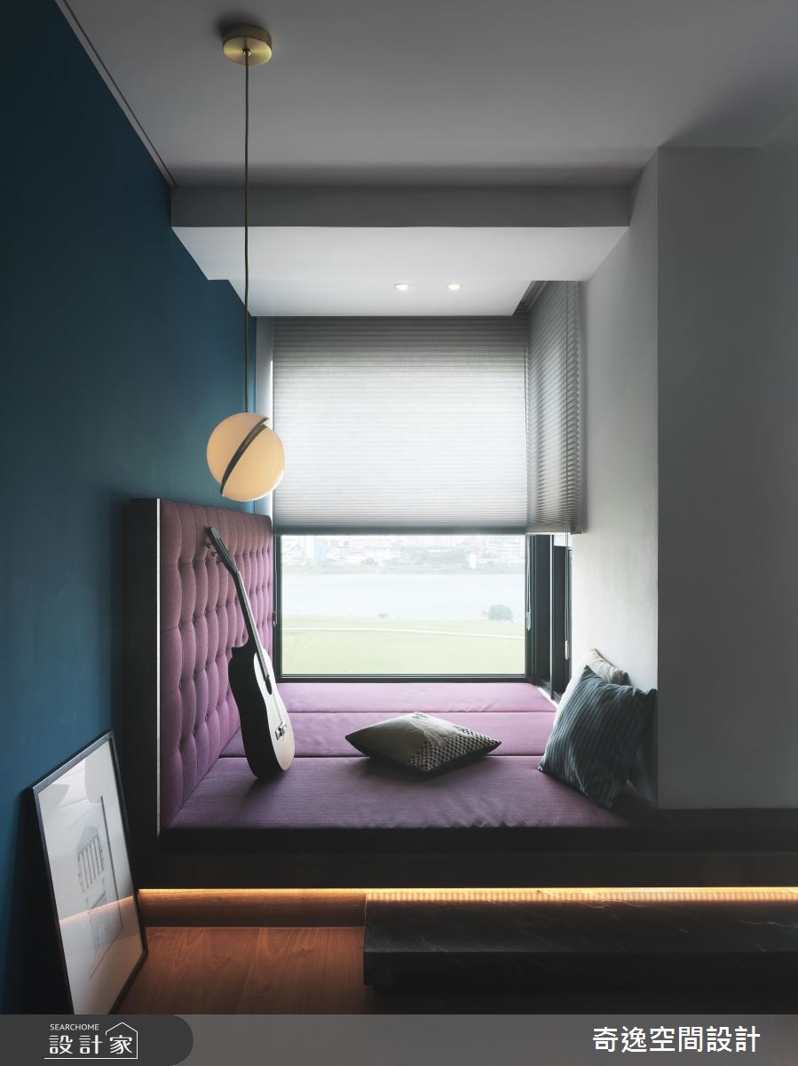 公領域一處角落,以架高的地坪打造臥榻空間,立面與沙發布面的選色,撞出摩登大膽的美學品味,客製化每個獨立場域的特色表情。