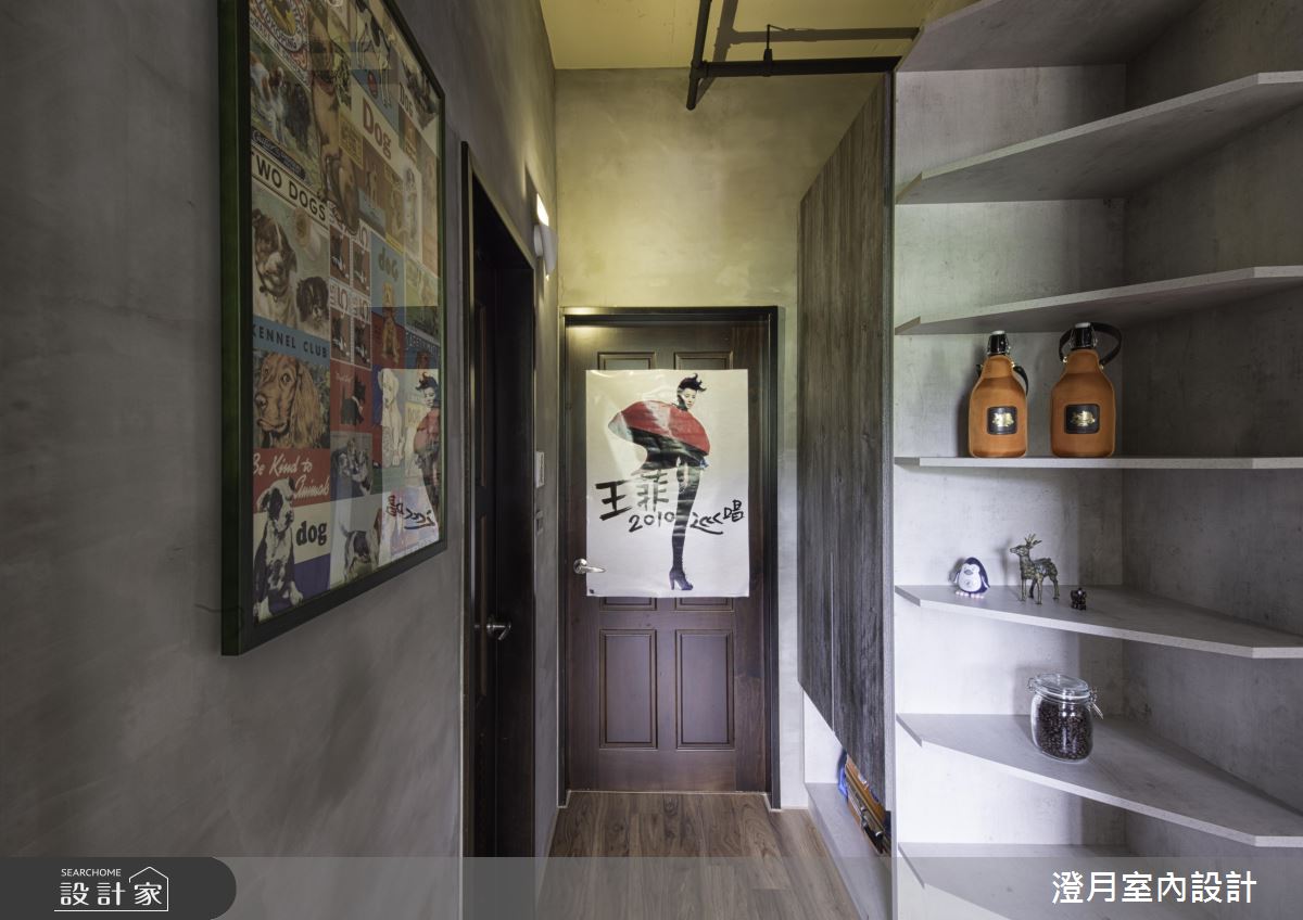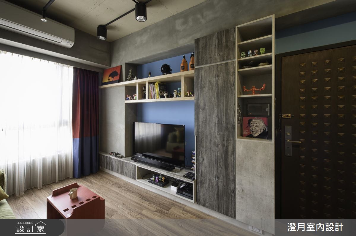 16坪 Loft風住宅,為屋主與兩隻愛貓的共享空間,設計師以水泥質感包覆空間,嶄露工業感的粗獷特質,活潑色彩牆面、簾幕及層架的穿插設計,傳遞與兩隻貓咪生活的趣味情景。
