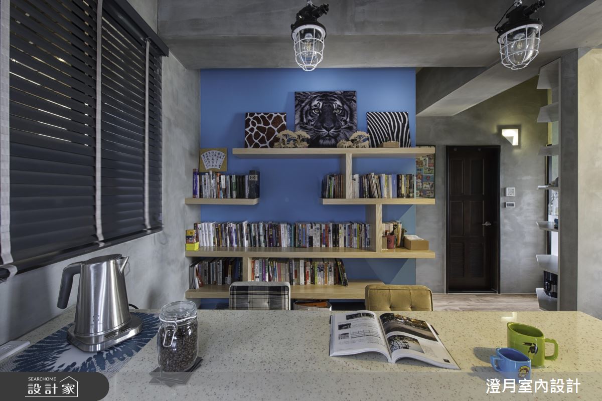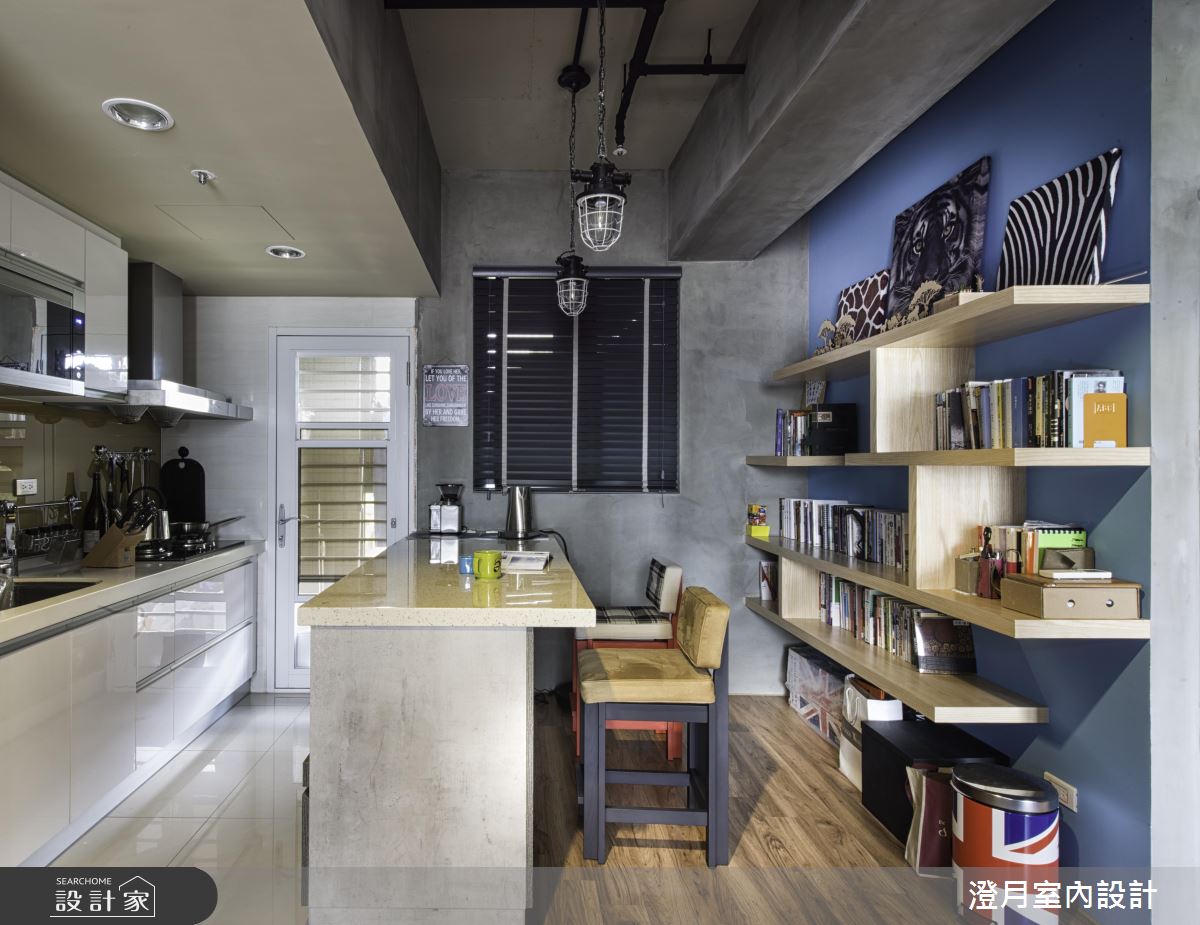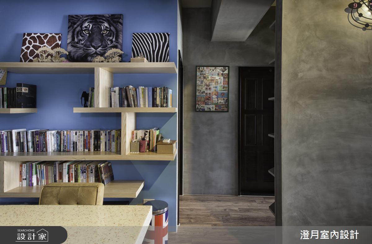 打開大門即迎來客、餐空間,而原格局開門視線對應至廁所,故設計師發揮巧思延伸沙發背牆的泥作砌磚,化解屋主介意的風水疑慮,並讓沙發背牆後方成為充足的收納區。原廚房格局狹隘,室內採光也因此受阻斷,因此讓空間開放結合客廳區塊,大面書牆及吧檯的加入,帶來敞亮通透的生活感受。客廳電視牆、書牆層架刻意用不規則開放式,讓豹貓的活動空間與屋主的生活機能二合一,而牆面的色漆與層架上個人收藏品相映成趣,變身佈置一隅。