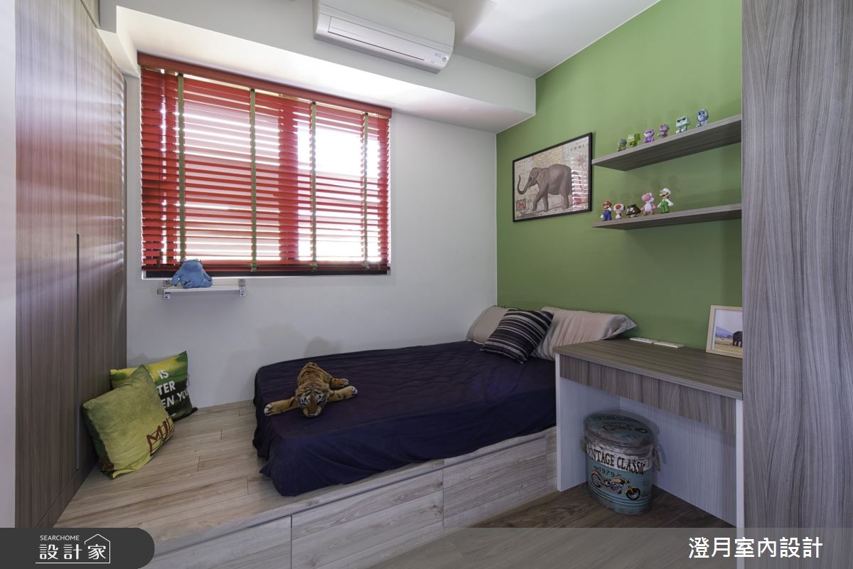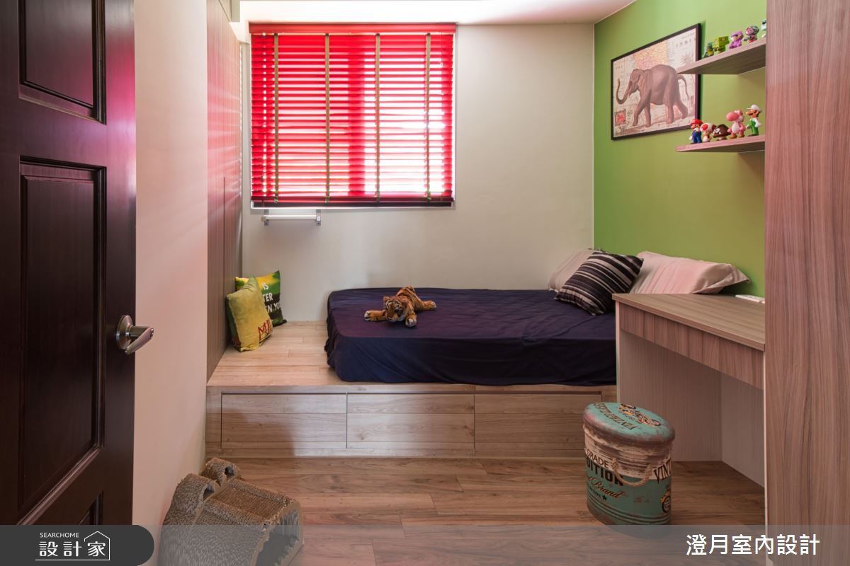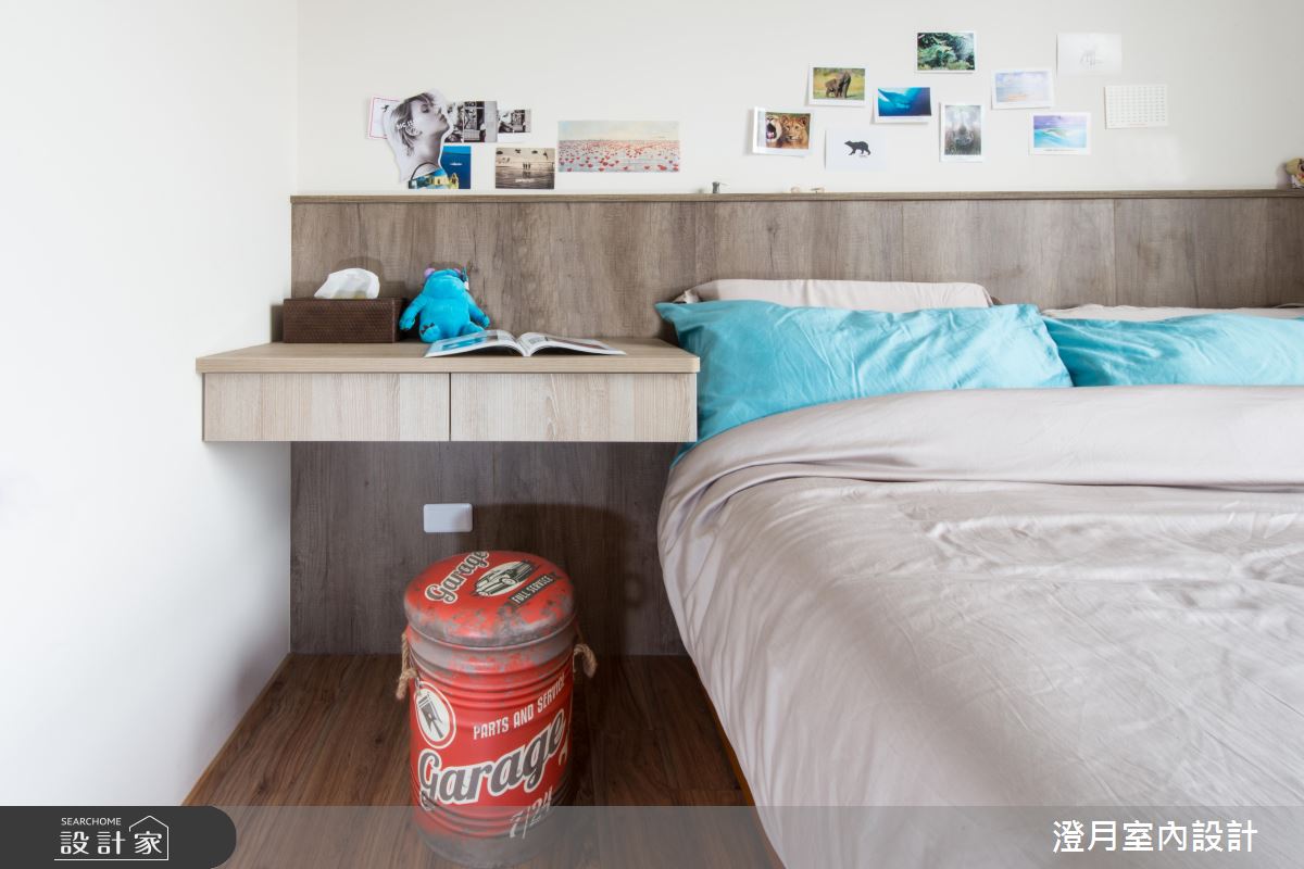 主臥色彩簡練,透過木與白的配色,營造舒眠的就寢氛圍;客房採架高木地板下方抽屜,增添小坪數不足的收納空間,用色大膽與窗簾相呼應,個性有型。
