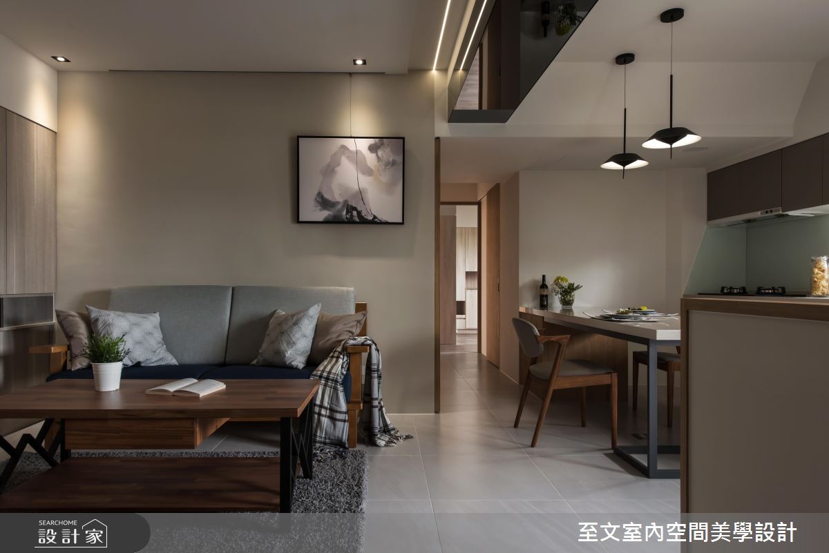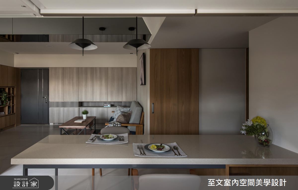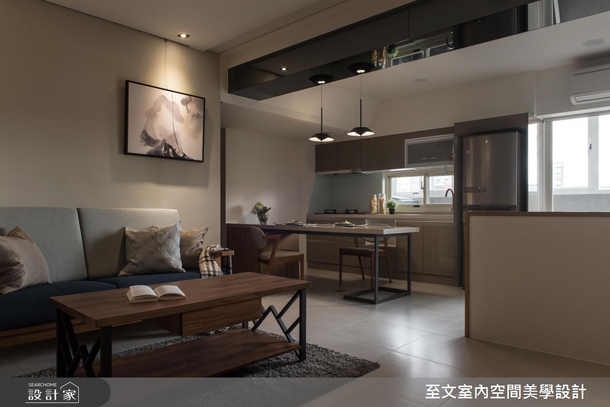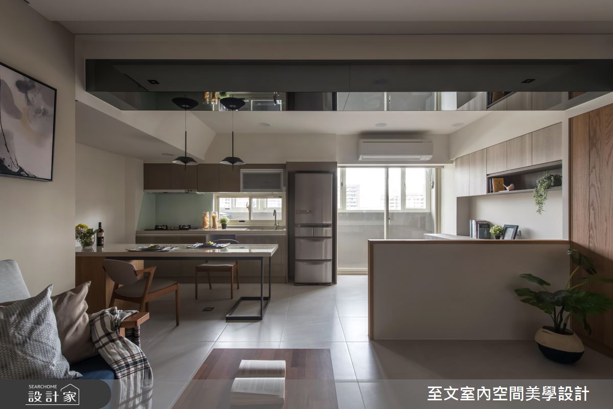 設計師考量原有居家格局不夠方正,且存在樑柱較低且多的問題,於是使用灰鏡包覆樑體,並加入線性燈光做修飾,展現天花板的時尚表情,電視牆則給予大面積木作鋪陳,並劃出俐落線條、形成具有層次感的分割畫面,同時在牆體融入收納與展示機能,美感與功能性兼具;餐廚及書房則規劃成開放式空間,透過客廳、書房及廚房的銜接串聯,開啟密切的場域互動,並讓陽台採光可照亮每一角落,同時將電器櫃設計在餐桌下方,更便於使用,而書桌的 L 型桌檯,亦加大延展了使用面積,並同時圍塑出專屬的範圍!