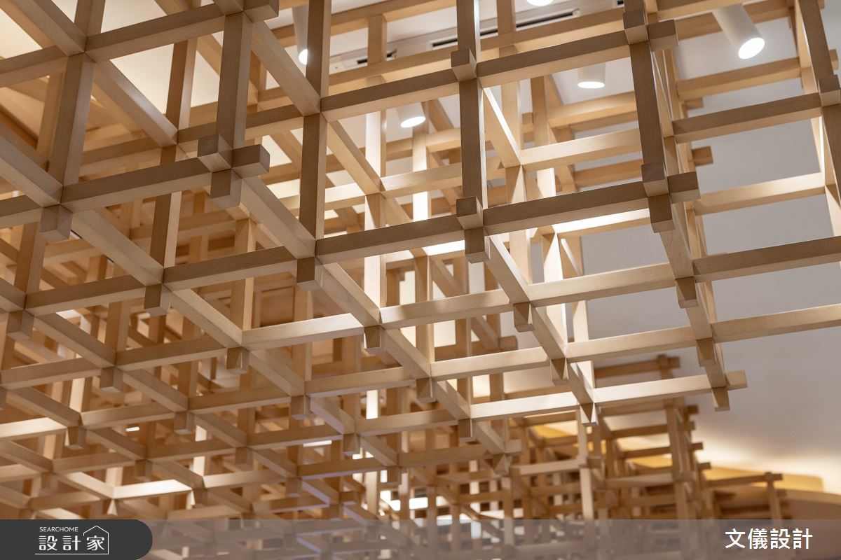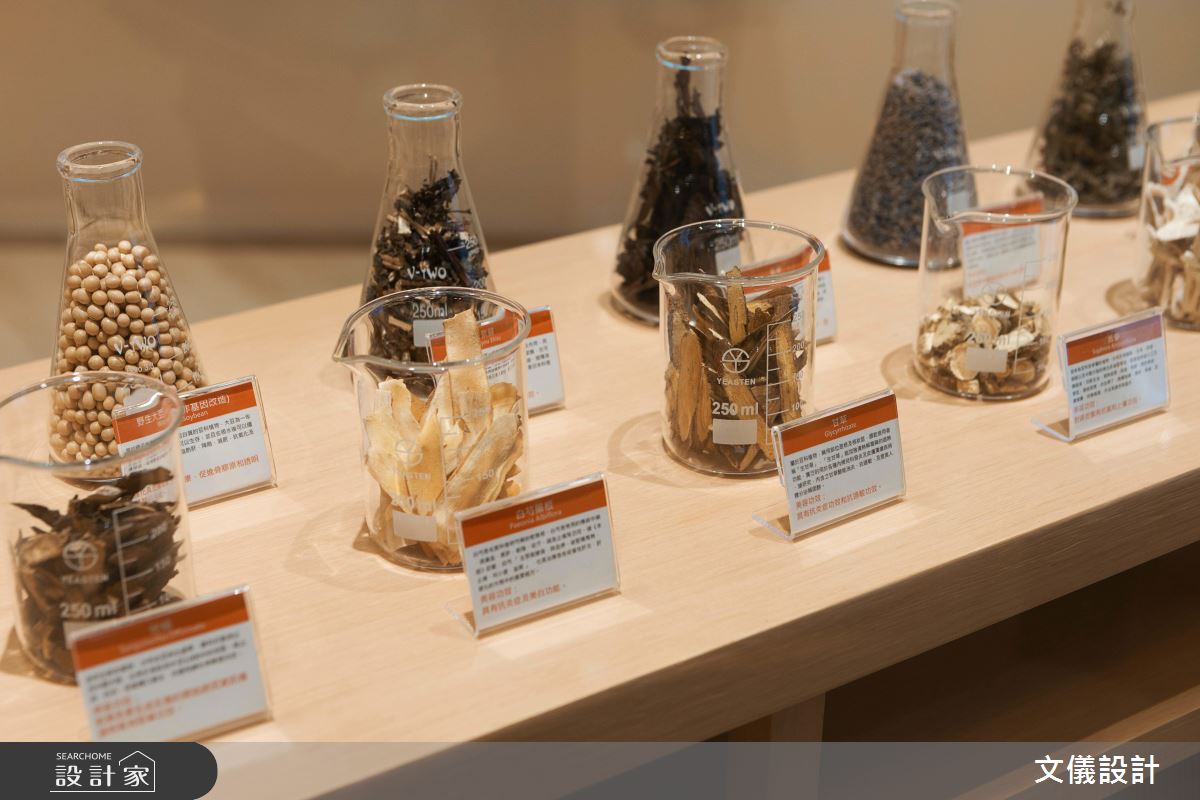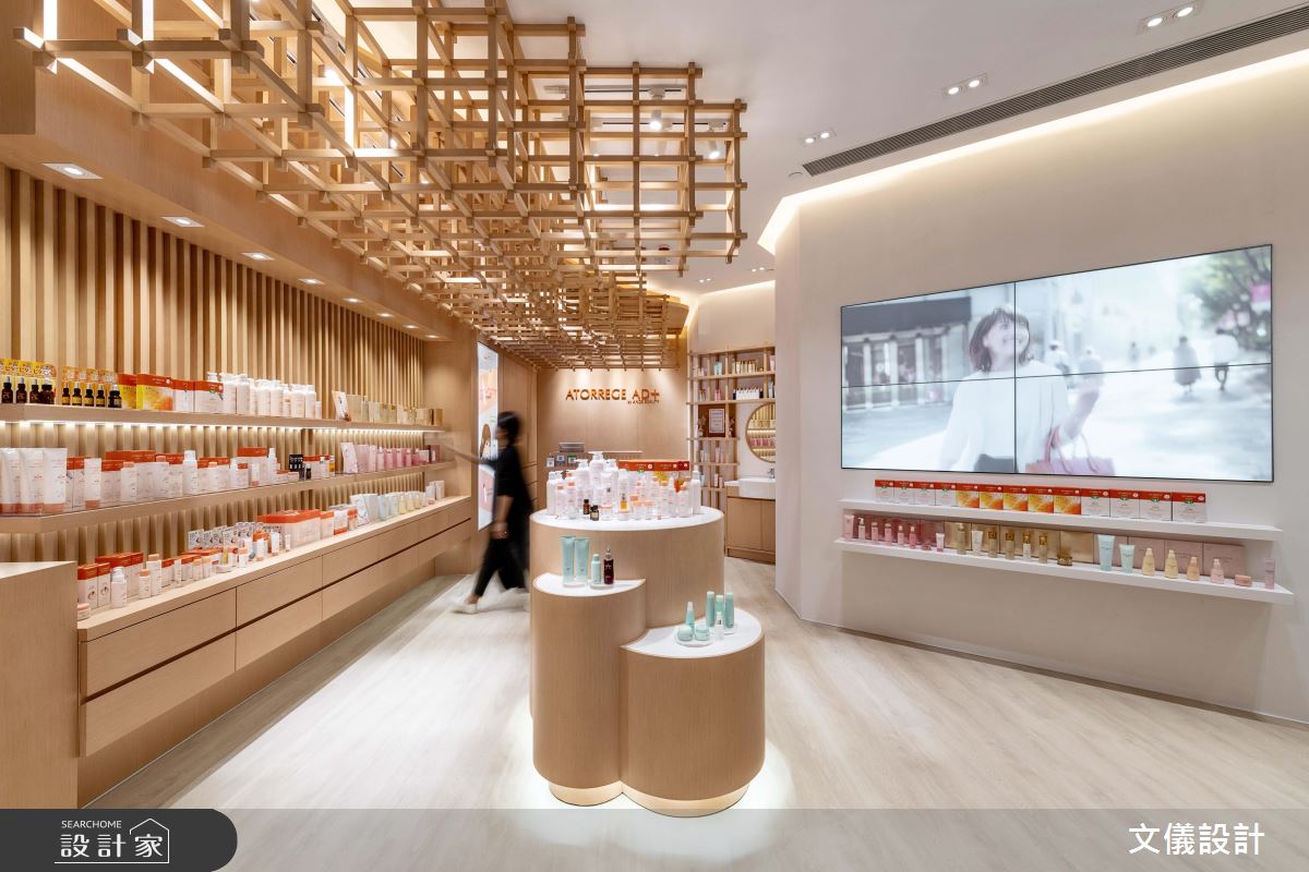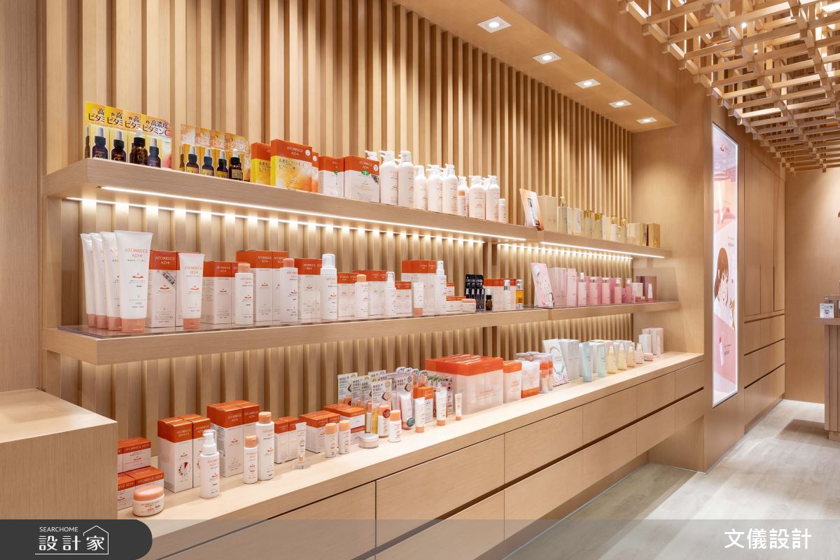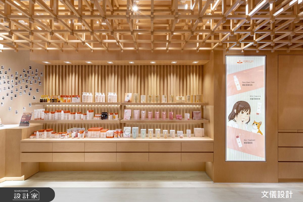 整體運用木格柵的跳躍性,象徵香港的律動感與日系的豐沛感,搭配燈光撒下的光感層次,營造出有如日式傳統建物的自然溫度; 同時依循曲折的空間向度,用純白的牆線稀釋曲折的衝突,結合櫃台的大面積溫潤木質調,做出適度轉折,並連結大片展示區,清晰羅列每一道商品項目;同時打造圓形平台,以柔軟線條象徵女性的可愛俏皮。在同一空間內,讓三種展示形式共存表現,詮釋出簡樸、自信與俏皮的女性特質概念!