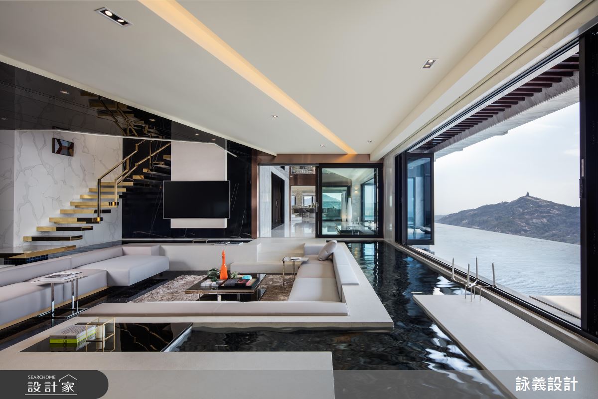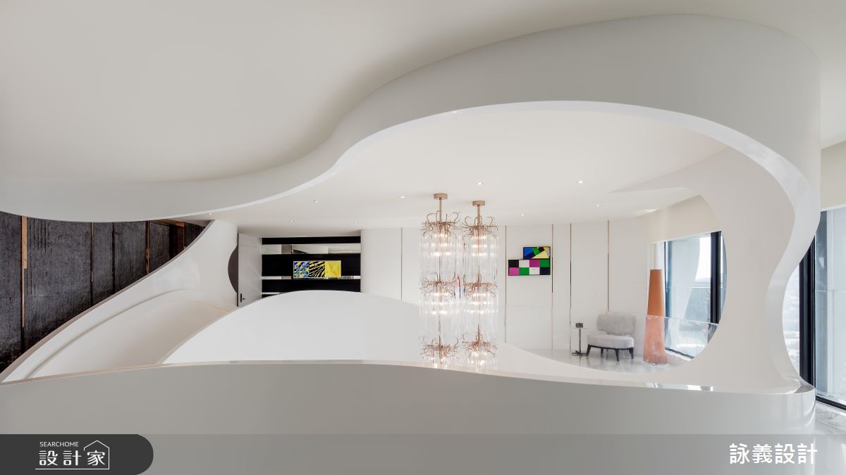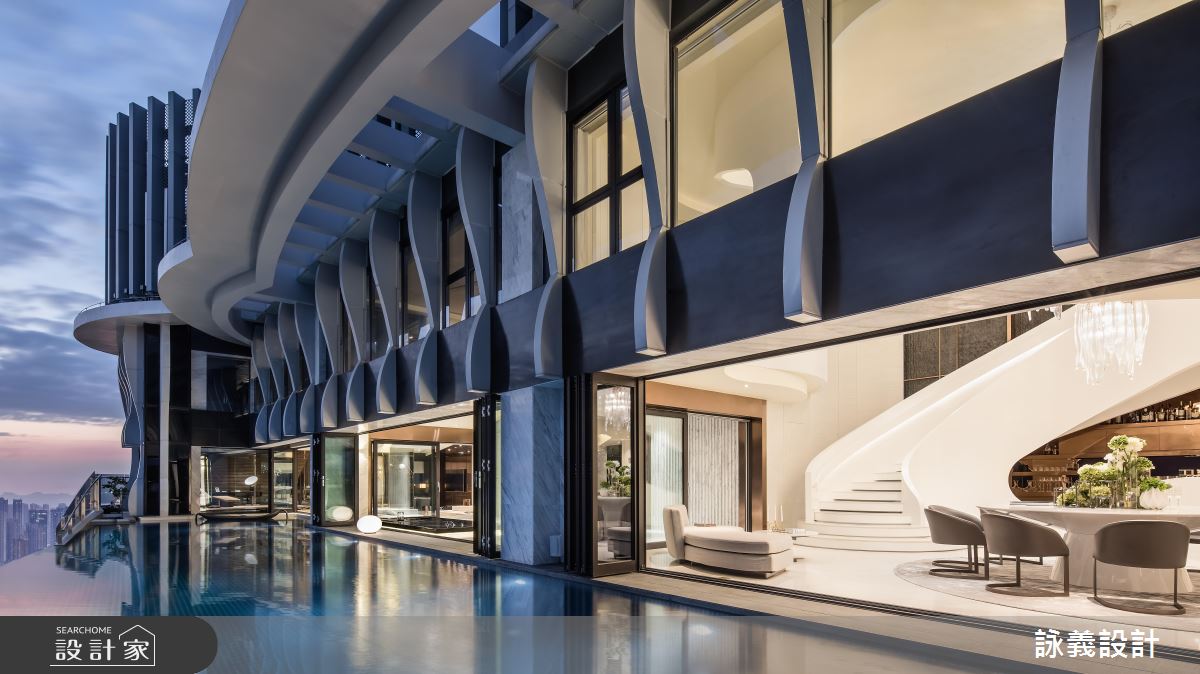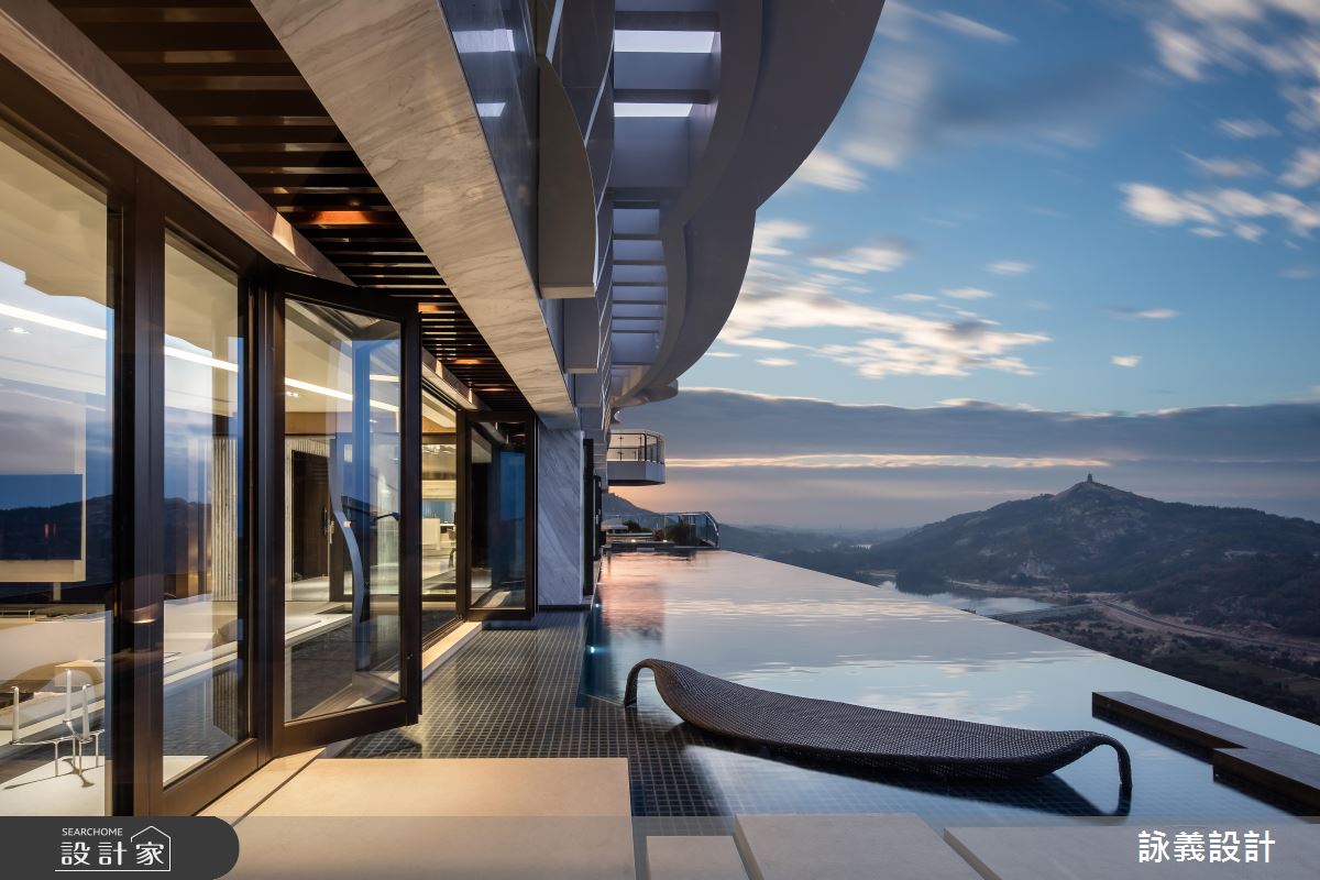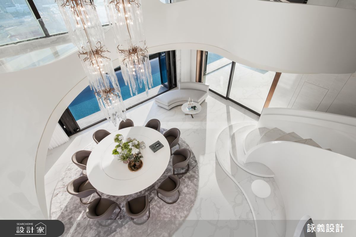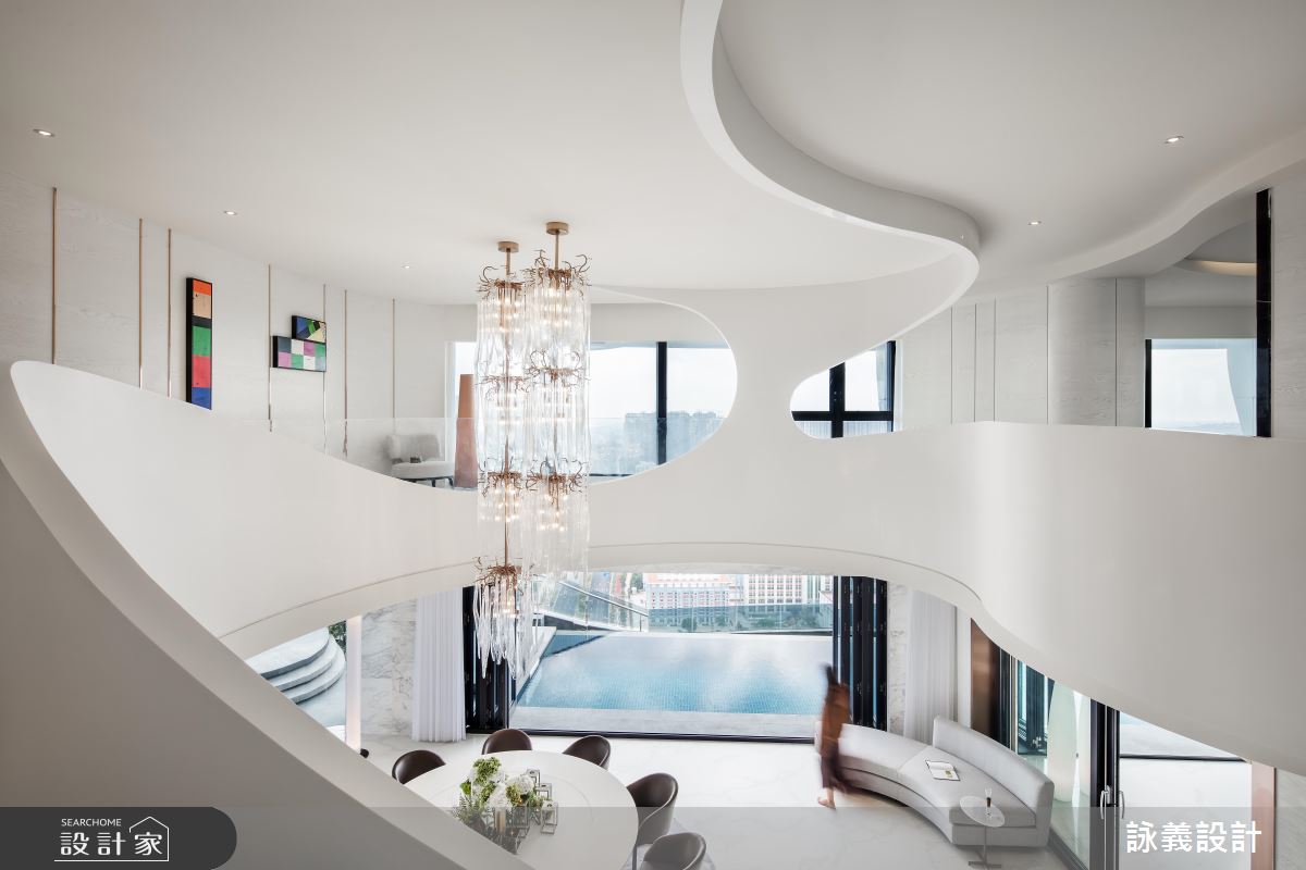 為了打破內外界限,讓自然融入生活場域,藉由外部的無邊際泳池,與下沉式客廳休息區的銜接,融化內外的空間分別,加上天花板以傾斜角度安排、局部貼附鏡面,隨著微風輕拂水面產生的陣陣漣漪,讓雲海、天光與水岸的美景無限滲透到室內空間裡,拍打出一波波的自然韻律,讓人享受靜謐的美好時光。餐廳場域裡,更是絕倫美煥,純淨、流線形的白色階梯扶手彷彿絲帶般,隨著舞者揮動而迴轉直上,幻化作空間的圍牆與天花板的藝術造型,穿梭在低調典雅的餐桌椅擺設、大理石地坪、金屬材質的家飾與華美的水晶吊燈,錯落有致的視覺呈現,替室內注入豐富的美學靈感,讓置身空間裡的人們都倍感高雅。